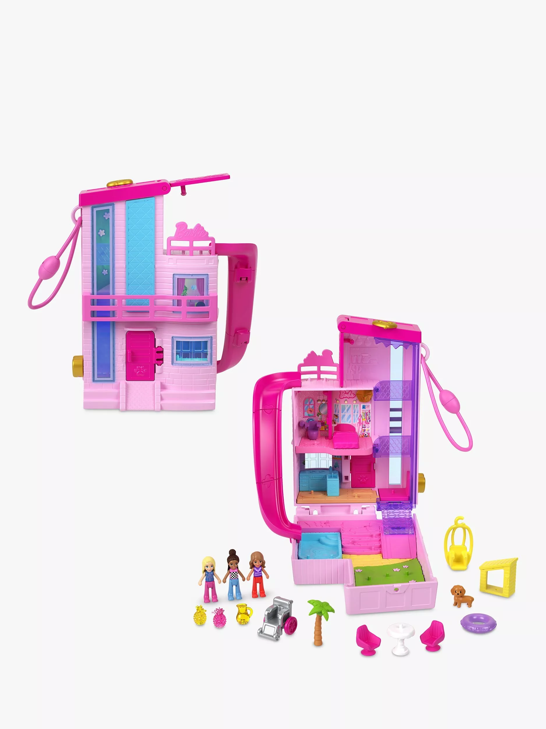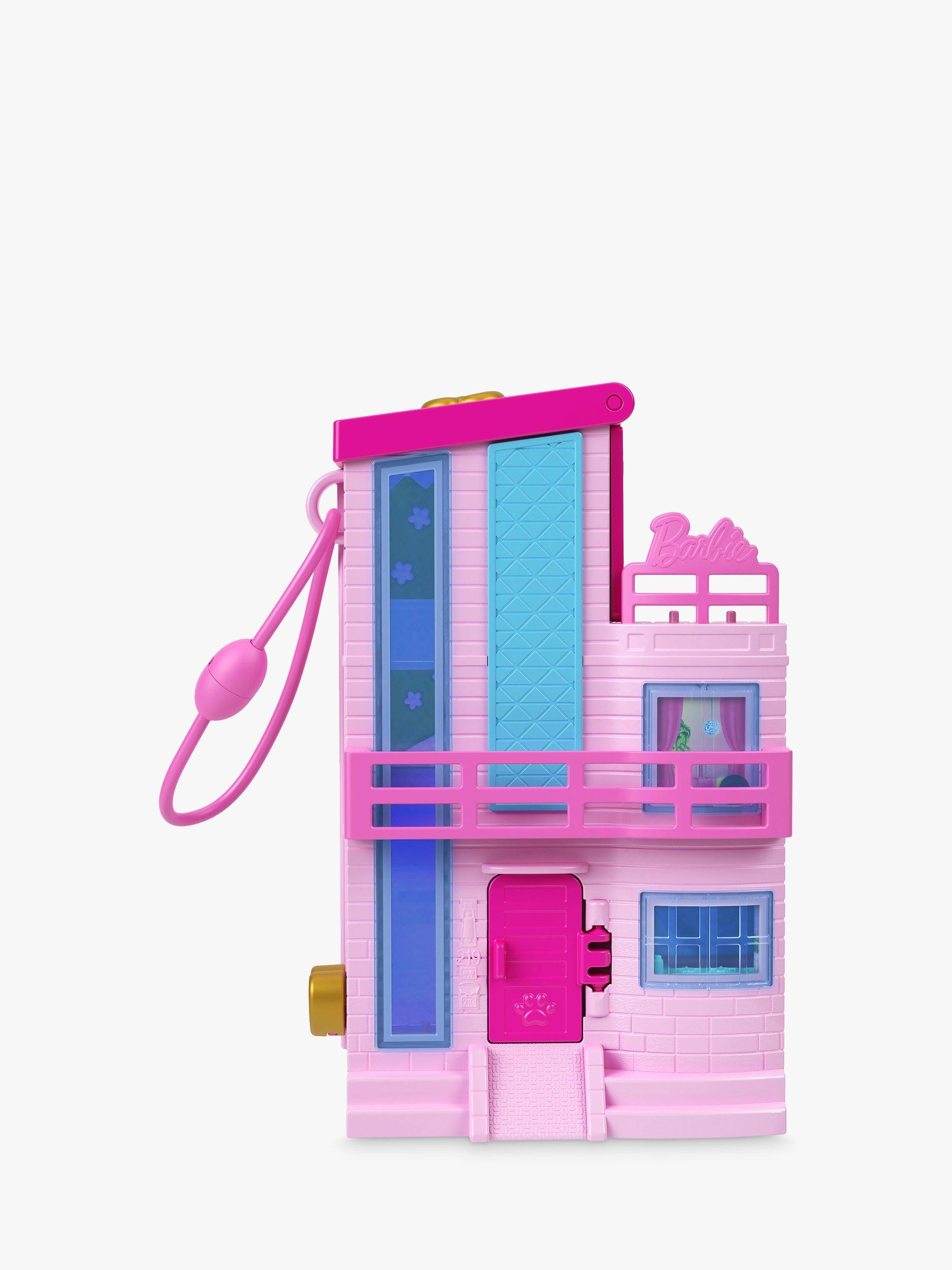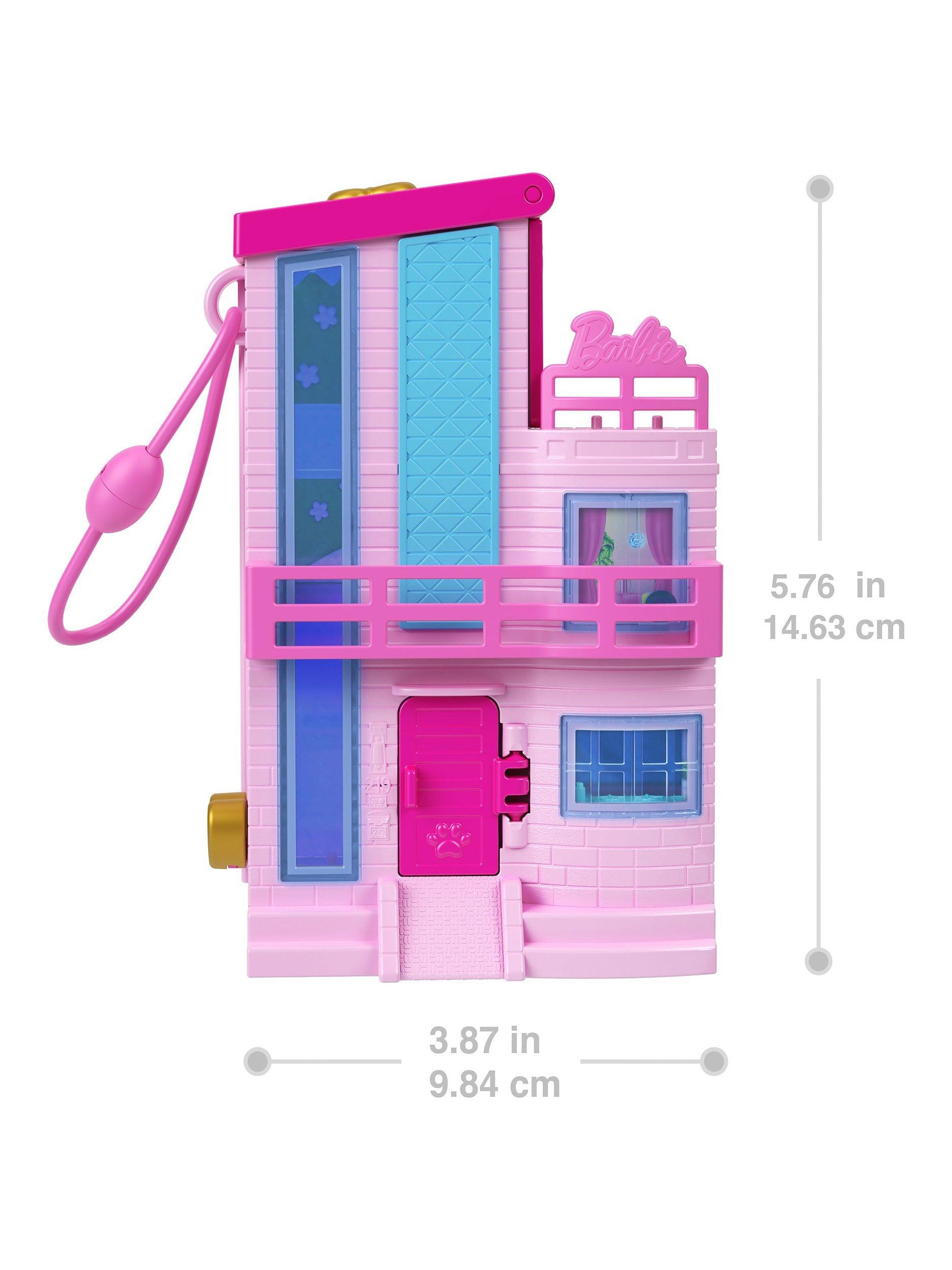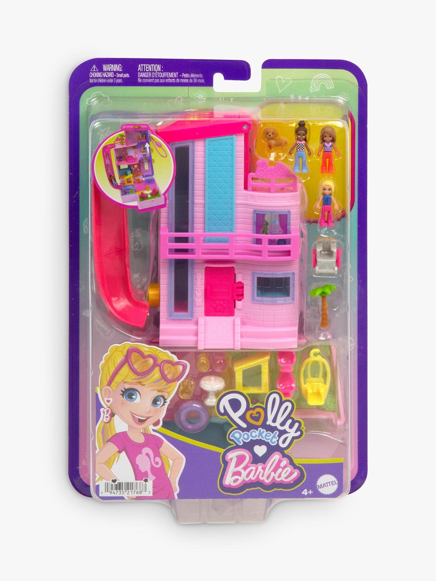 The Polly Pocket Barbie Compact playset resembles the iconic Barbie Dreamhouse in micro Polly Pocket form. There are three stories inside as well as an outdoor play space and an elevator to take Barbie and two friends from floor to floor.