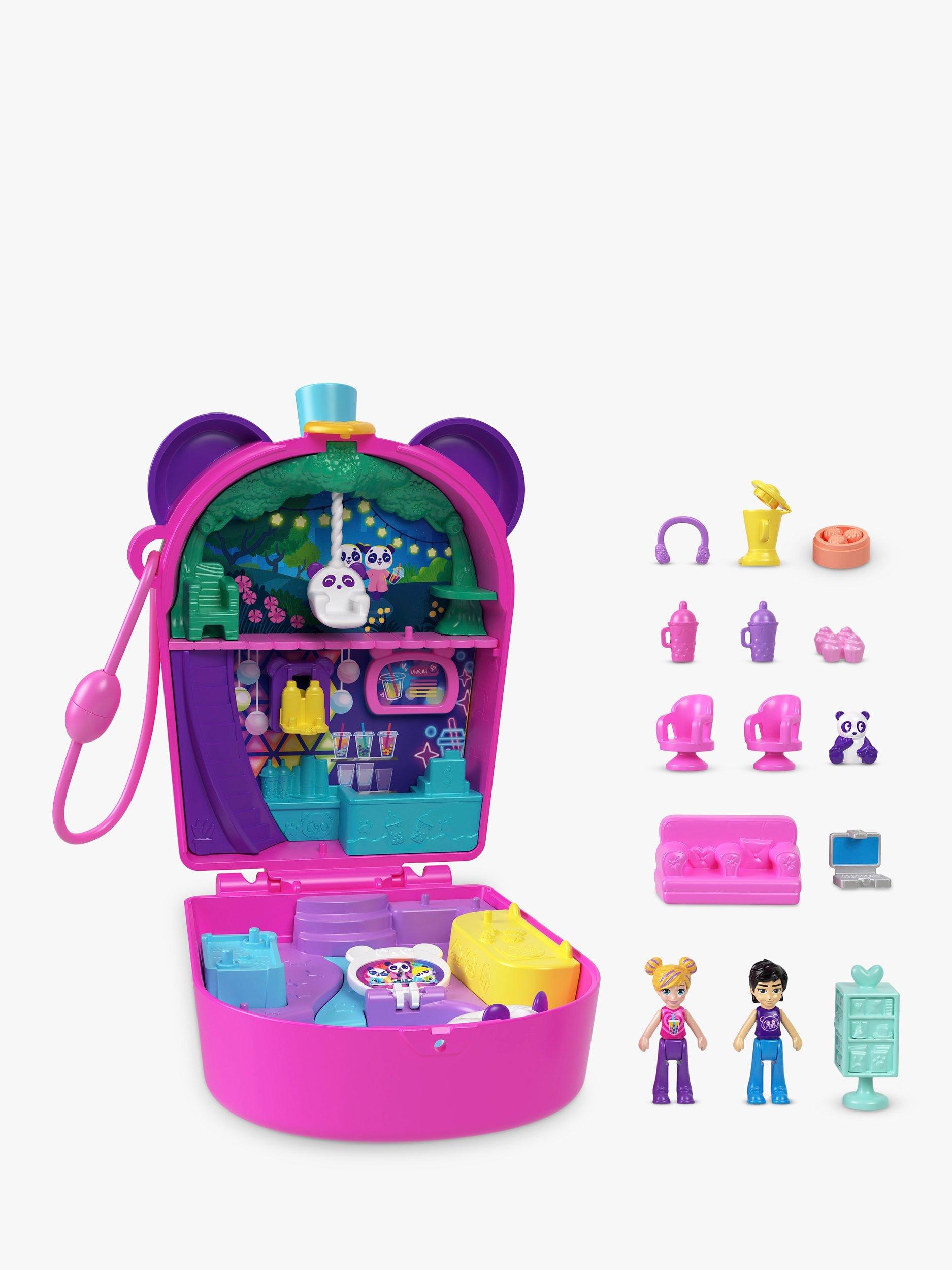 This adorable Polly Pocket Bubble Tea Panda is shaped like a panda boba drink with a fun boba ball shaker feature! Open the compact to discover an awesome bubble tea shop with two micro dolls and 12 accessories, including one pet panda.