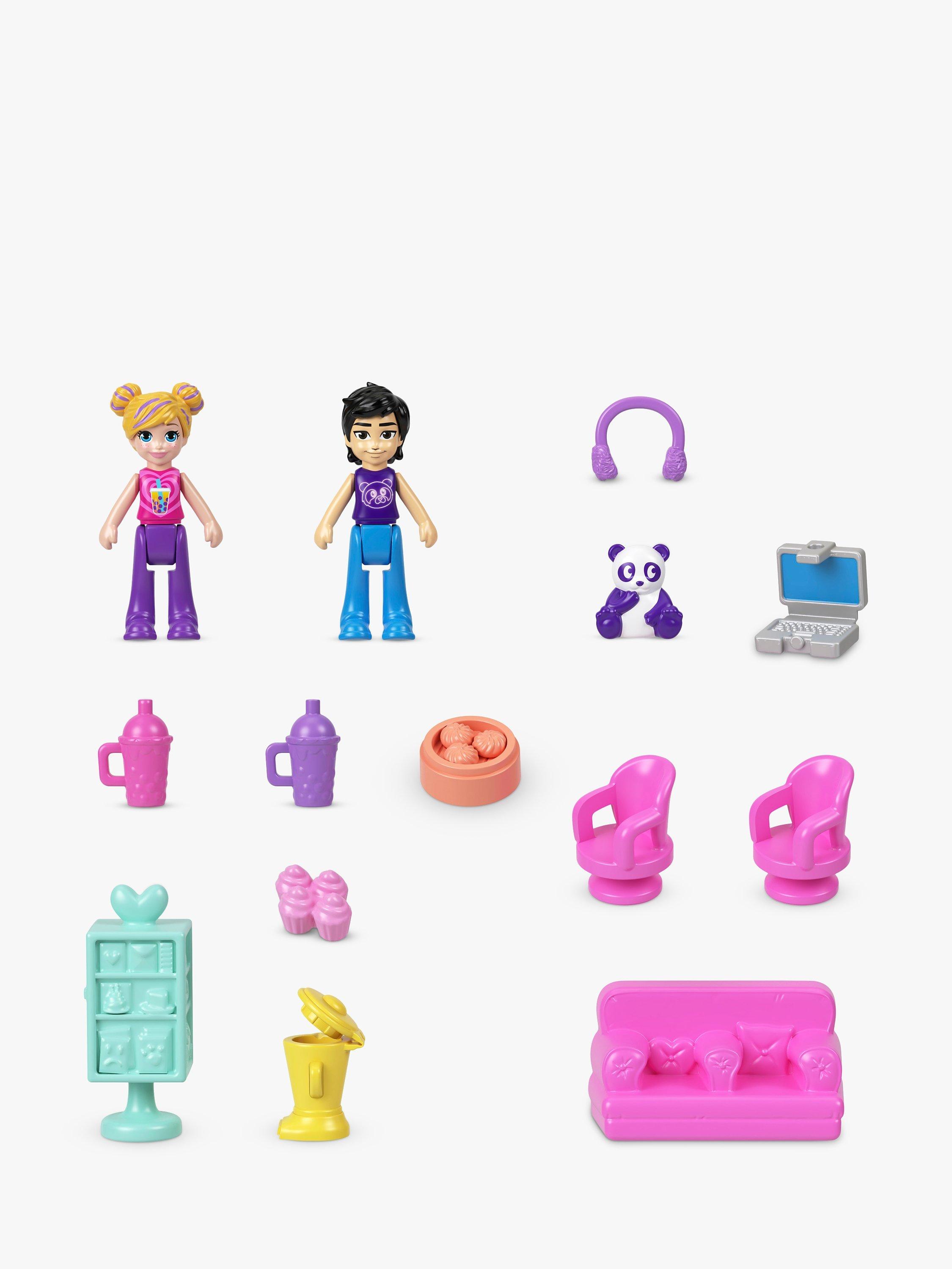 Polly doll loves to make fresh tea for friends at the drink station. Sit back, relax, and sip boba tea on the panda swing that moves back and forth. Watch shows with pet panda on the cosy loveseat. The coffee table converts into a television! It's the perfect hangout spot. When it's time to leave, pack it up for on-the-go fun.