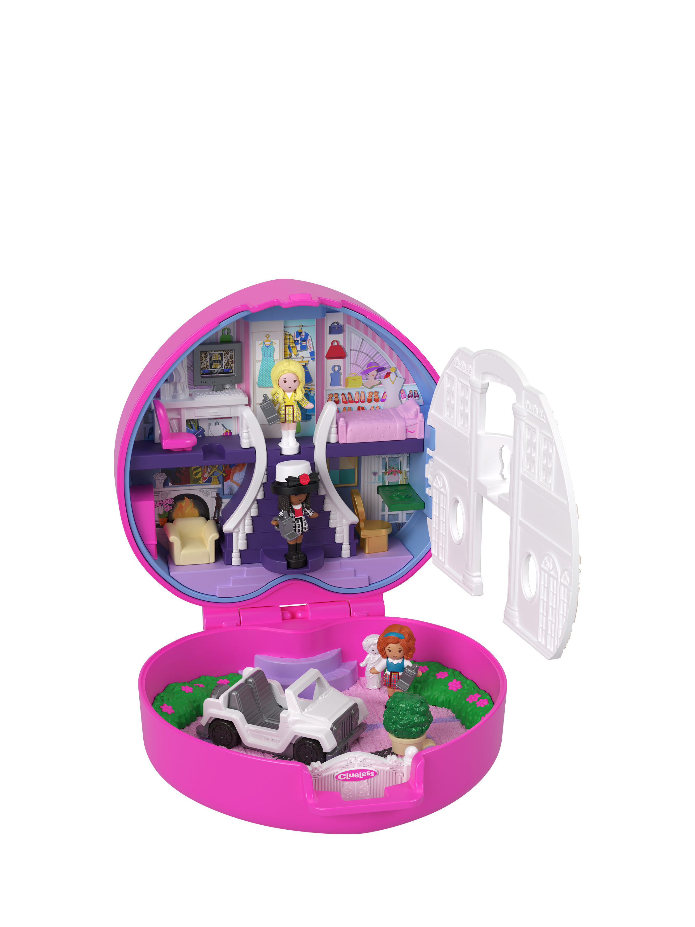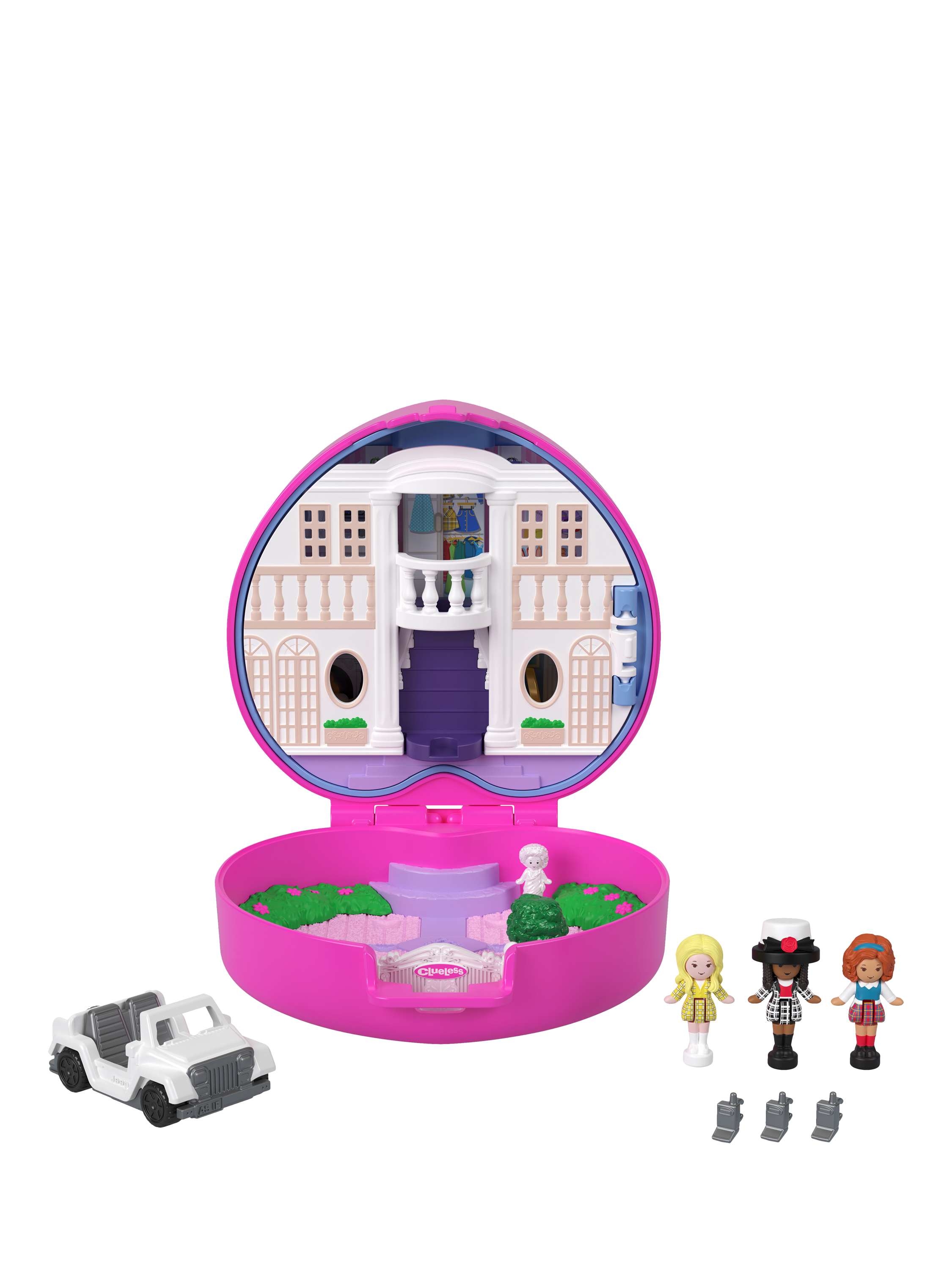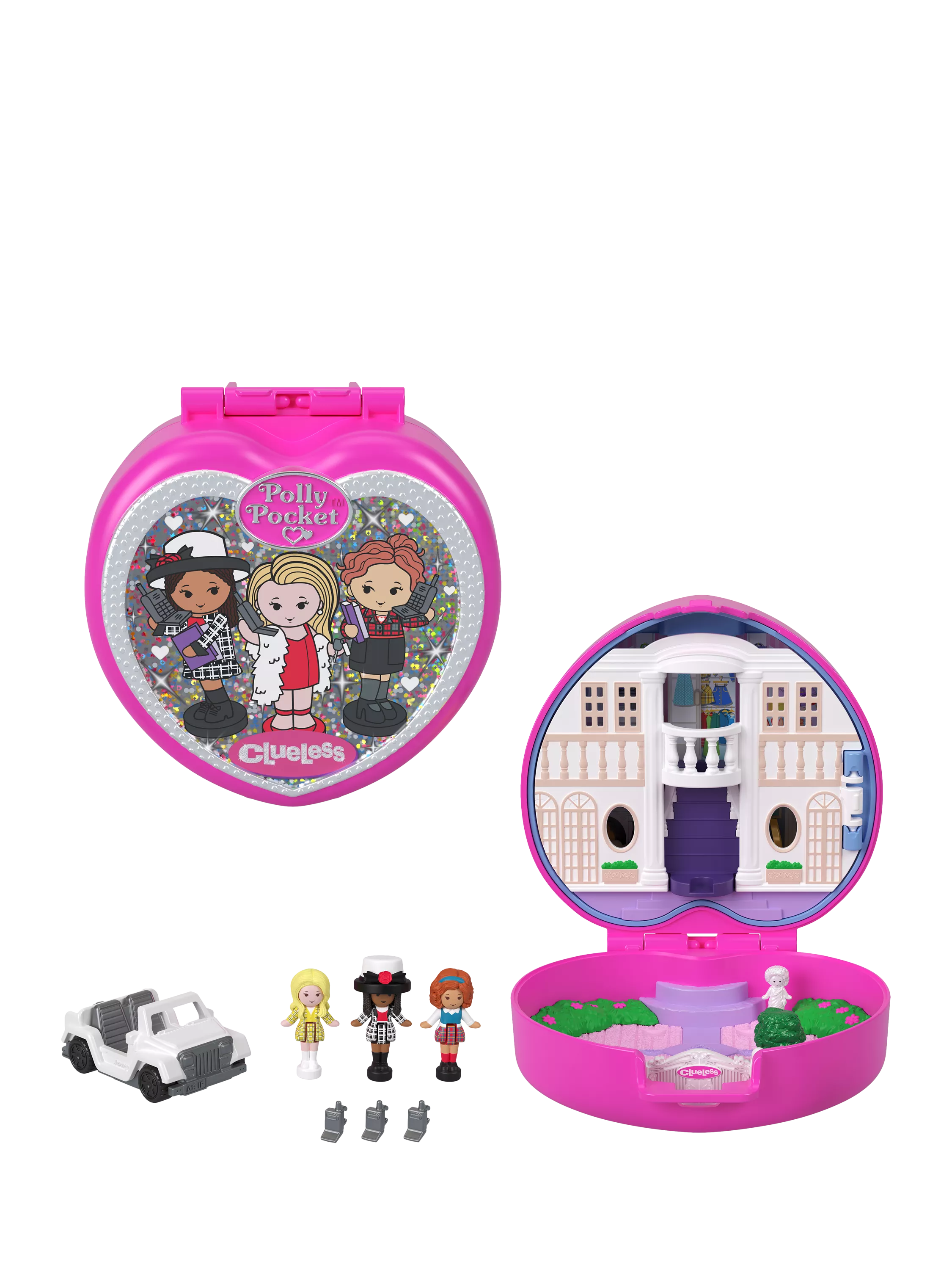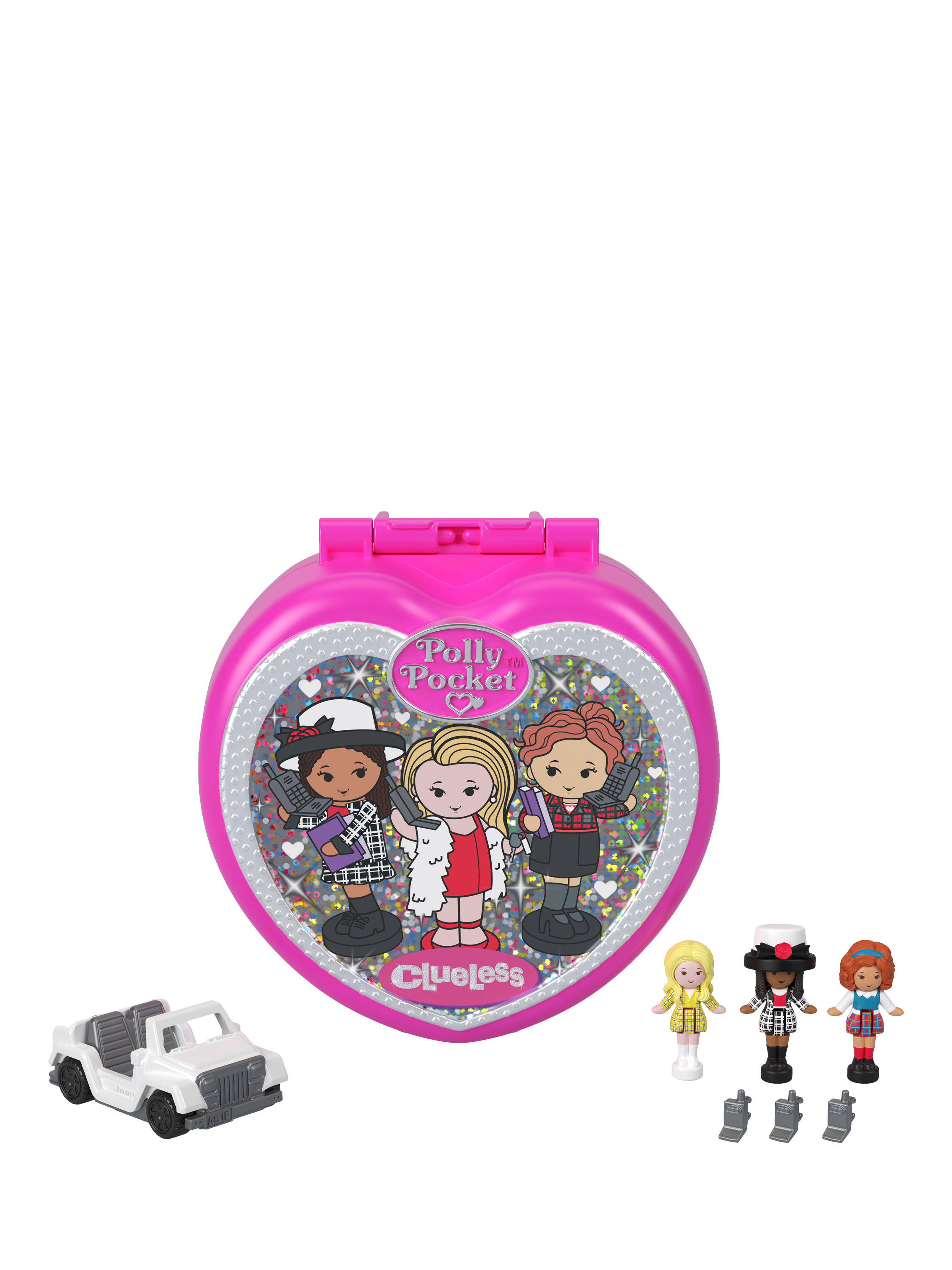 Ugh, as if! Clueless goes tiny with Polly Pocket in this iconic collaboration compact. The compact's heart-shaped exterior features a portrait of the three dolls: Cher, Dionne and Tai, with sparkling details that celebrate the partnership, for the 30th anniversary of Clueless.