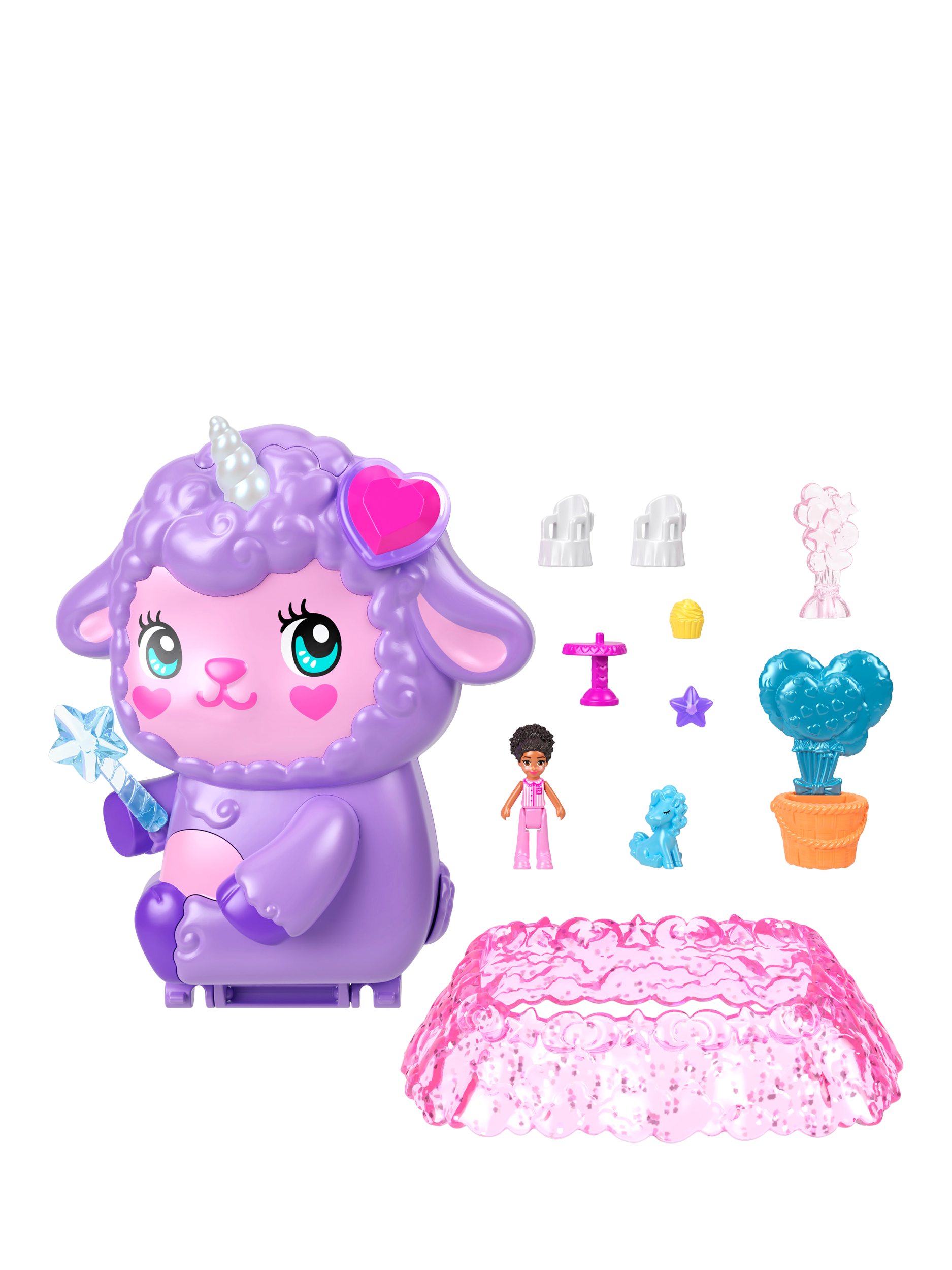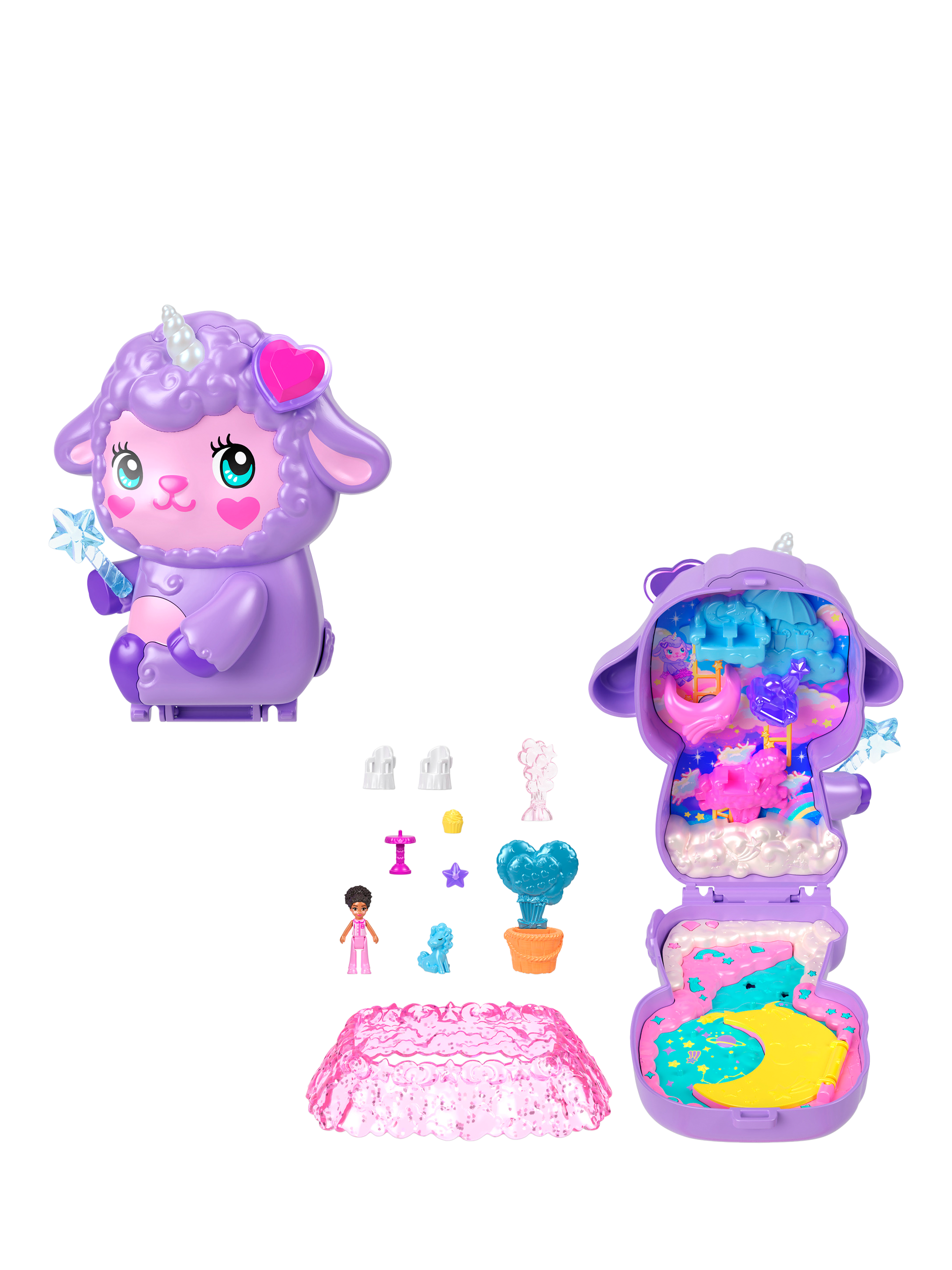 This adorable Polly Pocket Cozy Dreamland Compact is shaped like a lamb with a fun dress-able exterior perfect for kids who love to express their unique fashion sense!