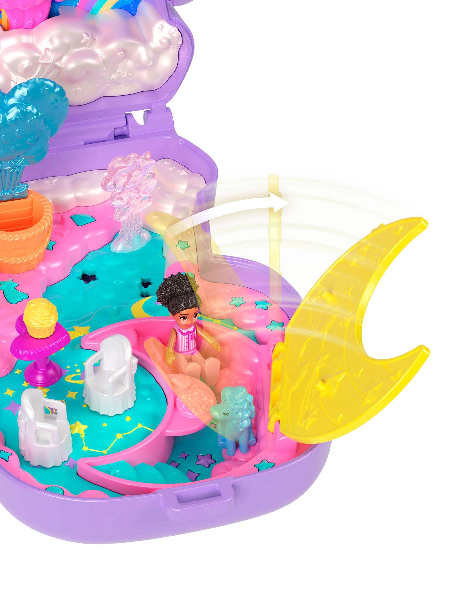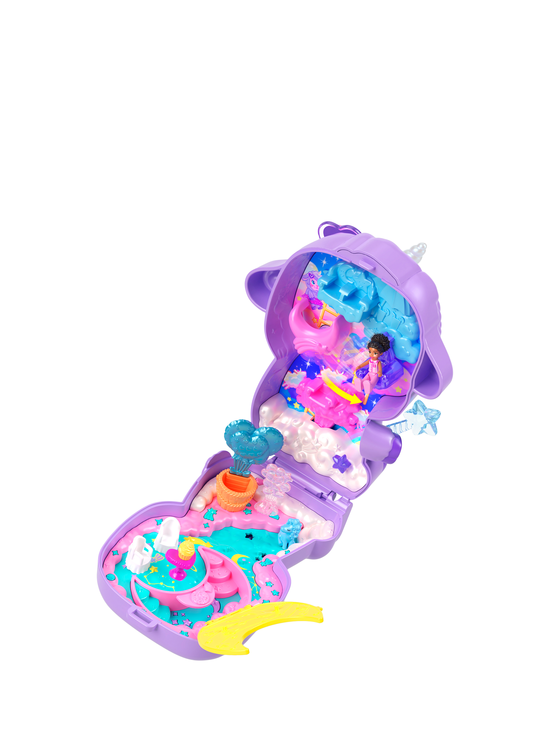 Open the playset to discover a fantasy world amongst the clouds with one micro doll and nine themed accessories, including one pet unicorn. Dolls love to sway back and forth on the cloud swing! Hangout in the lounge hidden behind the crescent moon or fly high in the hot air balloon. When it's time to run, pack it up for on-the-go fun! Ideal for ages four years old and up, especially those who love fantasy lands and animals. Colors and decorations may vary.