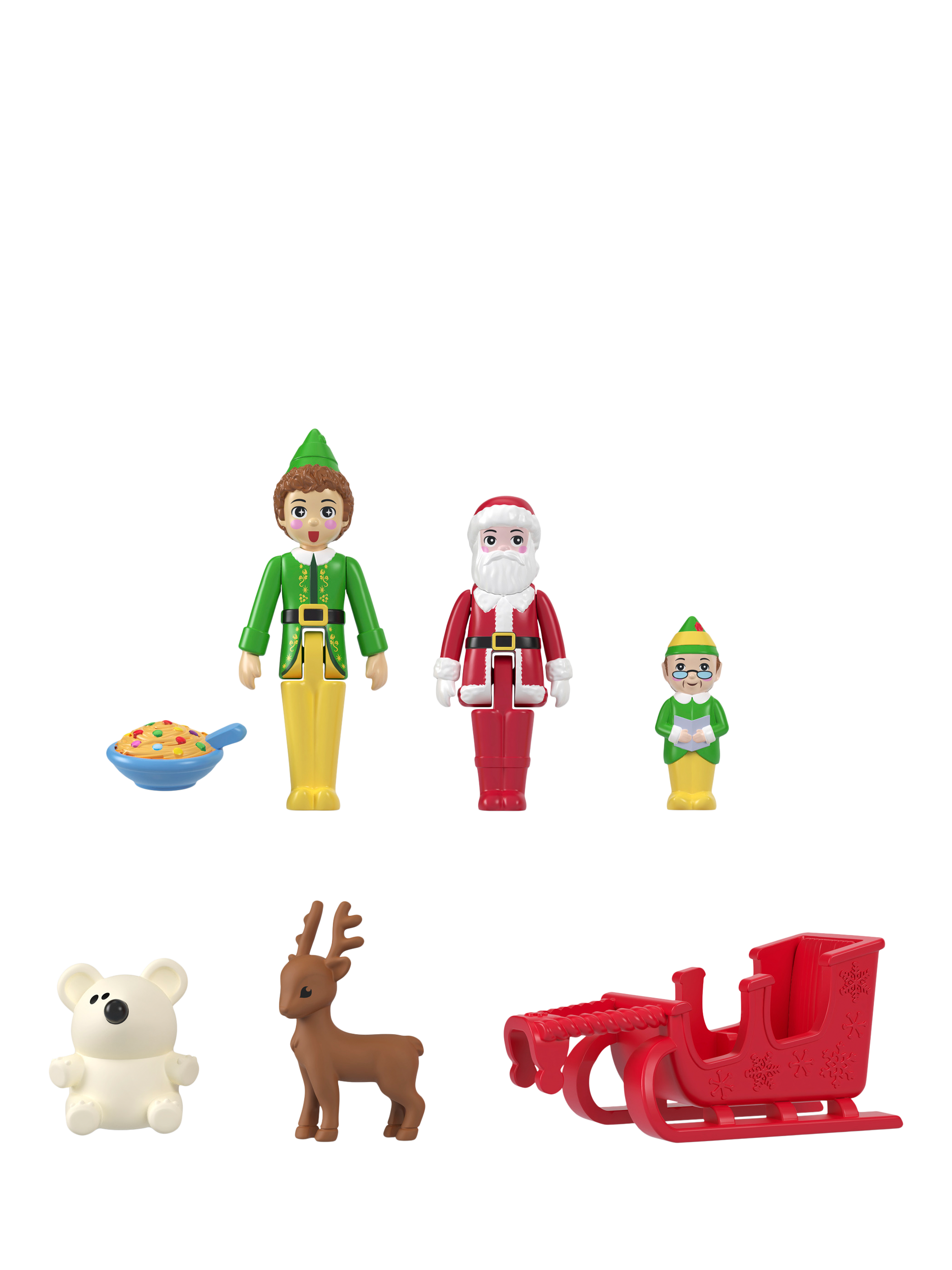 Treat every day like Christmas with a micro Buddy, Santa and Papa Elf doll. Open the door to the workshop and press on the stool to make a toy pop up. There's room for everyone on the Nice List, so open a present or enjoy a plate of Buddy's famous dessert spaghetti — yum!