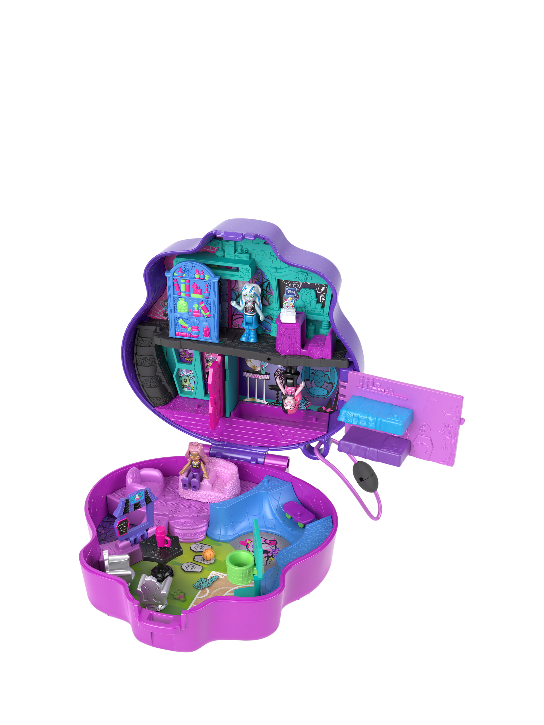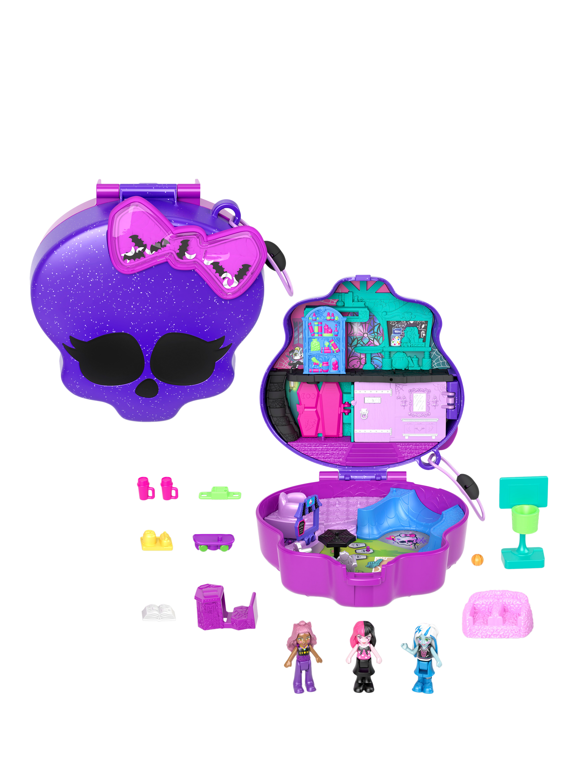 Fans' favourite ghouls go tiny in this Monster High x Polly Pocket collaboration compact! The iconic skullete exterior features a shaker bow filled with glitter bats and opens to reveal a spooktacular skatepark and high school.