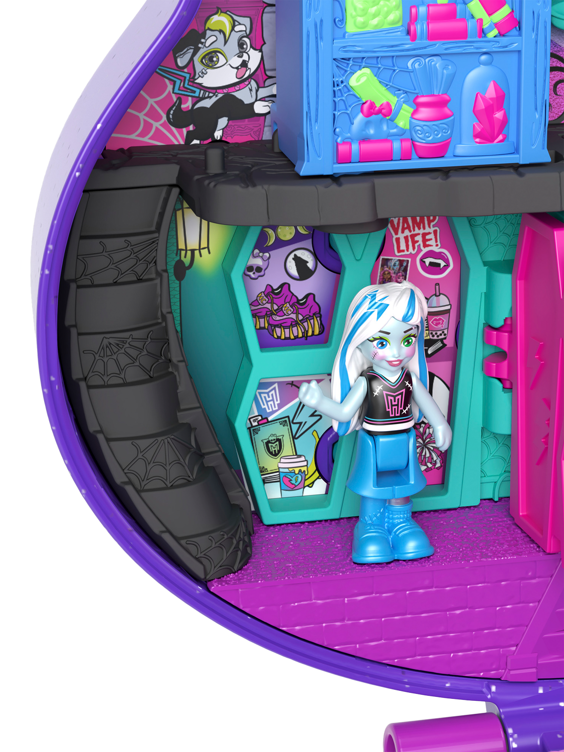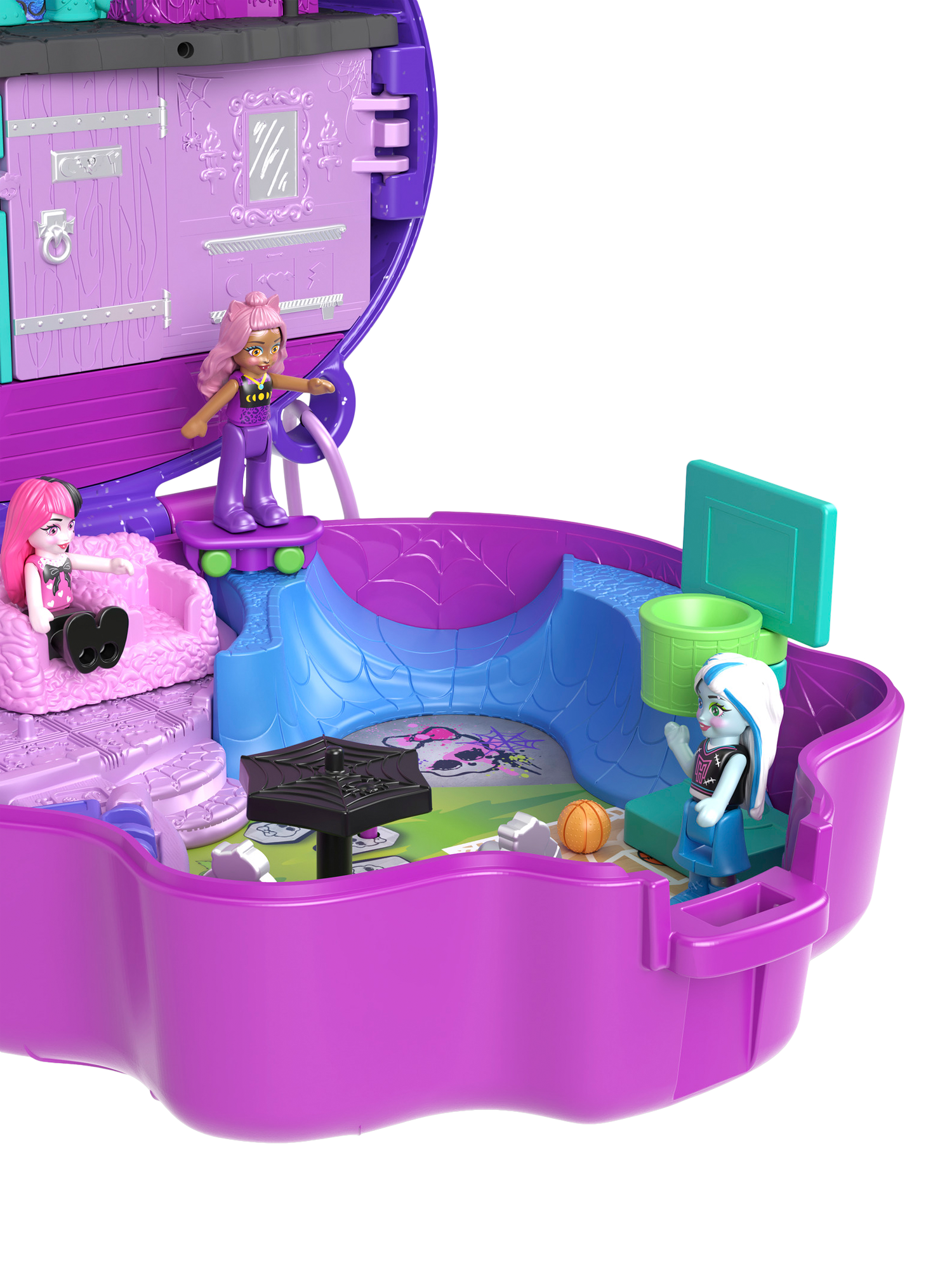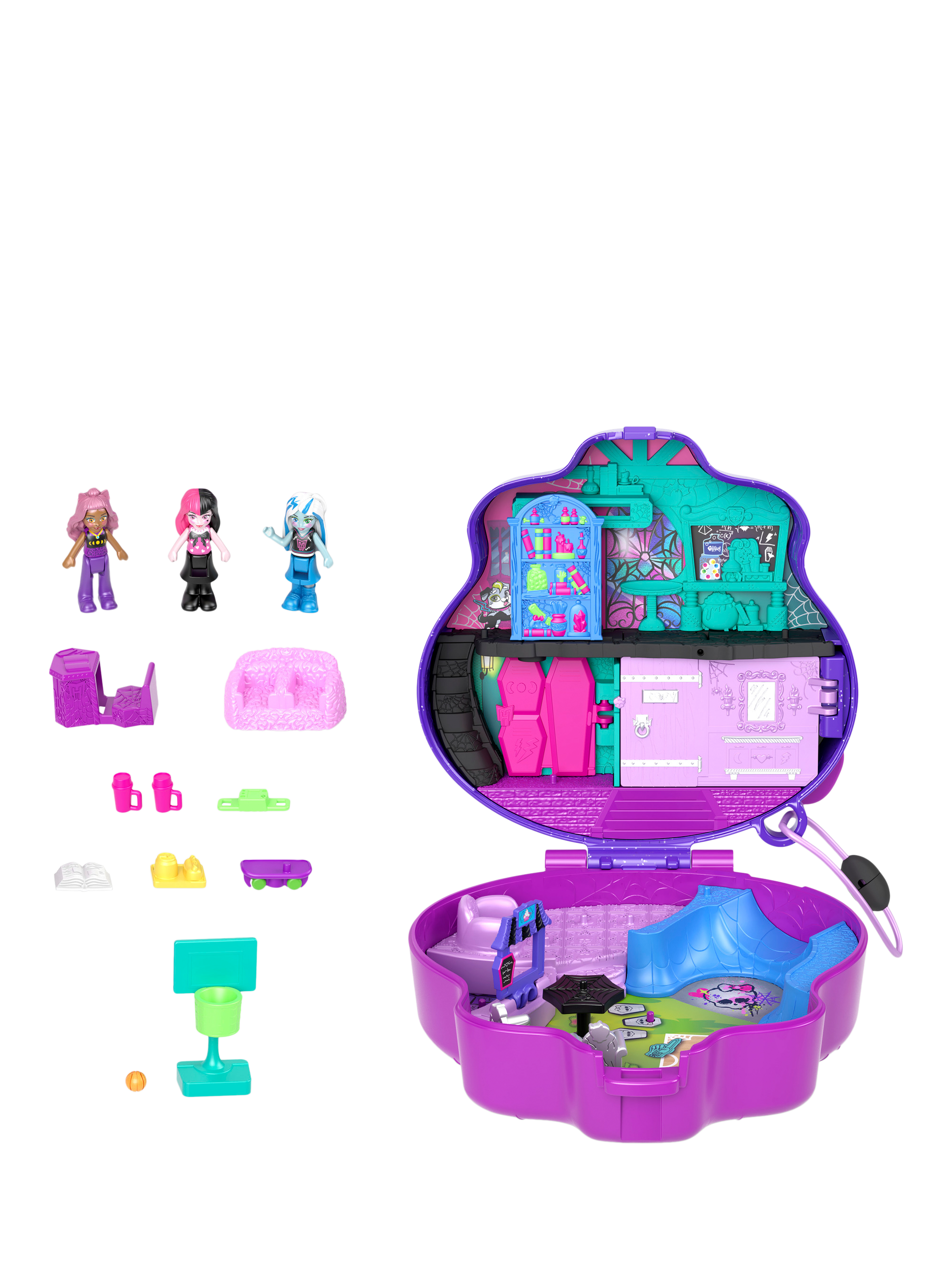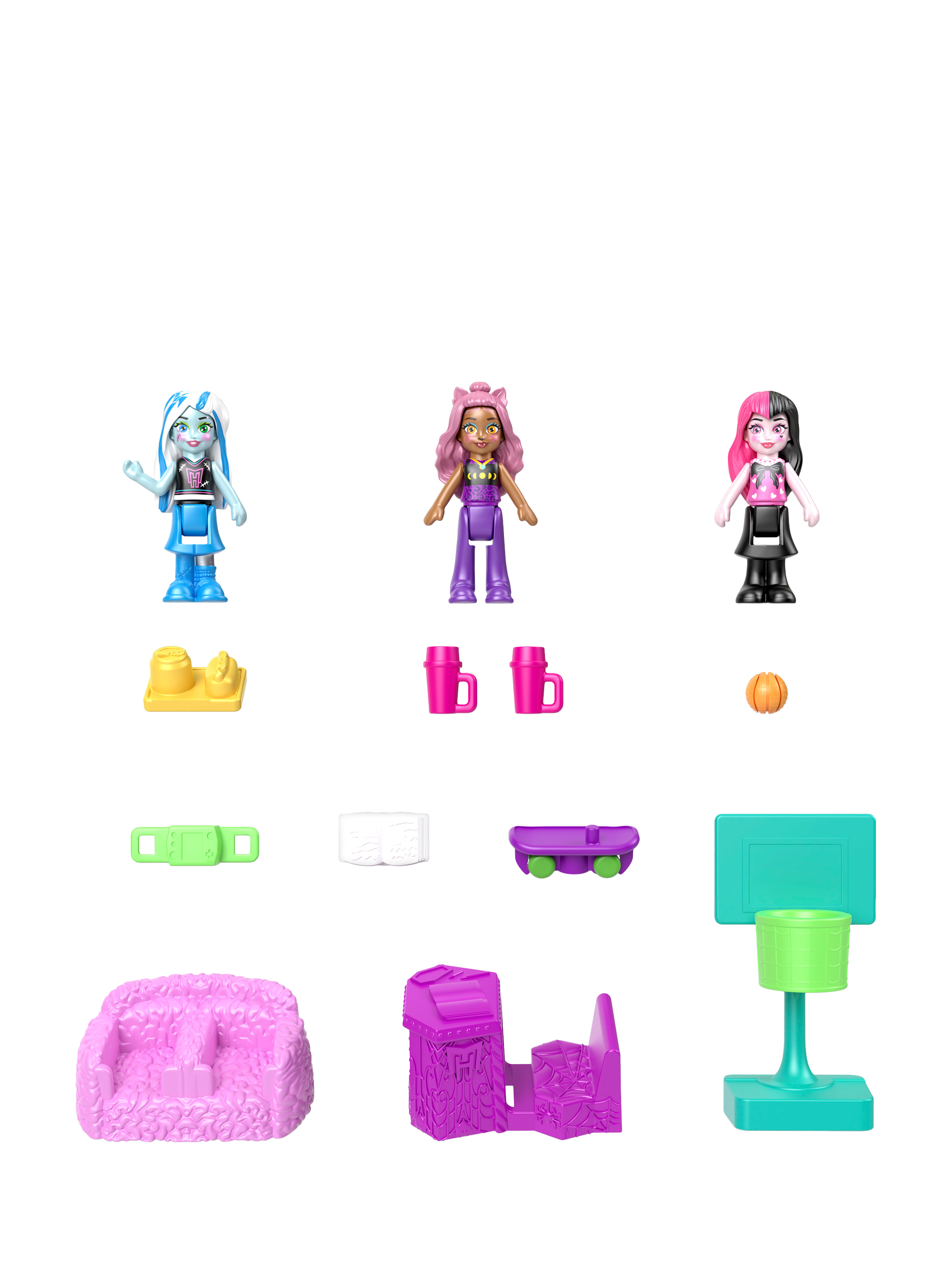 Scare up fun with three of Monster High's favourite ghouls: Draculaura, Clawdeen Wolf, and Frankie Stein in microform and 10 themed scare-cessories. Slide the bookcase to reveal a fangtastic surprise, show off some sick tricks in the skatepark, or play casket-ball with fellow ghouls!