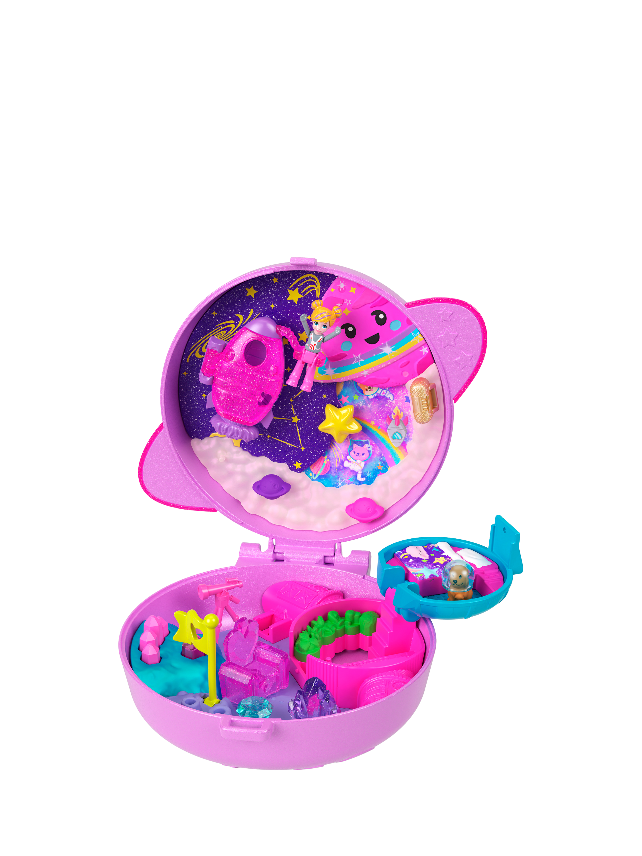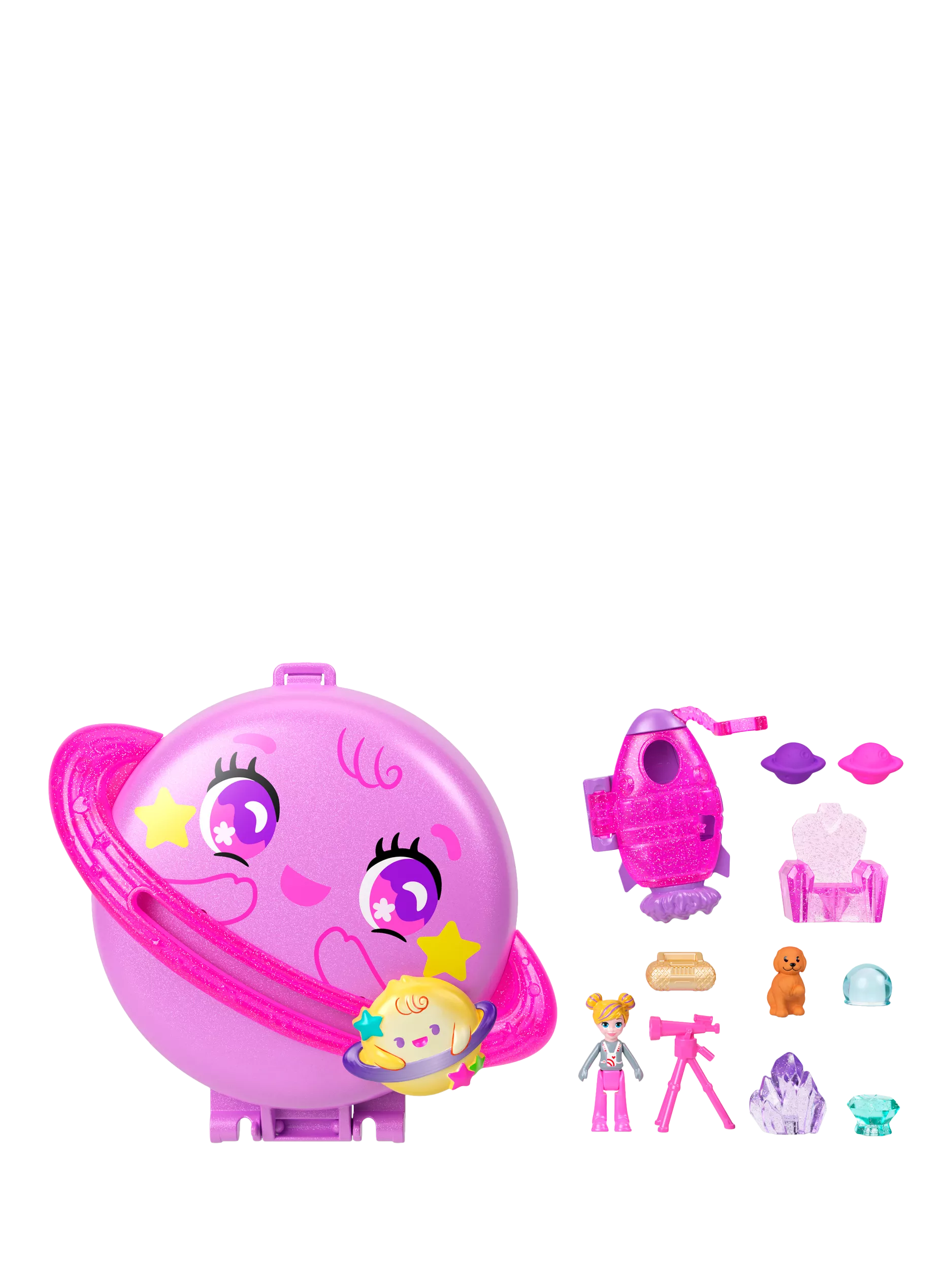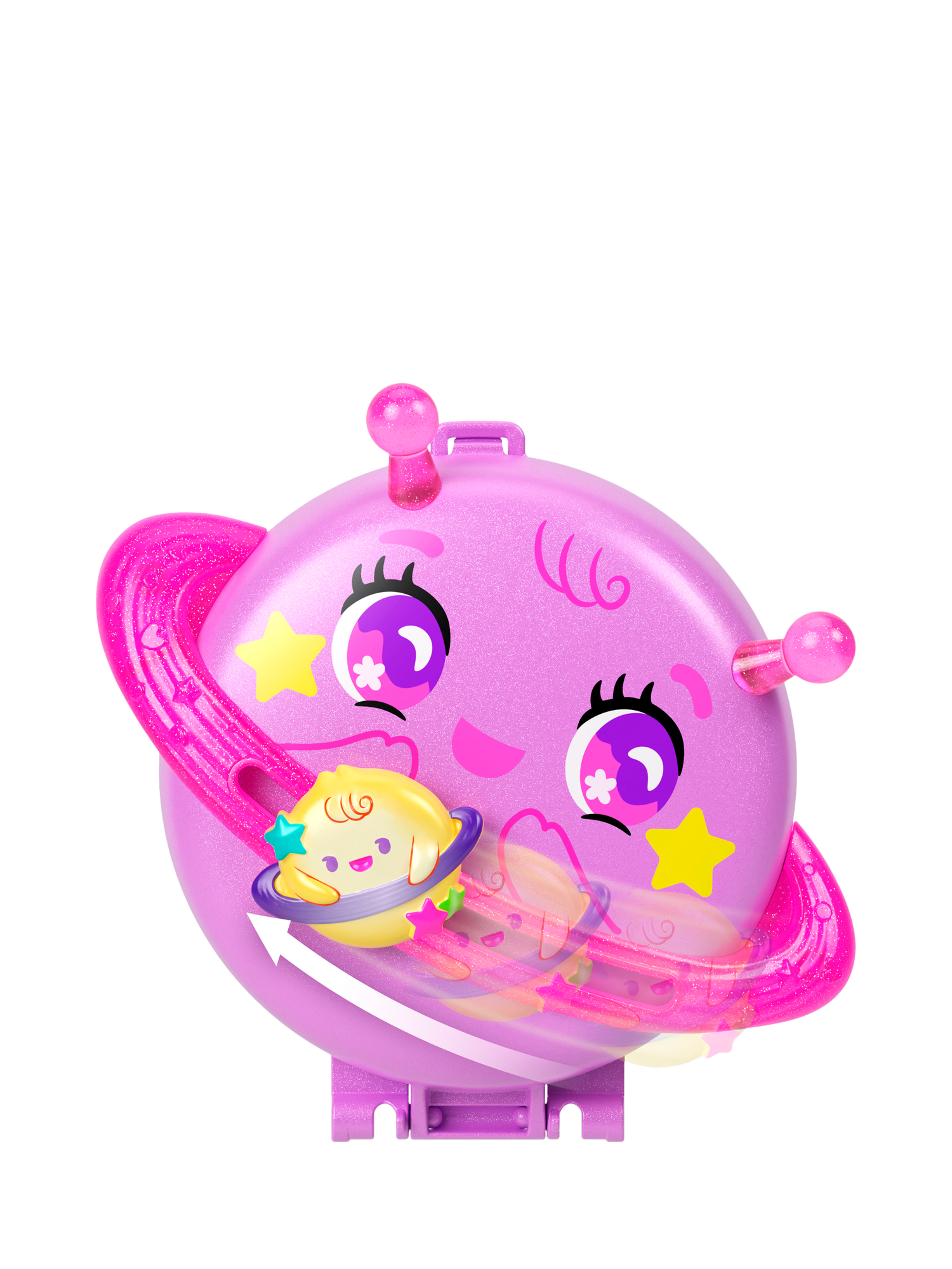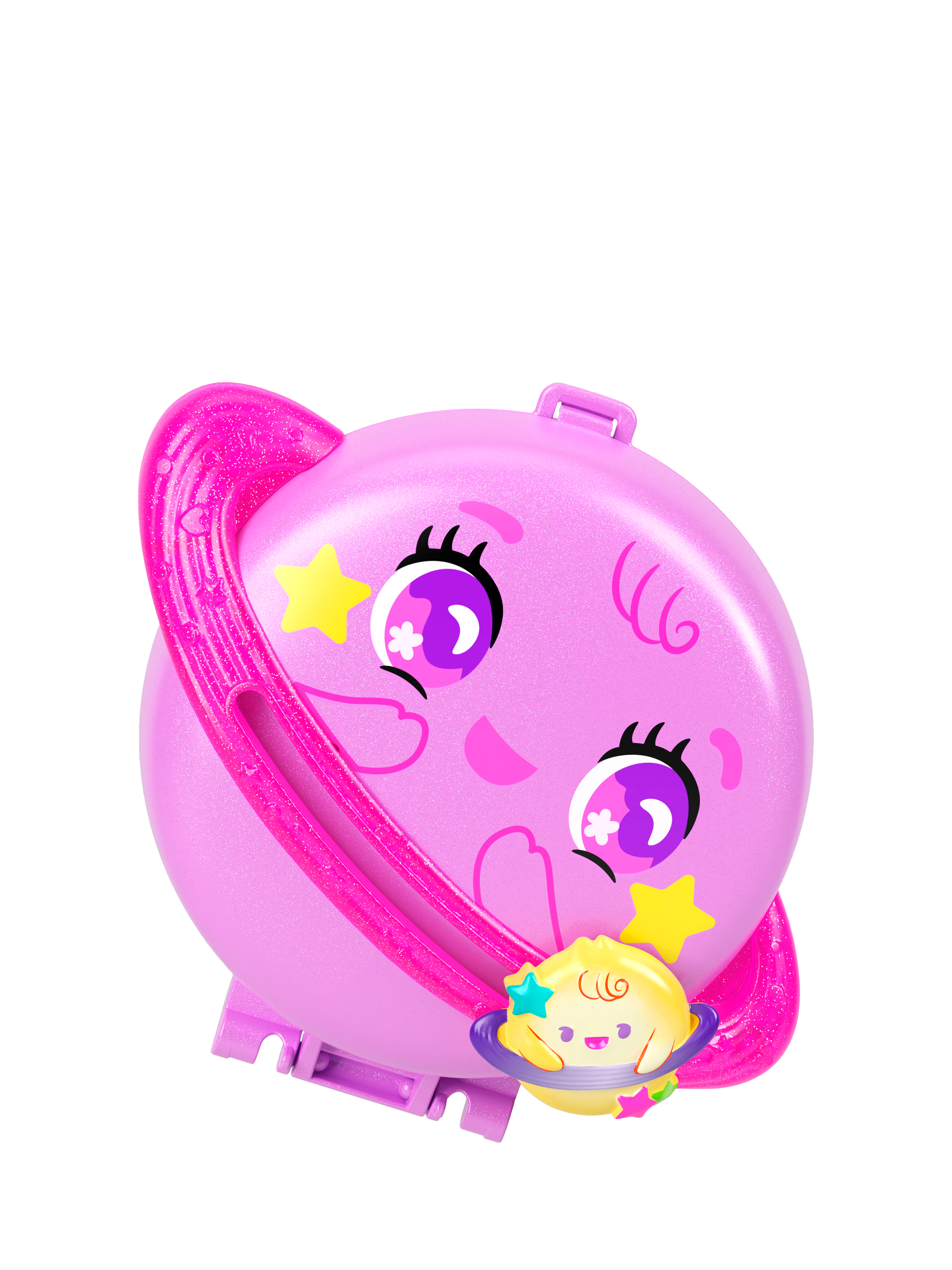 This Polly Pocket Planet Polly Compact is shaped like an adorable planet with a smaller planet that slides along the ring! Open the compact to discover an outer space adventure! Experience out of this world fun with one micro doll and 10 themed accessories, including one pet puppy!