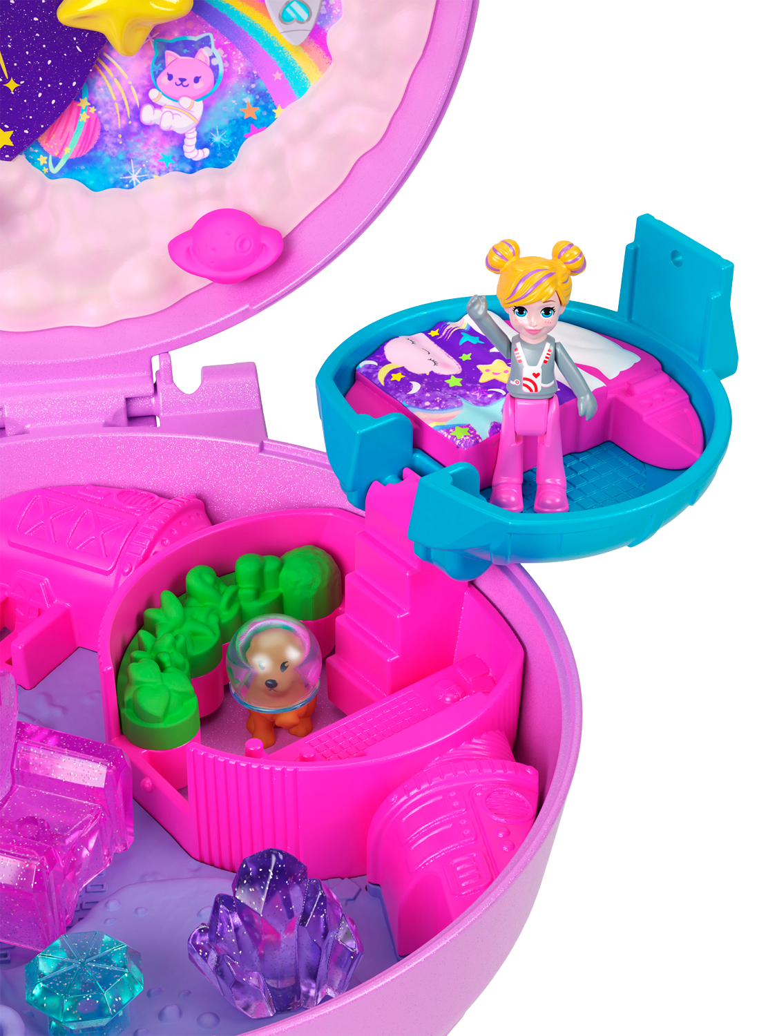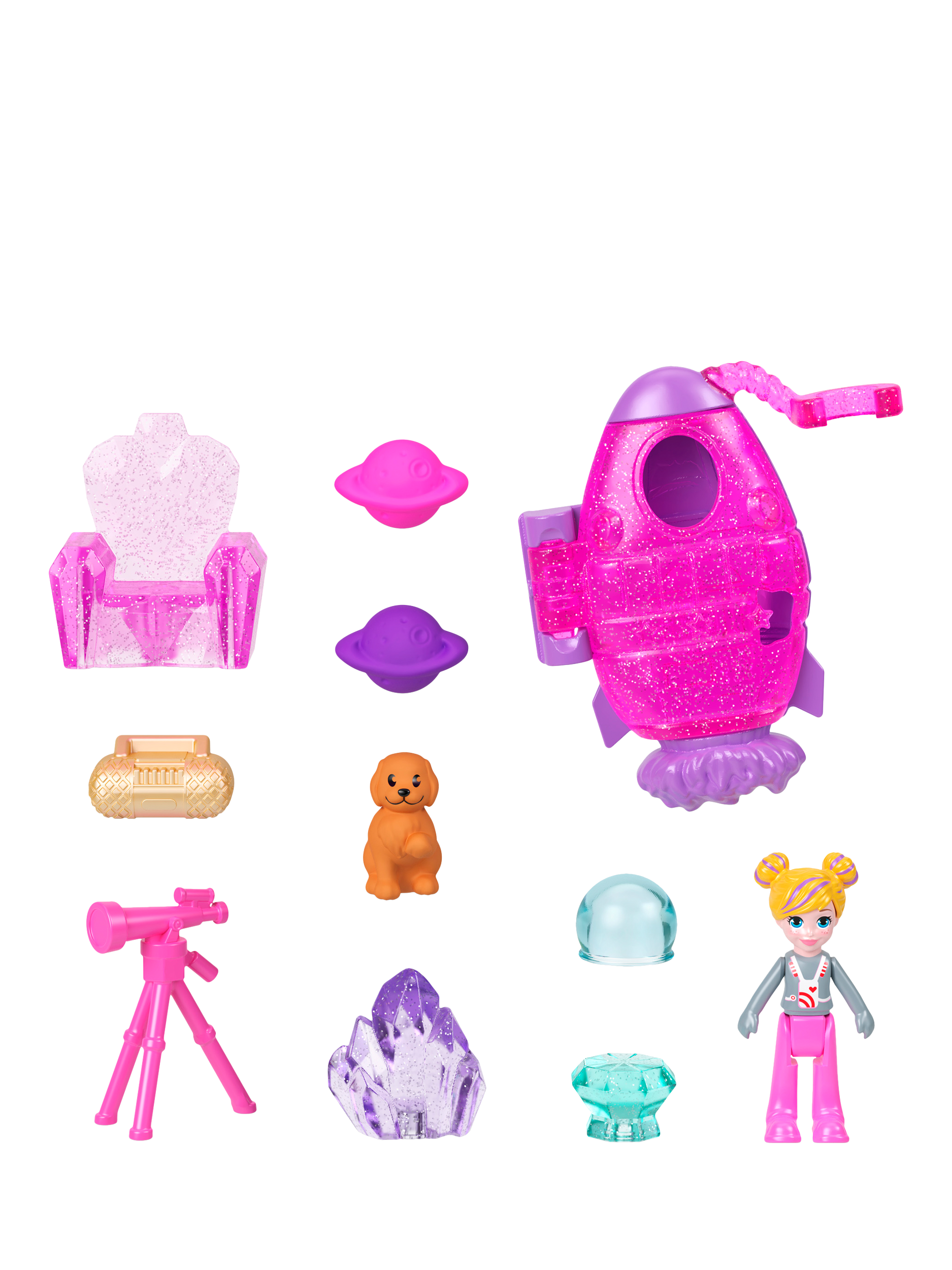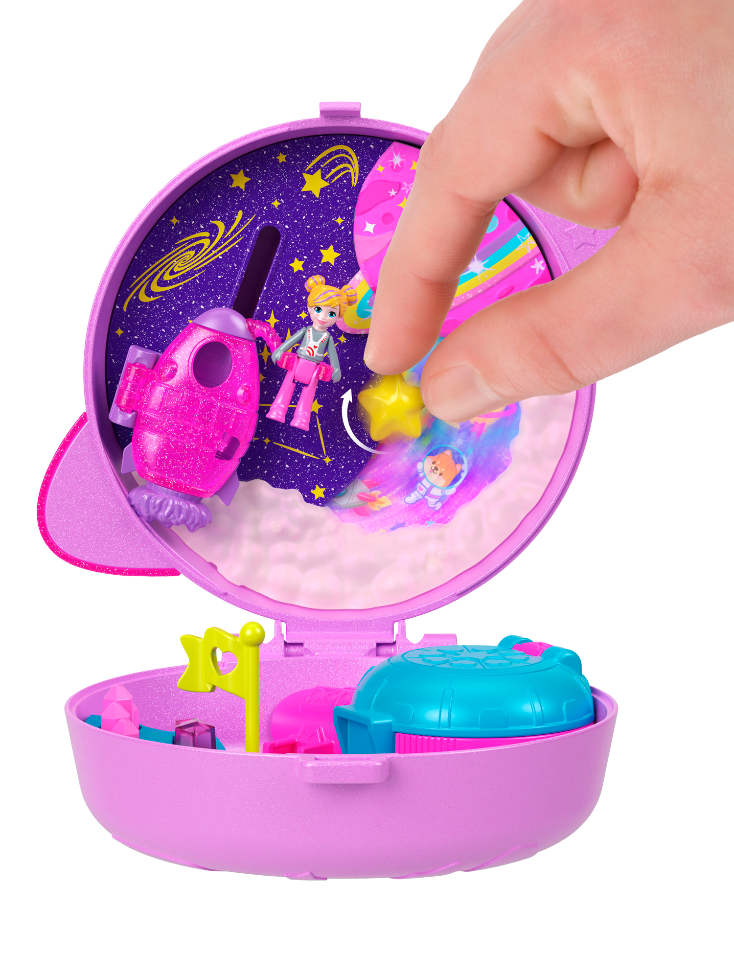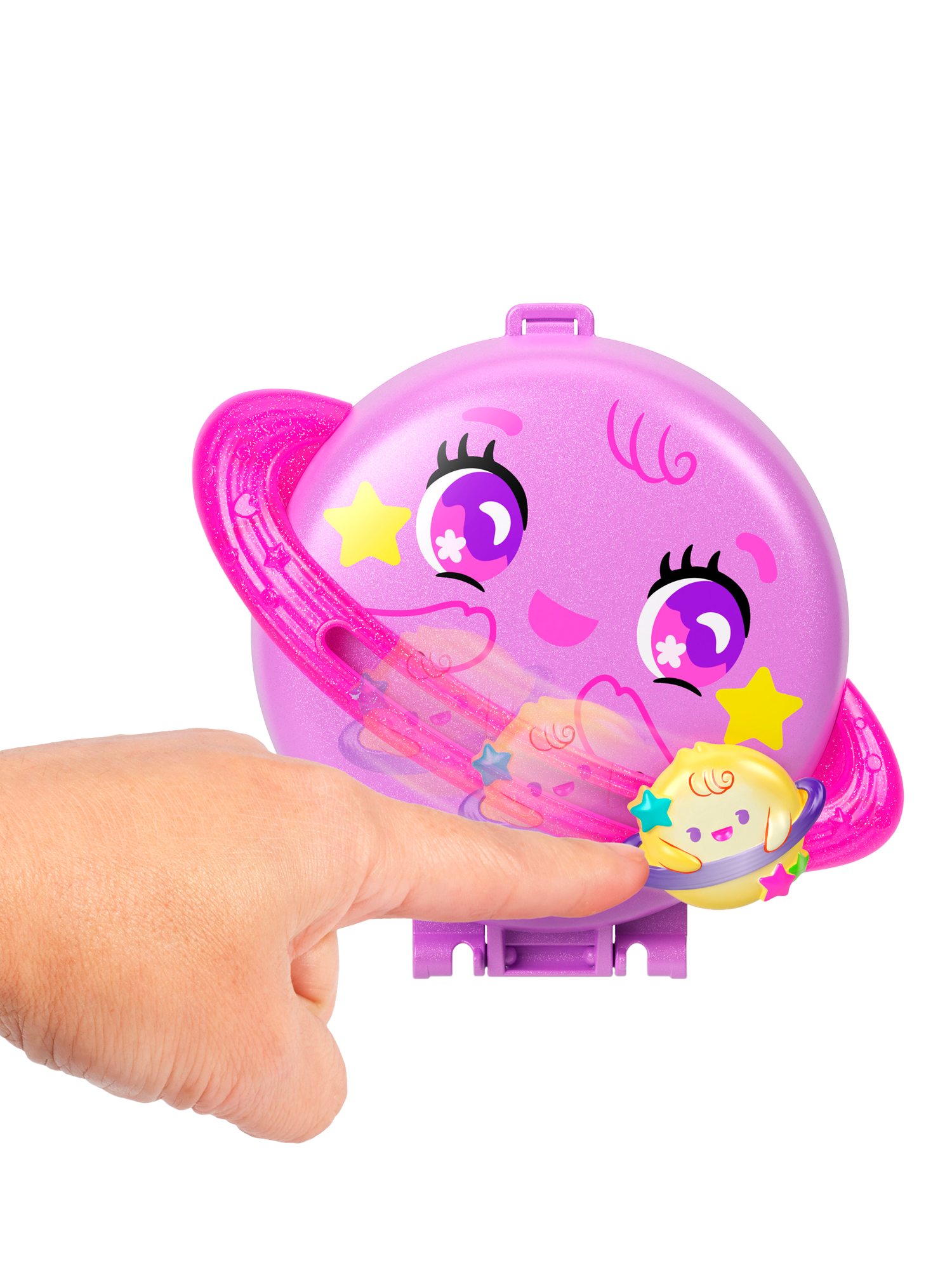 This Polly Pocket Planet Polly Compact is shaped like an adorable planet with a smaller planet that slides along the ring! Open the compact to discover an outer space adventure! Experience out of this world fun with one micro doll and 10 themed accessories, including one pet puppy!