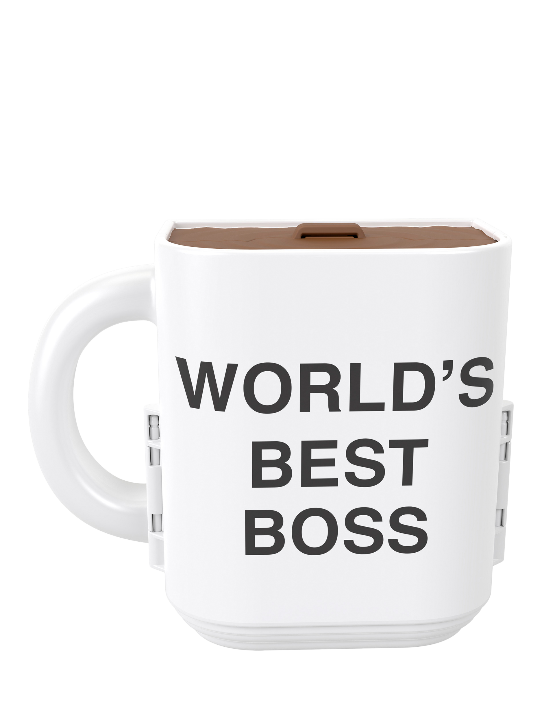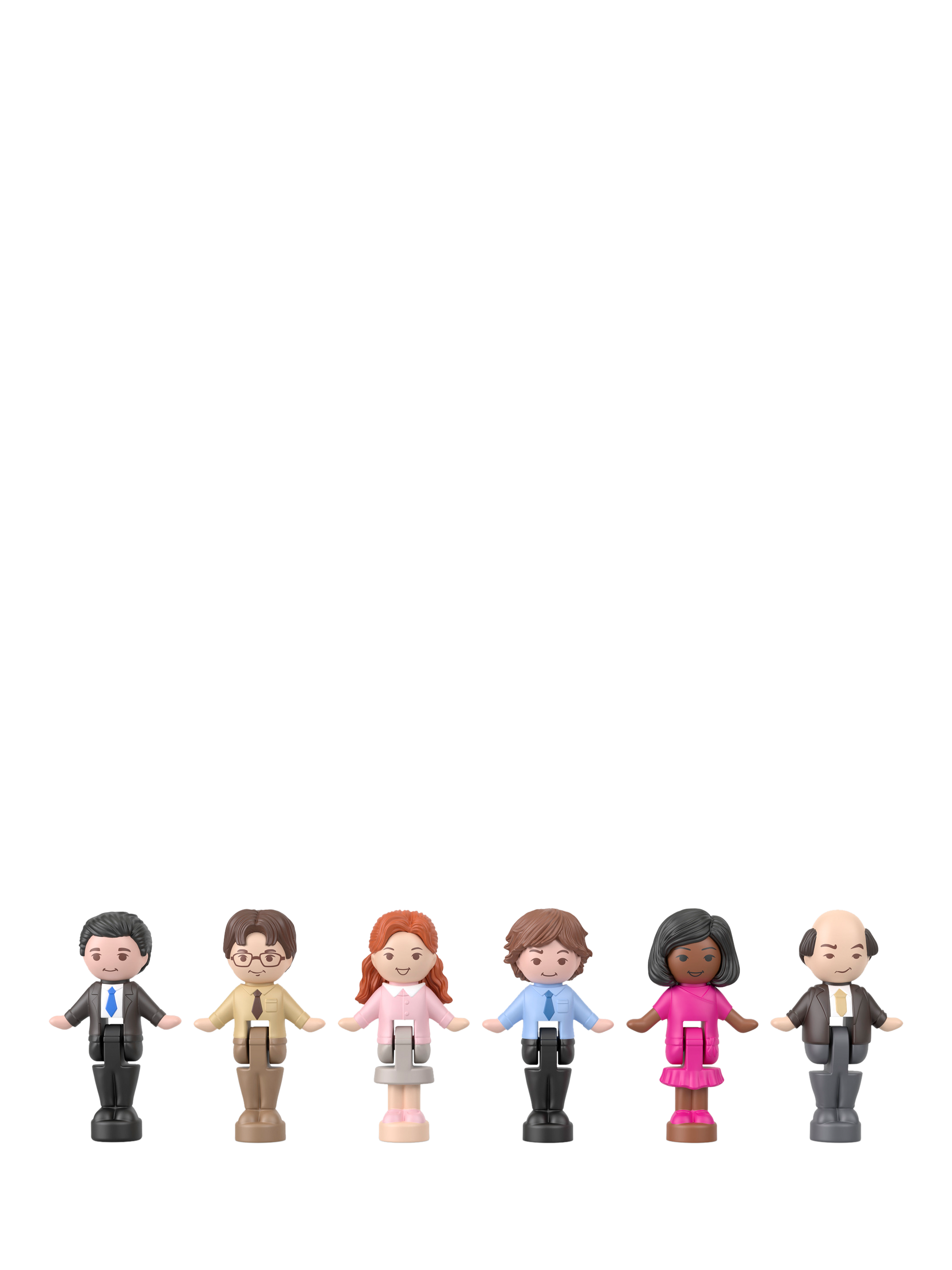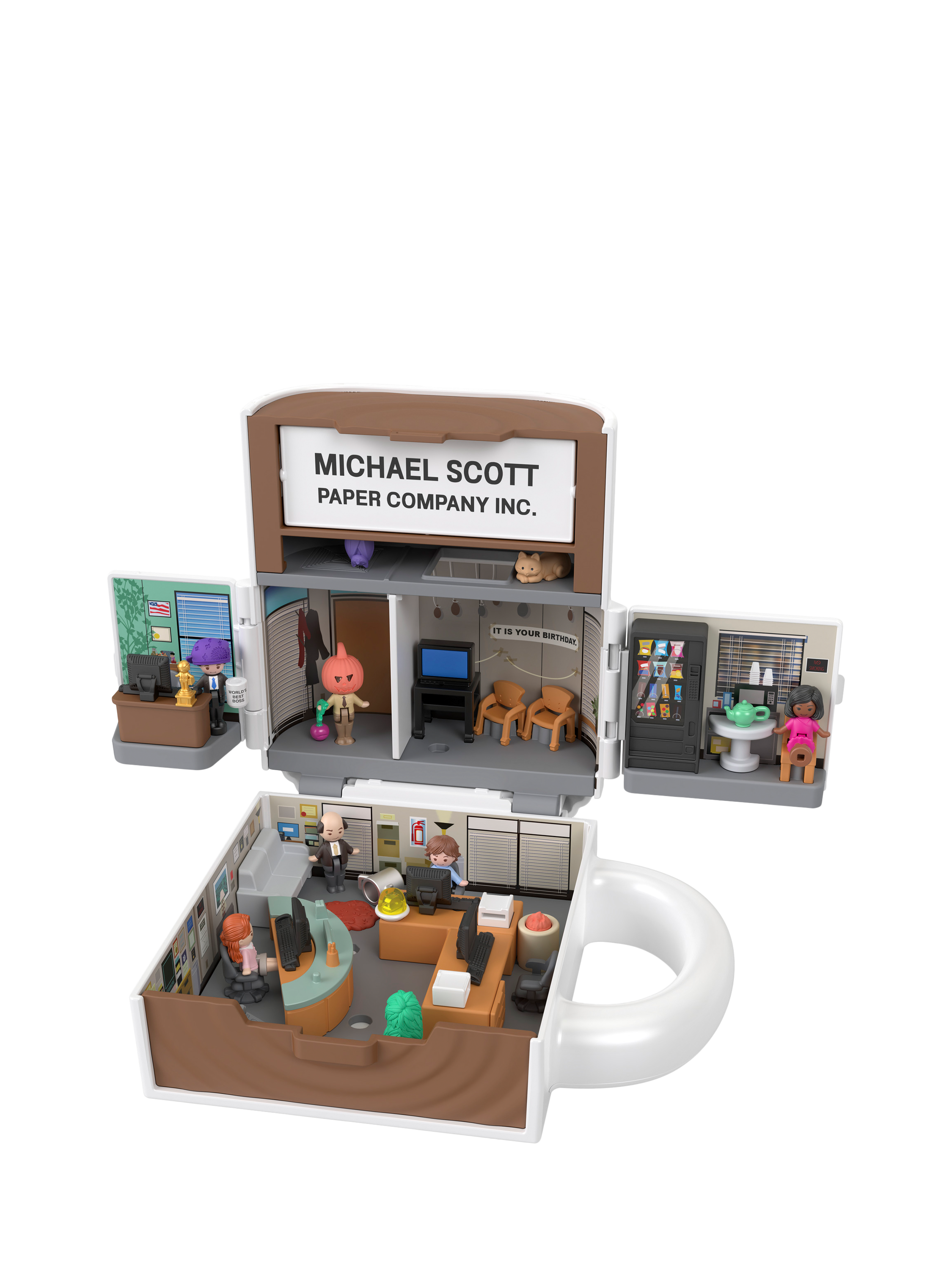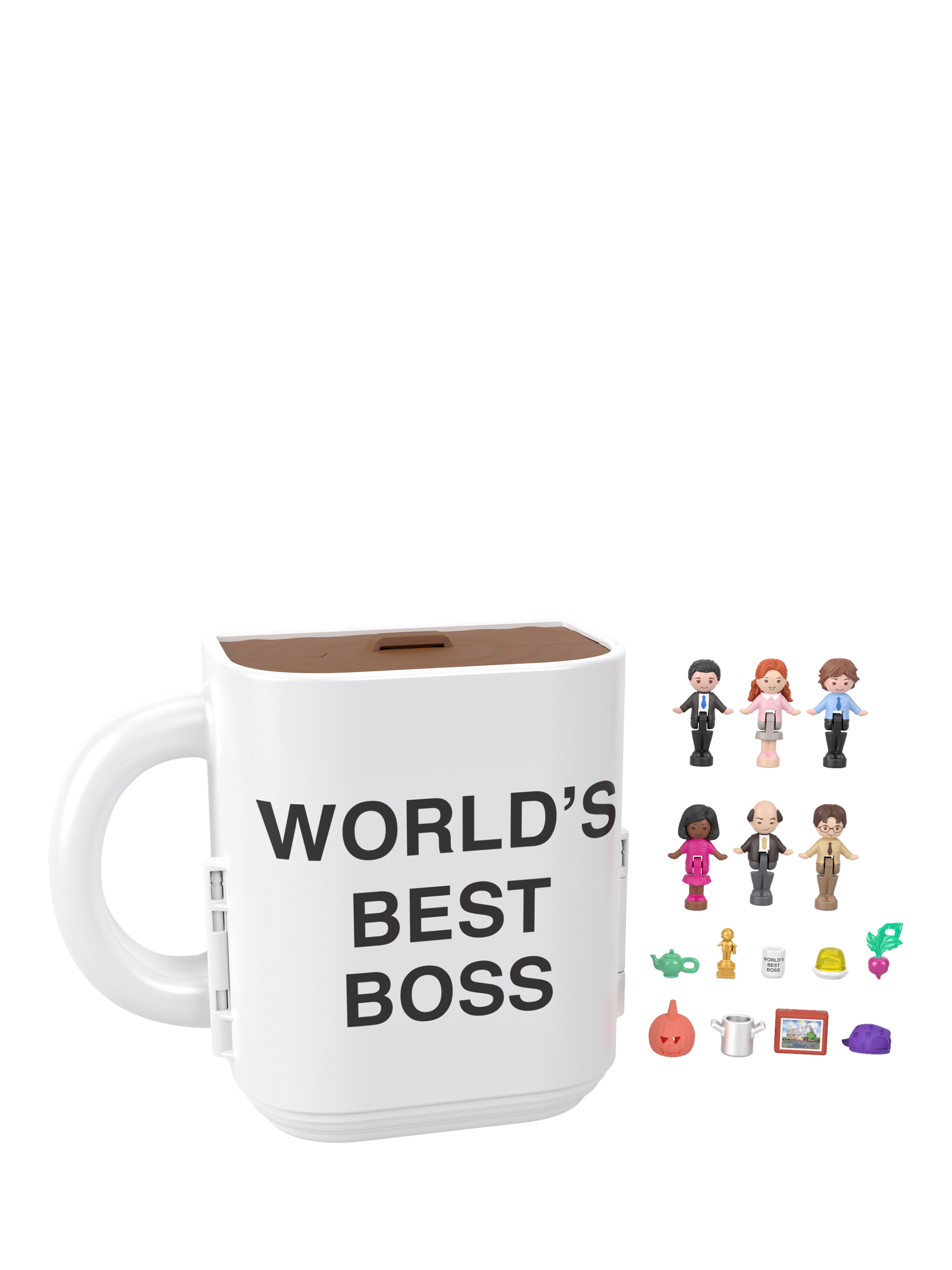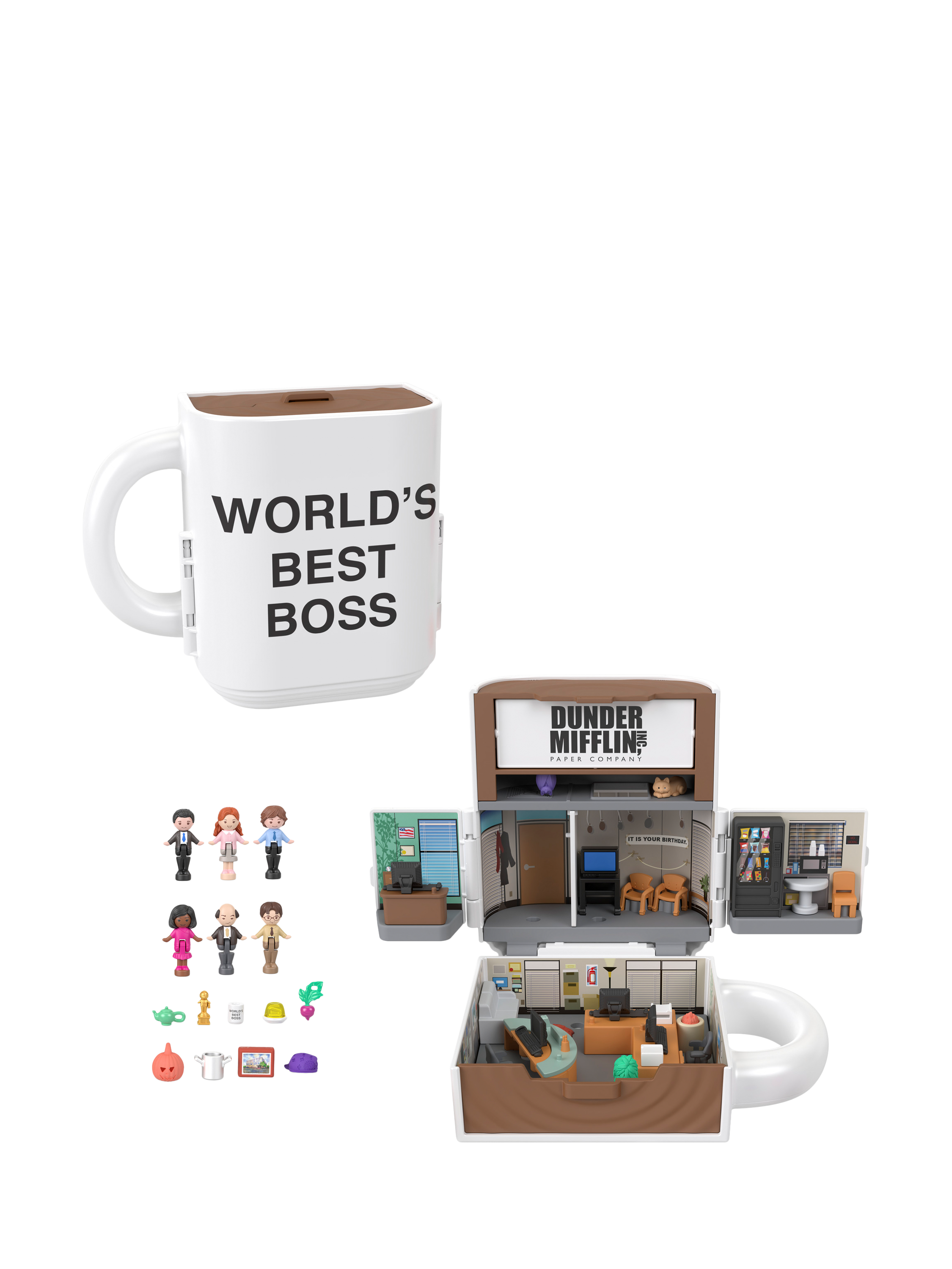 The "World's Best Boss" mug exterior opens to reveal six micro character dolls and nostalgic locations within Dunder Mifflin Scranton where fans can re-enact hysterical moments from the show. Nine accessories and fun features offer Easter Eggs and play and display moments that capture popular scenes: a trashcan fire, Dwight's pumpkin prank, the Dundie Awards, and more!