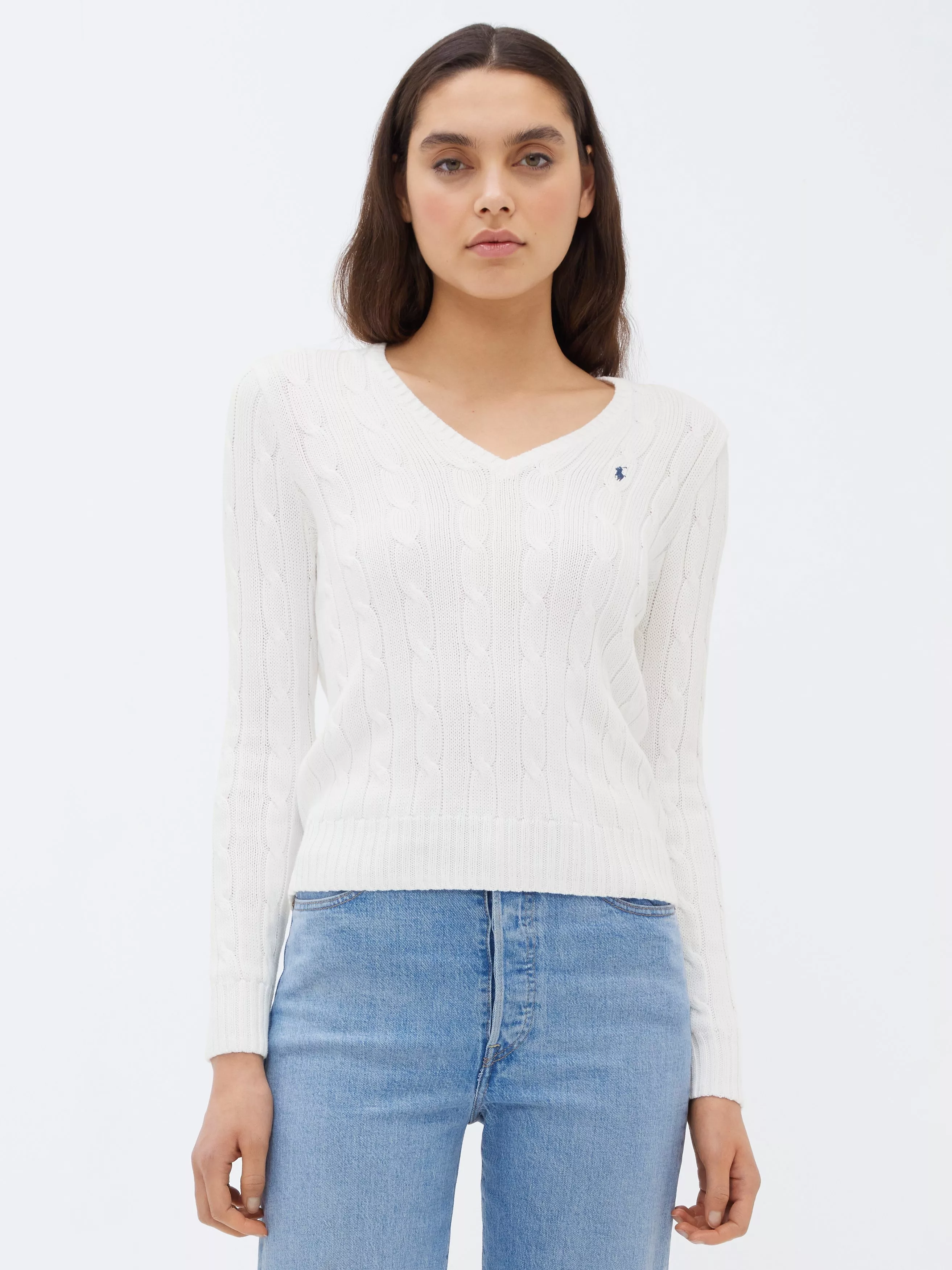With design influence from collegiate style, this cable-knit jumper is inspired by fishermen's ropes and is made from soft, luxurious cotton. It has a ribbed v neckline and hem, long sleeves with ribbed cuffs and a signature embroidered pony at the left chest. Wear with jeans and a shirt for a casual daytime attire.