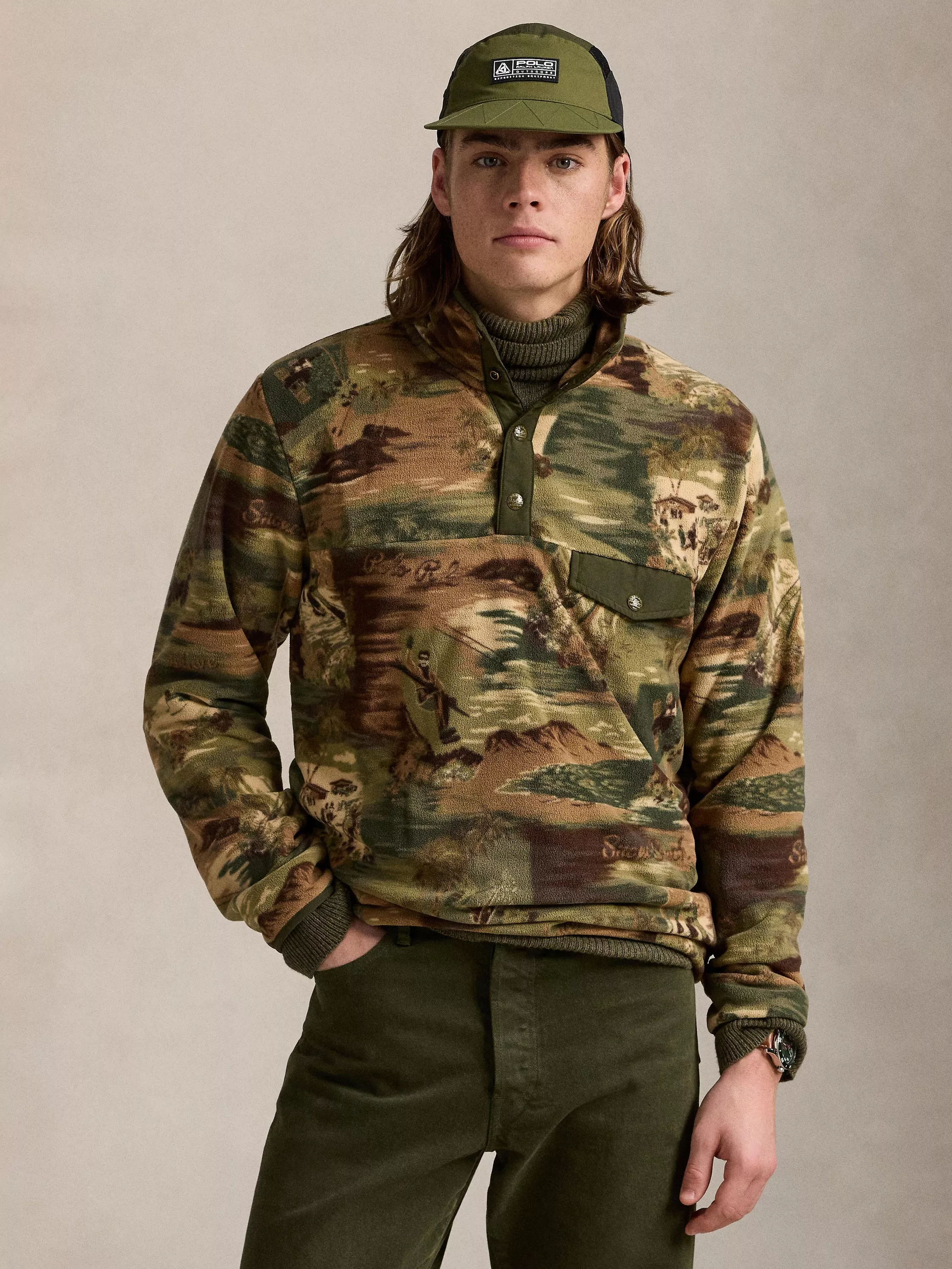 This mockneck pullover contrasts supersoft brushed fleece with sleek woven trim for a modern take on texture. In traditional camo colors, its printed motif nods to the rich terrain of Hawaii, where one can both ski the volcanoes and surf the iconic swell.