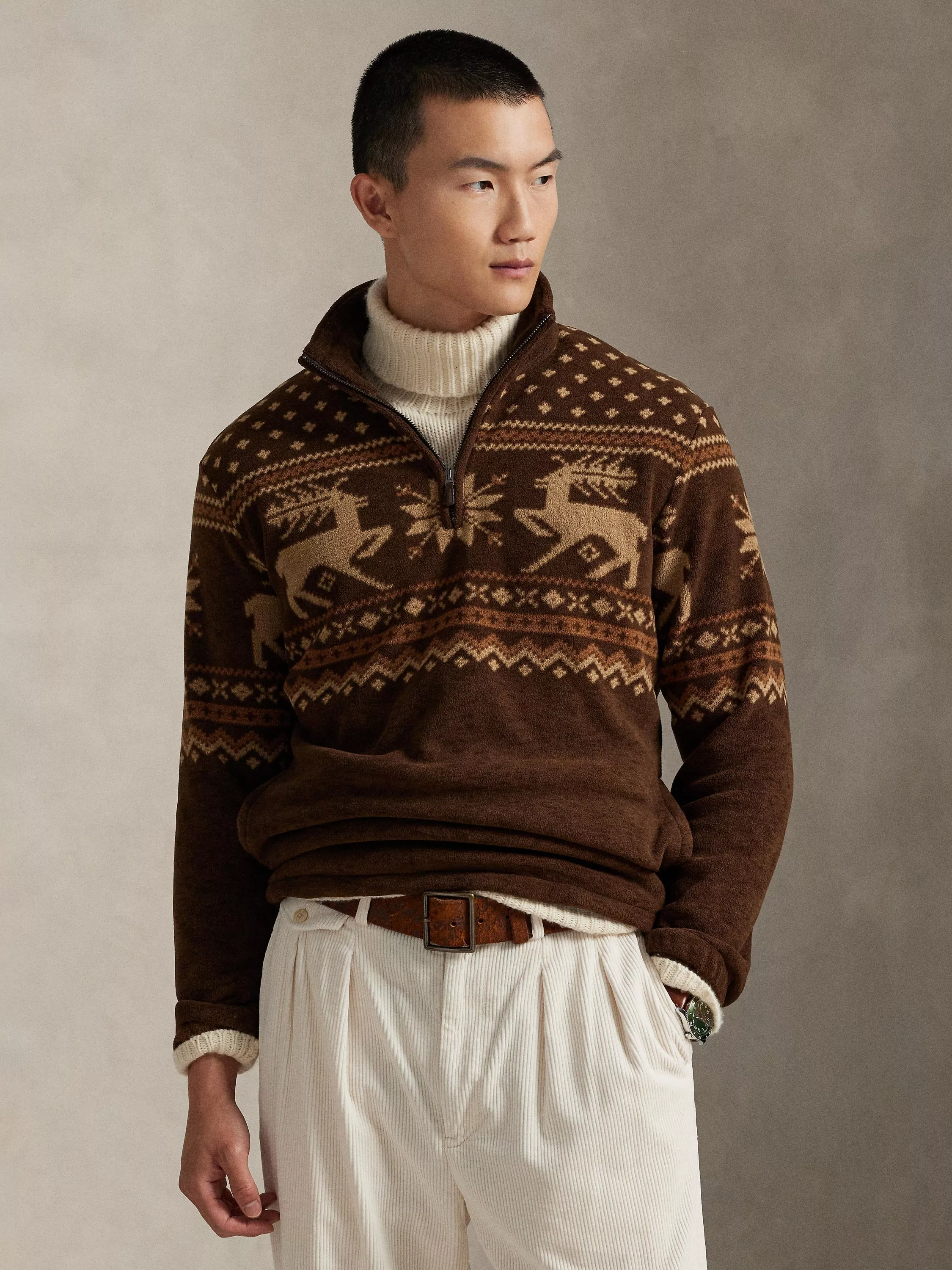 Crafted from soft brushed fleece, this pullover boasts a Fair Isle–inspired print that includes moose and snowflakes for a rustic look. Features a zipper pull custom-developed with a “Polo” logo.