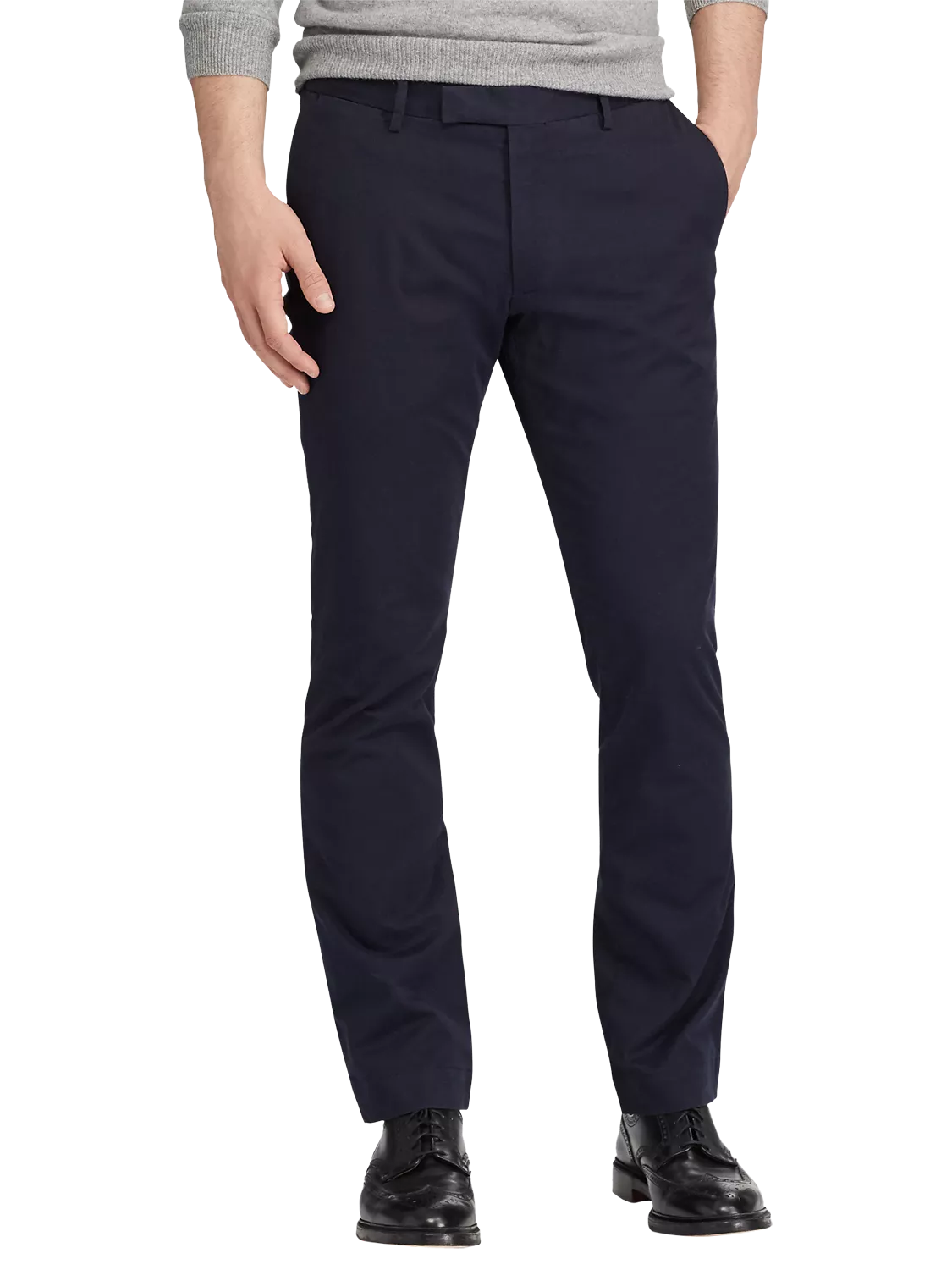 The trousers feature slanted pockets and belt loops.