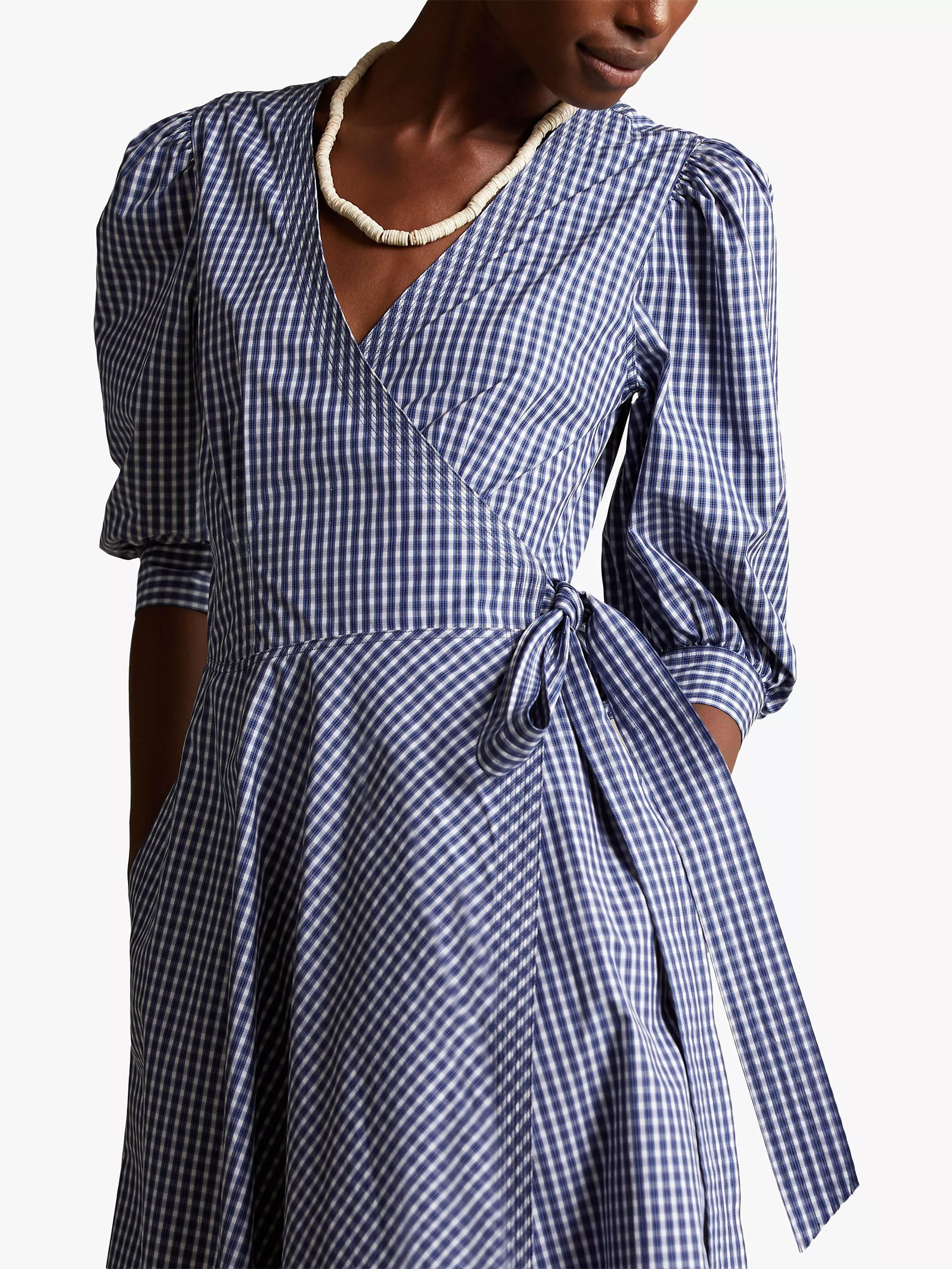 Equal parts pretty, preppy and playful, this midi dress from Polo Ralph Lauren is decorated in neat gingham checks for a cute summery vibe. Gathered at the waistline and flaring out to a midi length, the flattering wrap-style bodice is balanced out by short puffed sleeves for a look that's sure to transport you through summer events with ease.