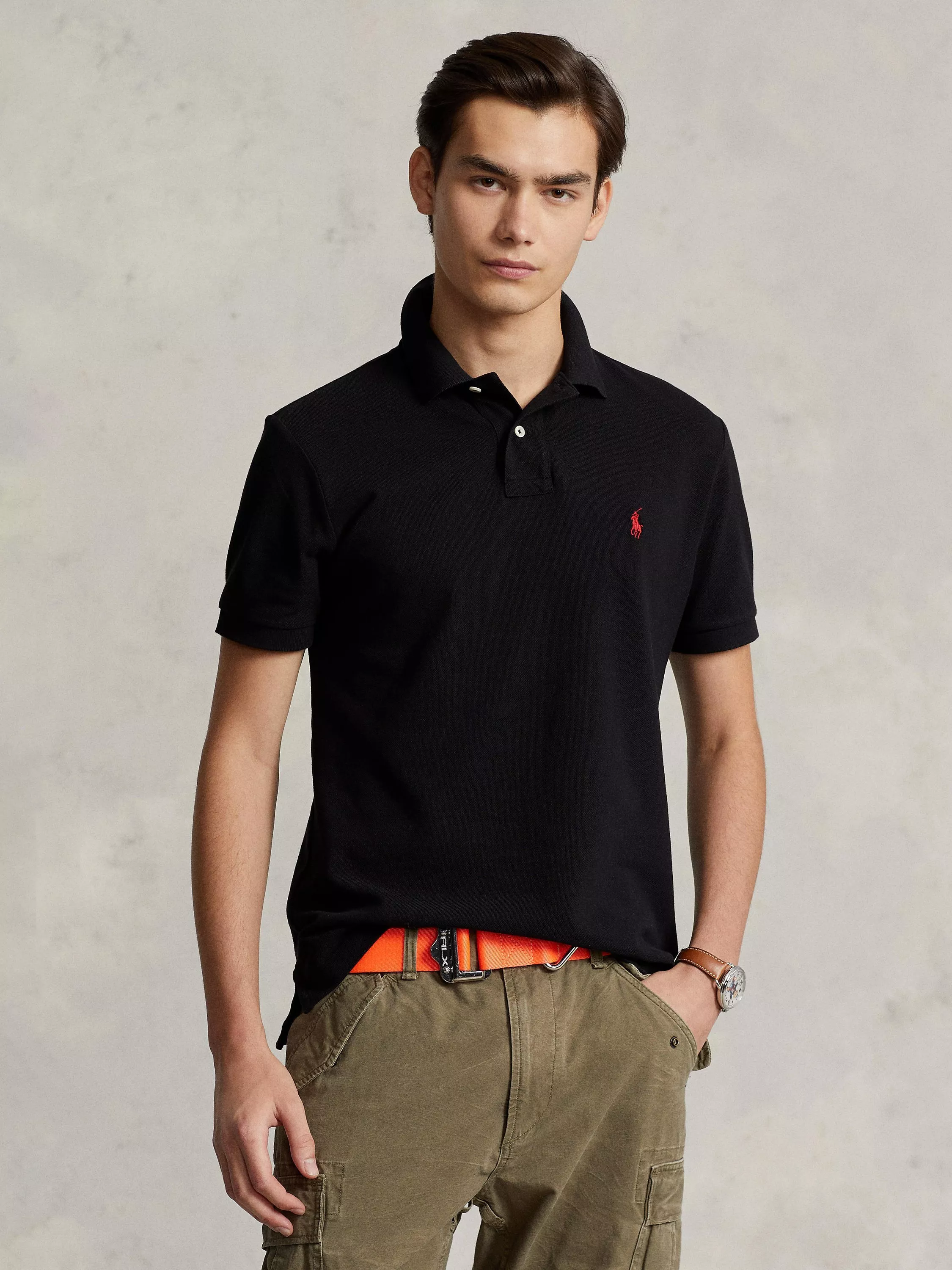 Crafted from durable cotton mesh and designed with a contemporary slim-fitting silhouette, it's tailored closer to the chest and waist, with slimmer arms and a shorter hem. Designed with a ribbed collar, classic two-button placket and short sleeves with ribbed armbands. Finished with signature embroidered pony accents on the left chest, wear this iconic tee with jeans for laid-back weekends.