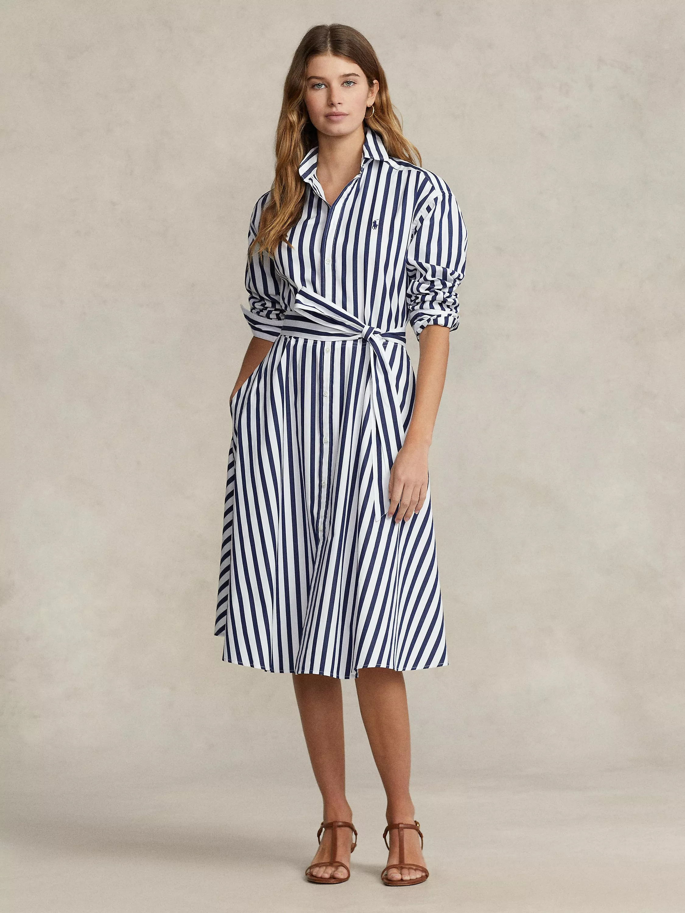 This striped cotton shirtdress is designed in an A-line silhouette and finished with iconic Pony logo at the cuff. A removable self-belt allows for versatility in styling and waist definition.