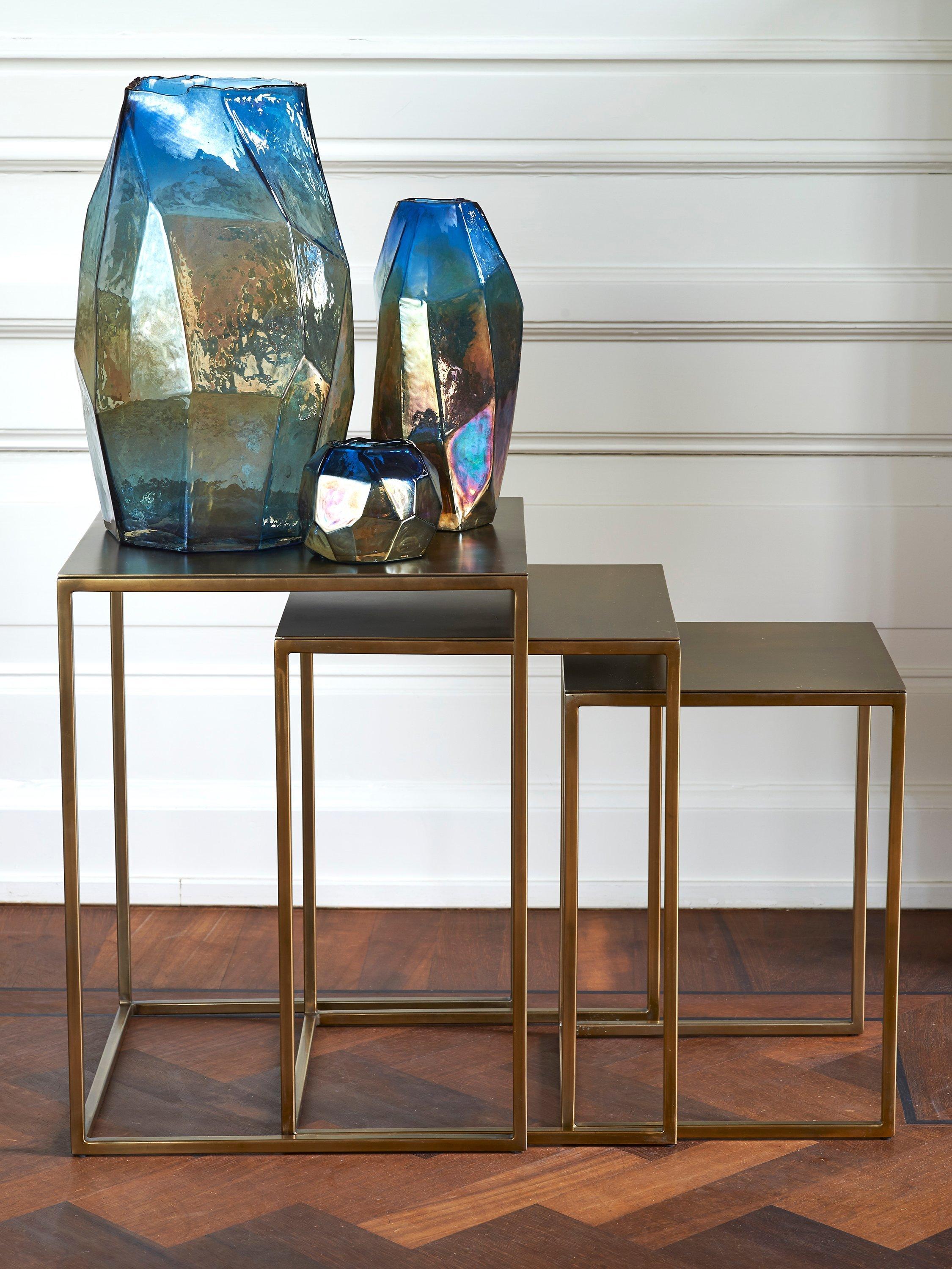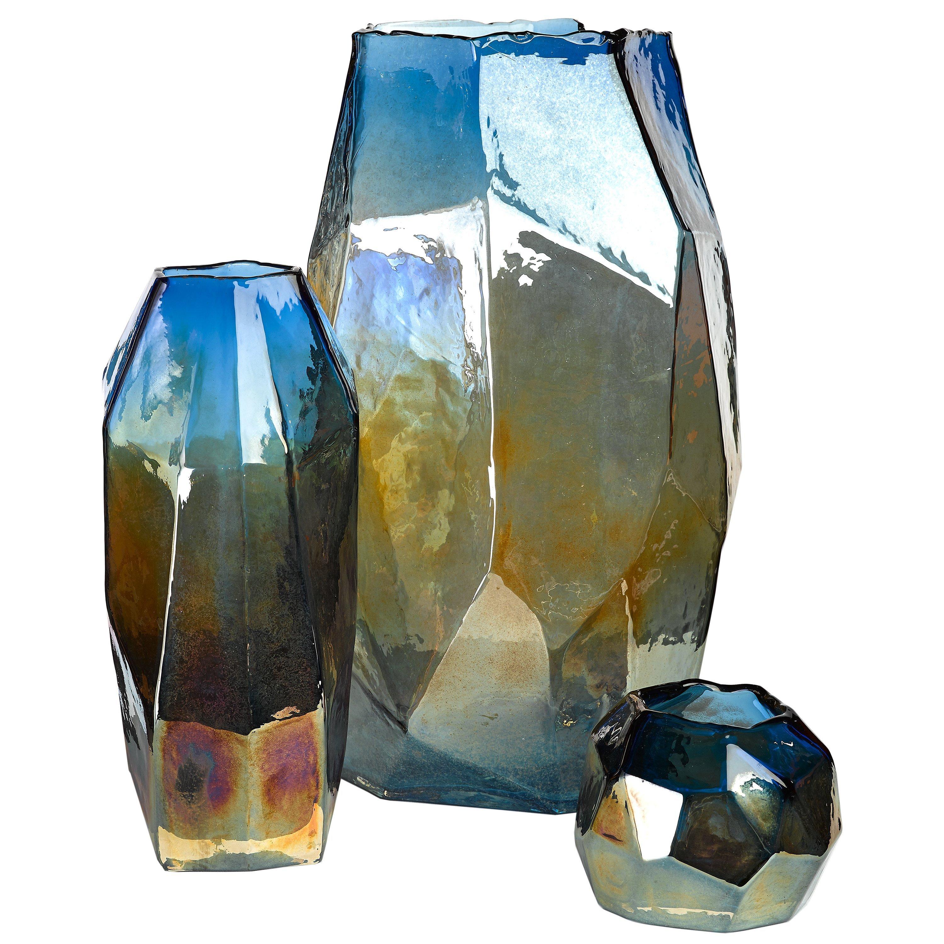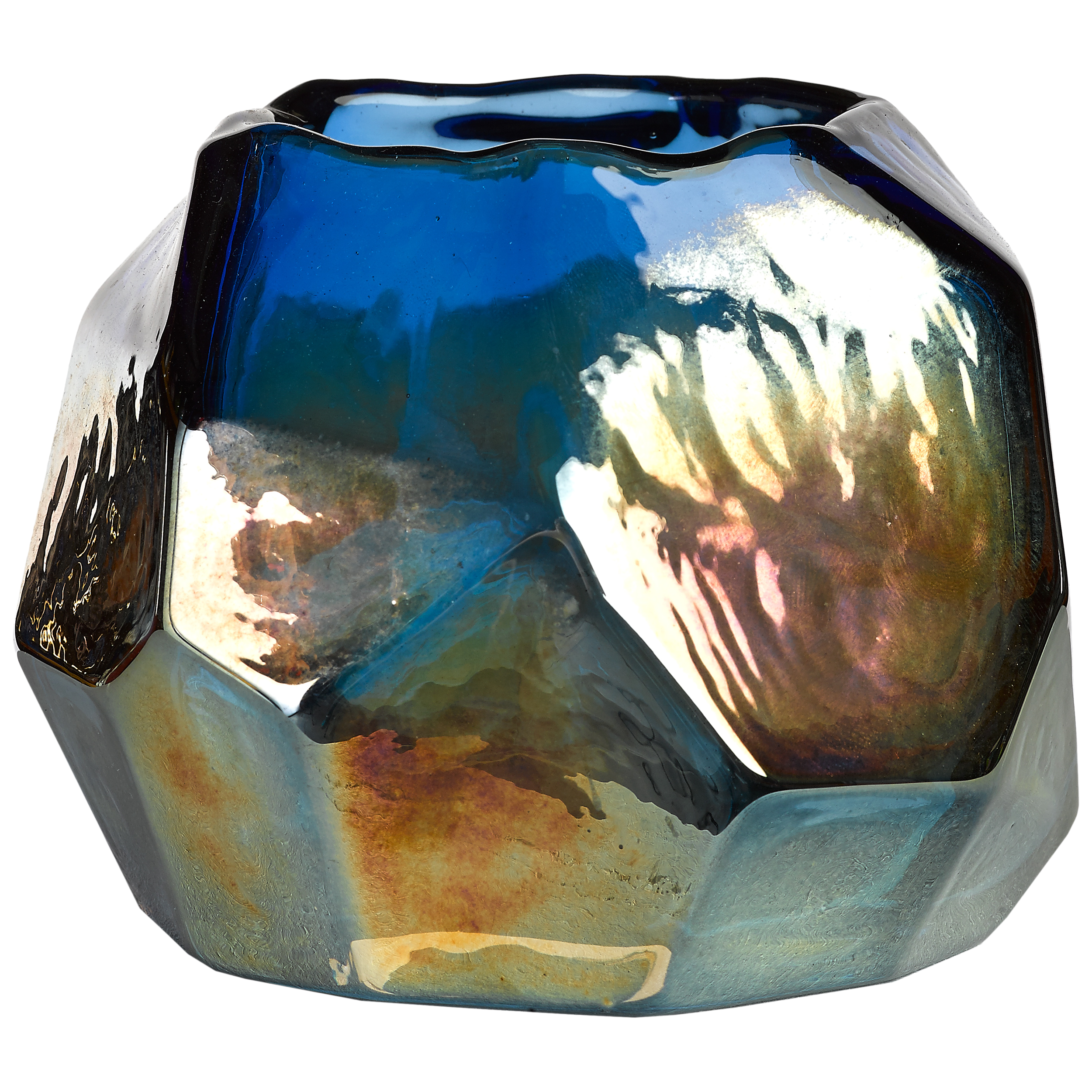 Featuring a rich mix of bright blue and copper tones in the coloured glass, reminiscent of rare mineral rocks. It's handmade so the irregular rim differs every time and is part of what gives this candle holder its charm. Perfect for adding a unique touch to your living space.
