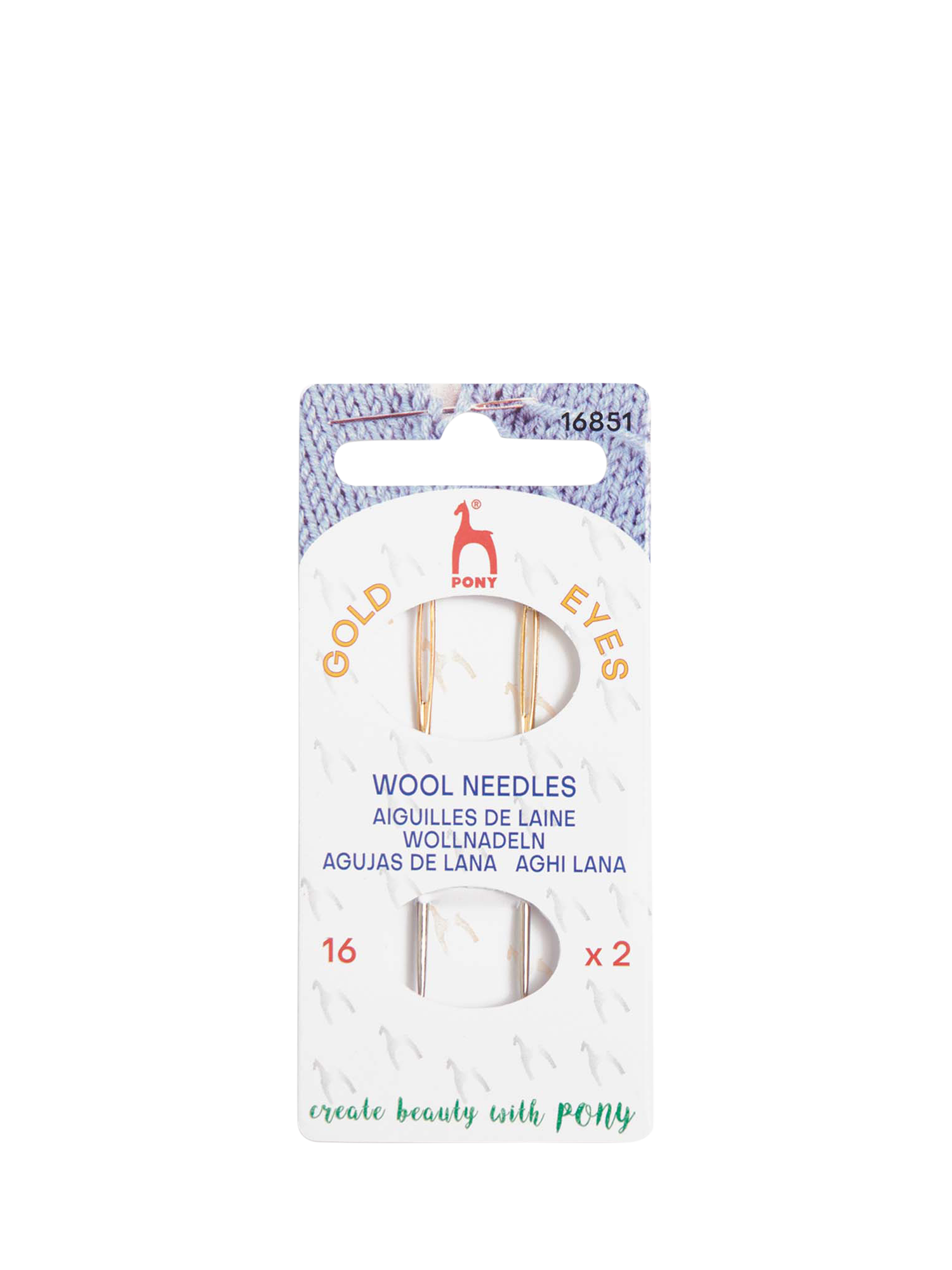 This set of two size 16 needles has one blunt and one sharp point for sewing up knitted pieces of work. Wool needles have an extra long and wide eye suitable for use with yarns and thicker threads.