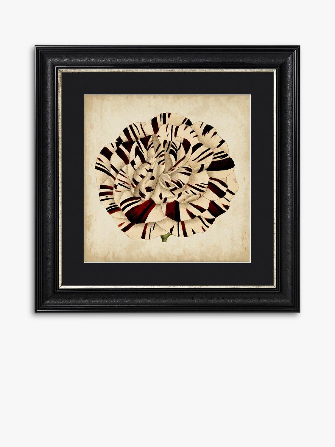 A detailed illustration of a flower, printed on satin photo paper and framed in a black and antique pewter moulding. The frame is made of a recycled wood composite and comes with a black mount and white core.