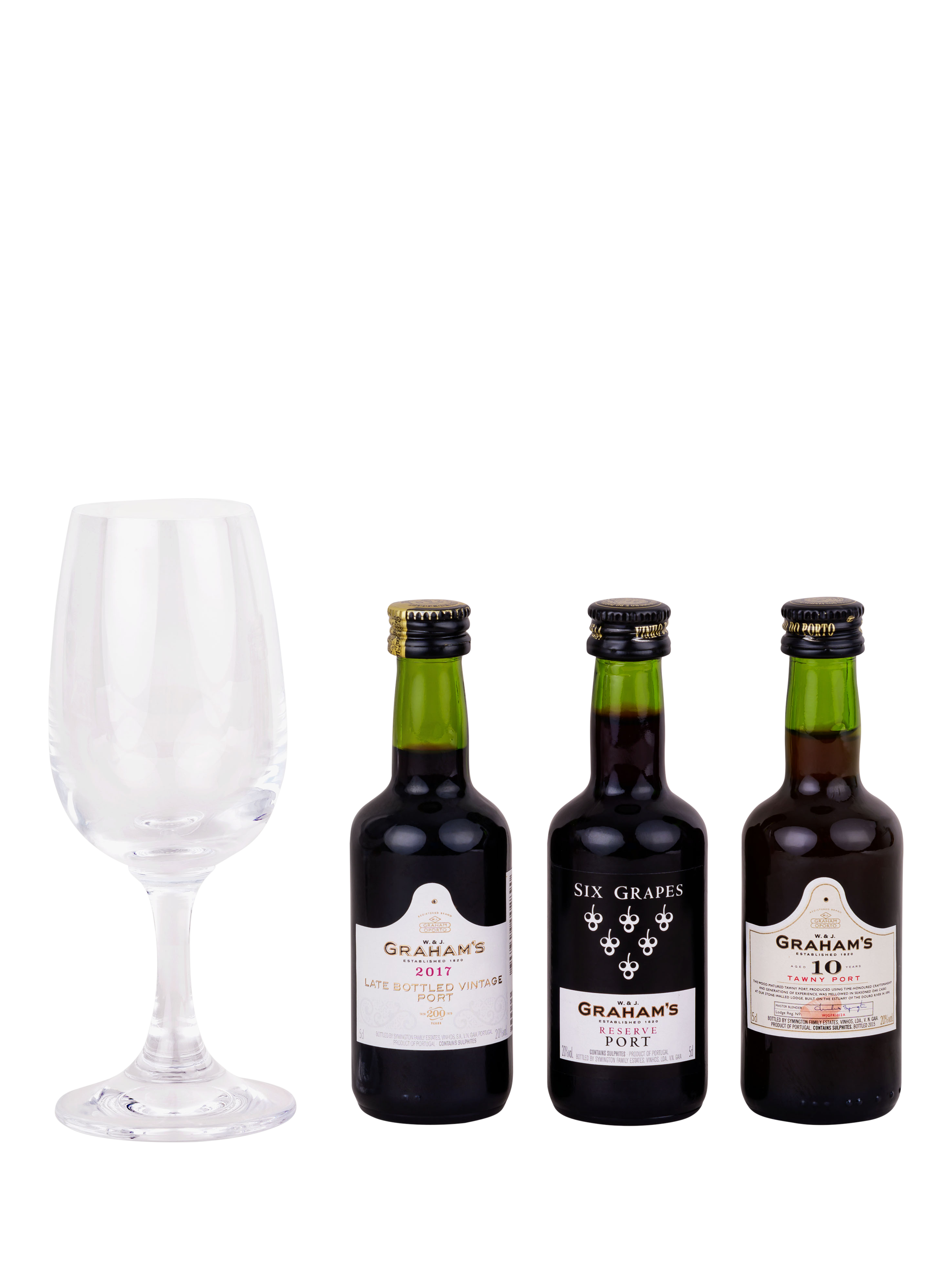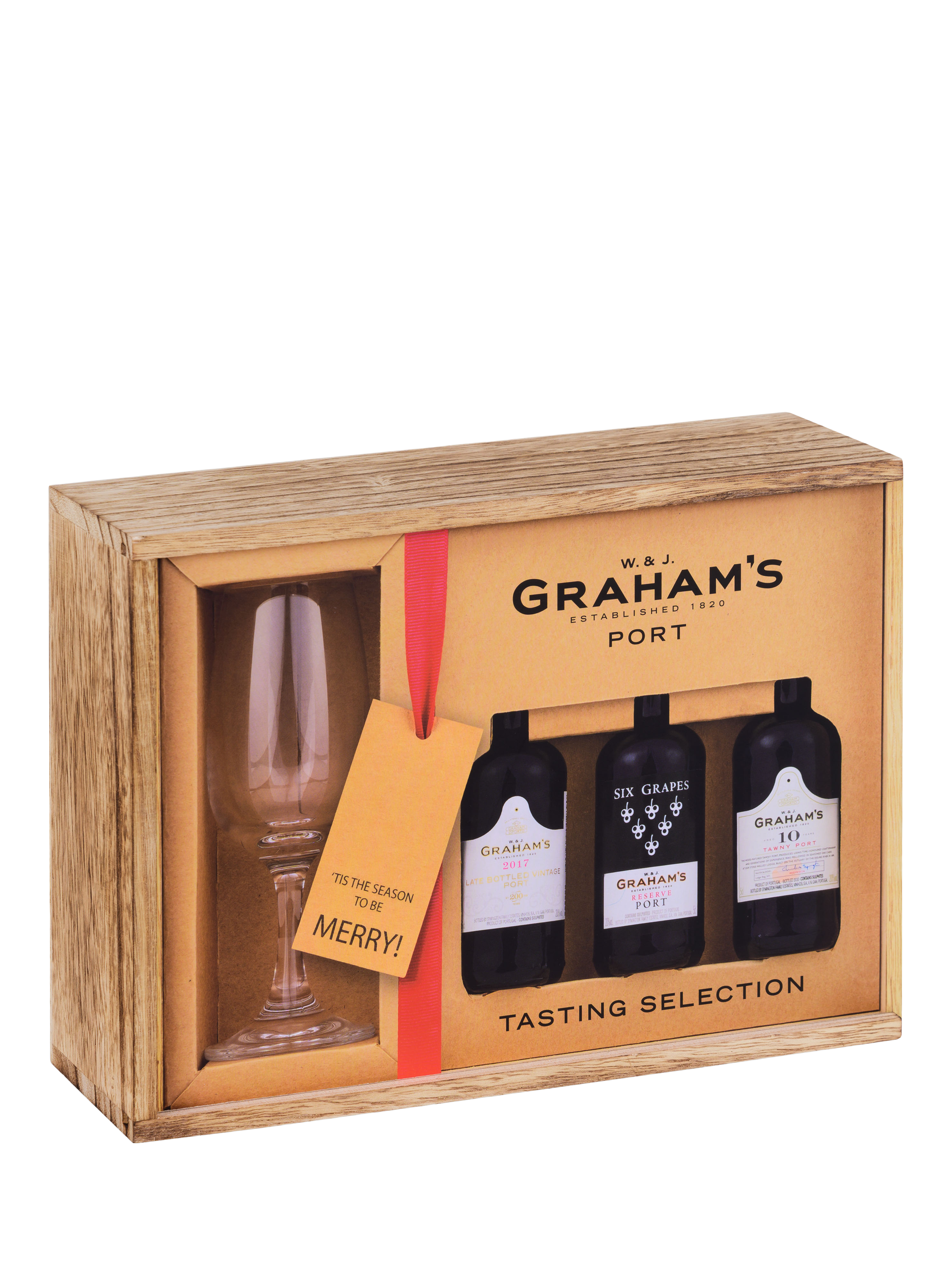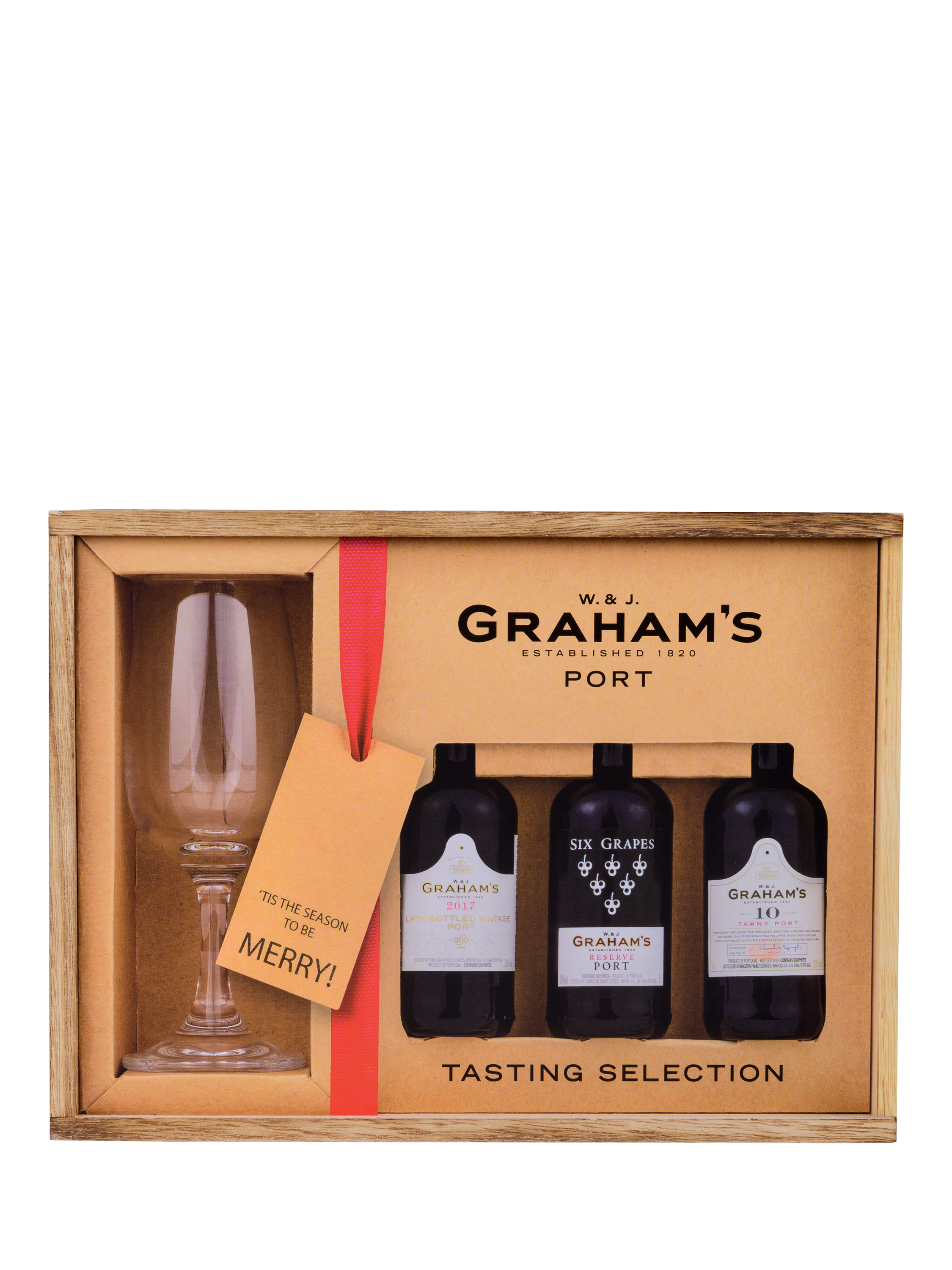 A collection of three exceptional ports with an elegant stemmed glass for tasting. Presented in a wooden box with photographic lid, the kit includes: 2017 Graham's Late Bottled Vintage Port, Graham's Six Grapes Reserve Port and Graham's Aged 10 Year Old Tawny Port.