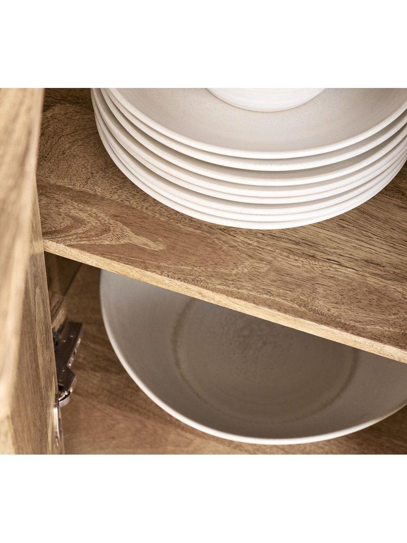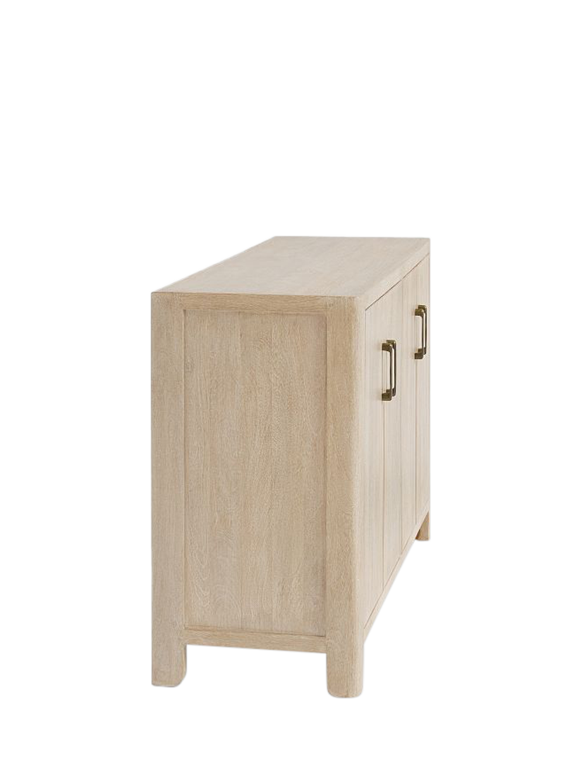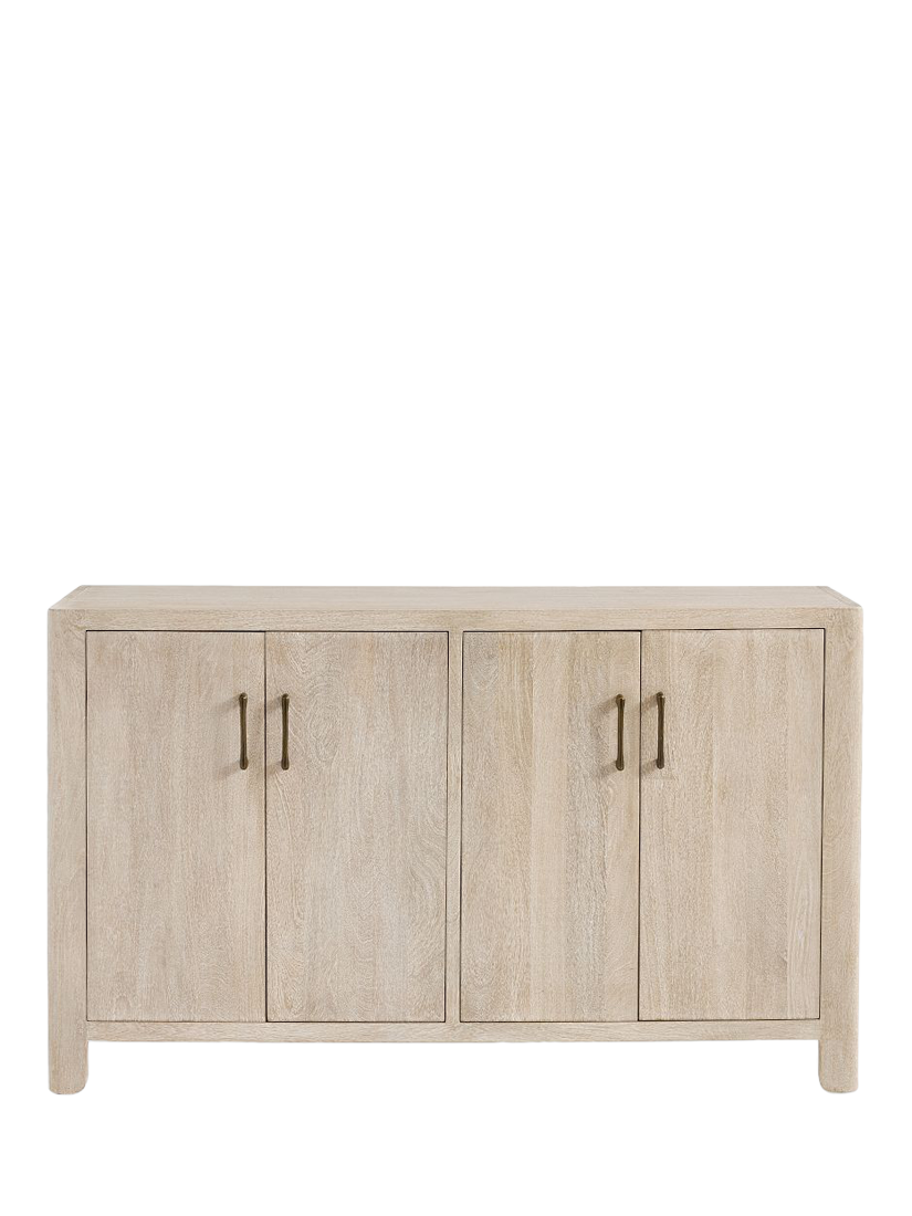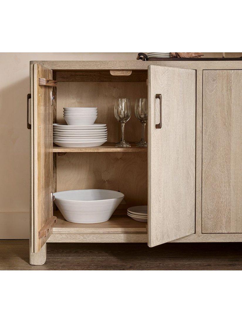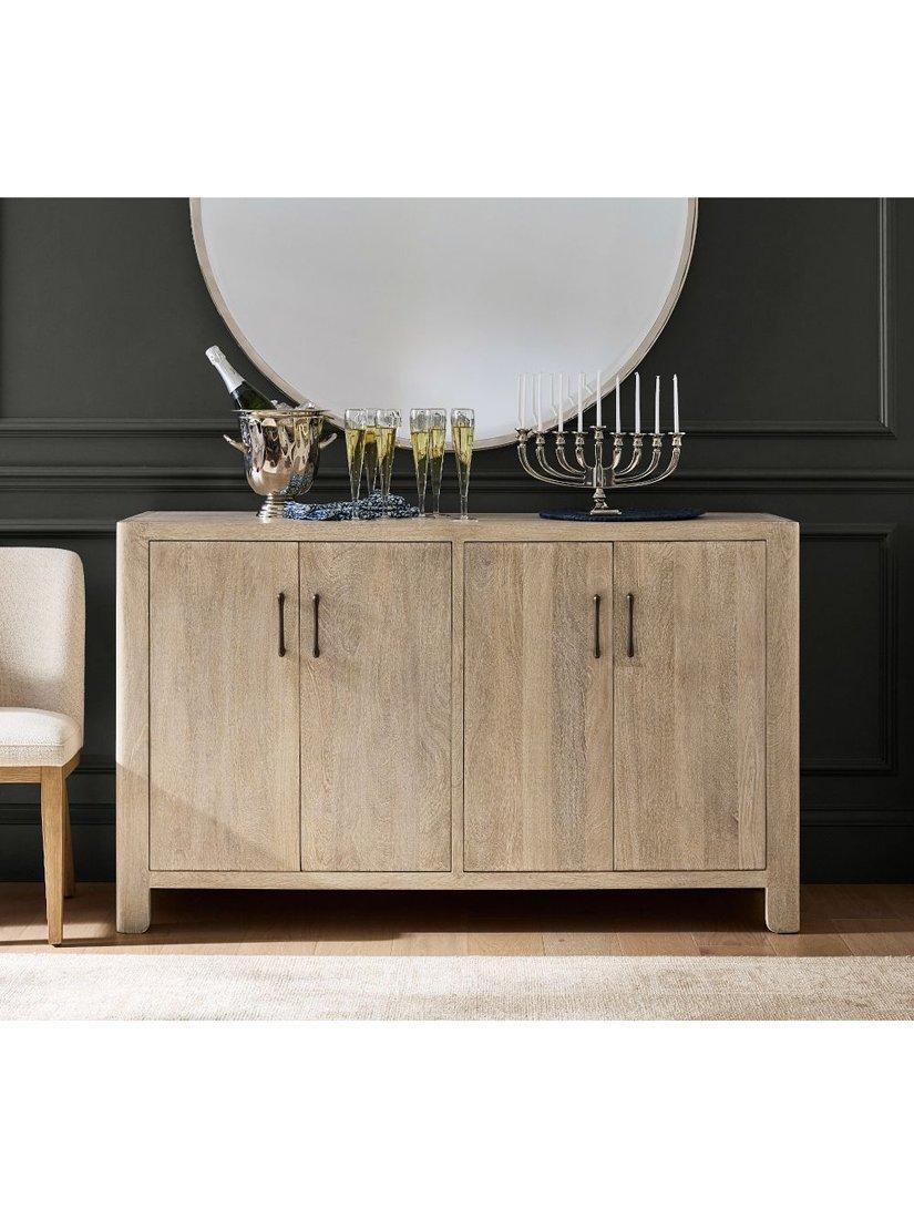 This sideboard has a beautiful, weathered look that highlights the gorgeous grain. With soft edges and antique-inspired cast iron hardware, it is a welcome home for curated collections, serveware and more. It's also a master at entertaining, from cocktail service to displaying appetisers and desserts. 2 cord cut-outs keep cords organised and easily accessible.