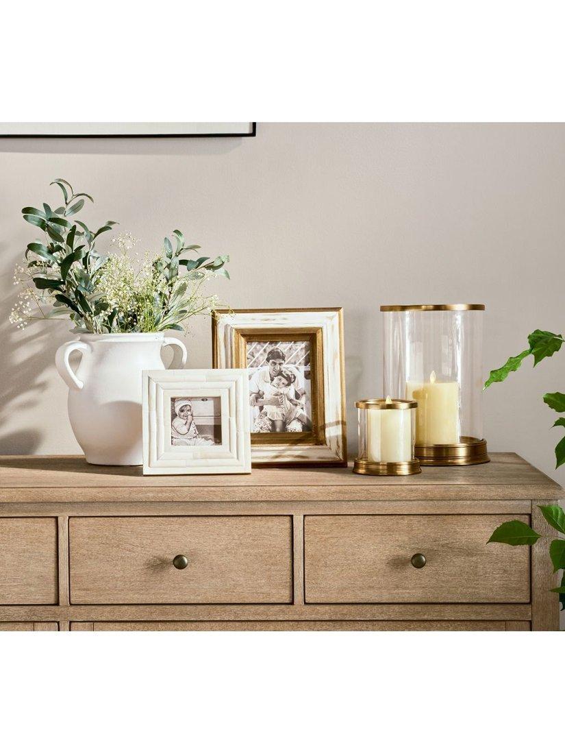 With a nod to art deco elegance, these hurricanes combine clean lines and fine metal accents. We love the way they reflect the flickering light, adding a glamorous glow. Arrange in a candlescape with other metal votives or tapers.