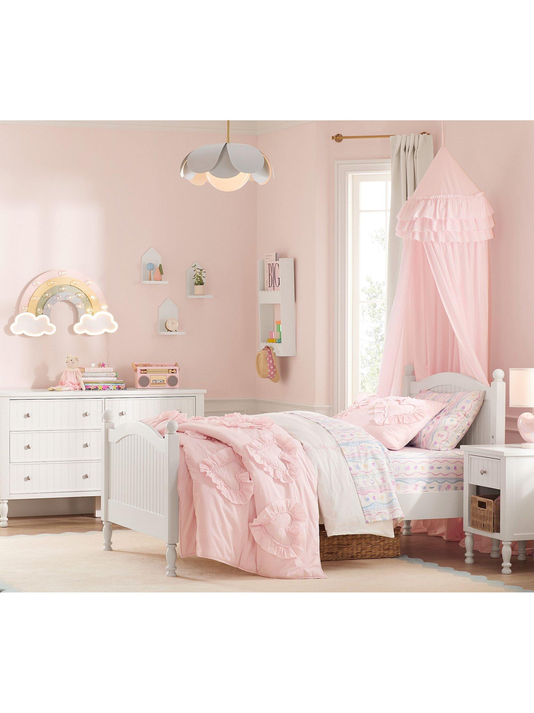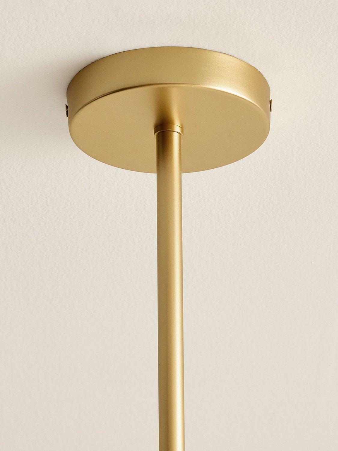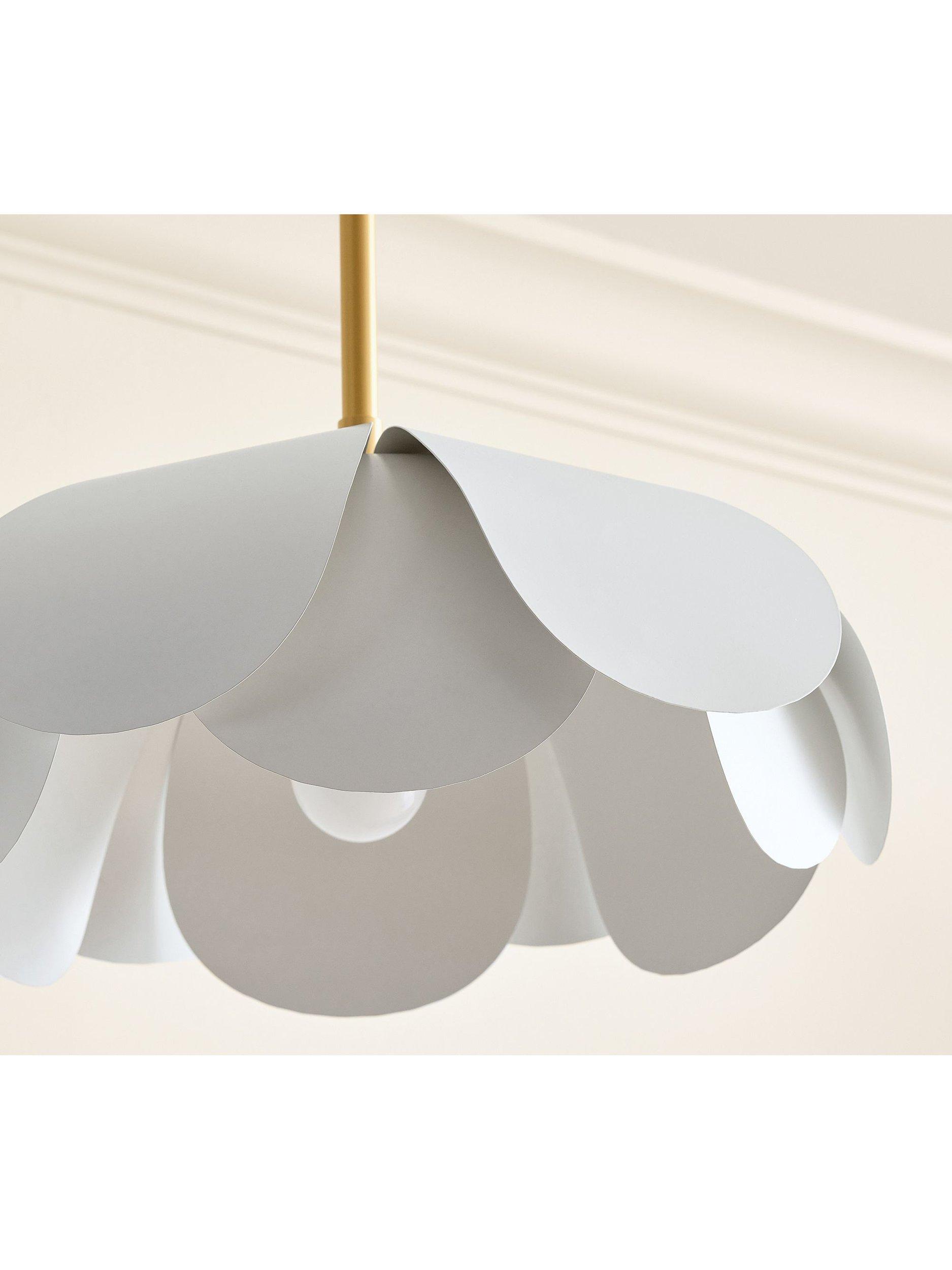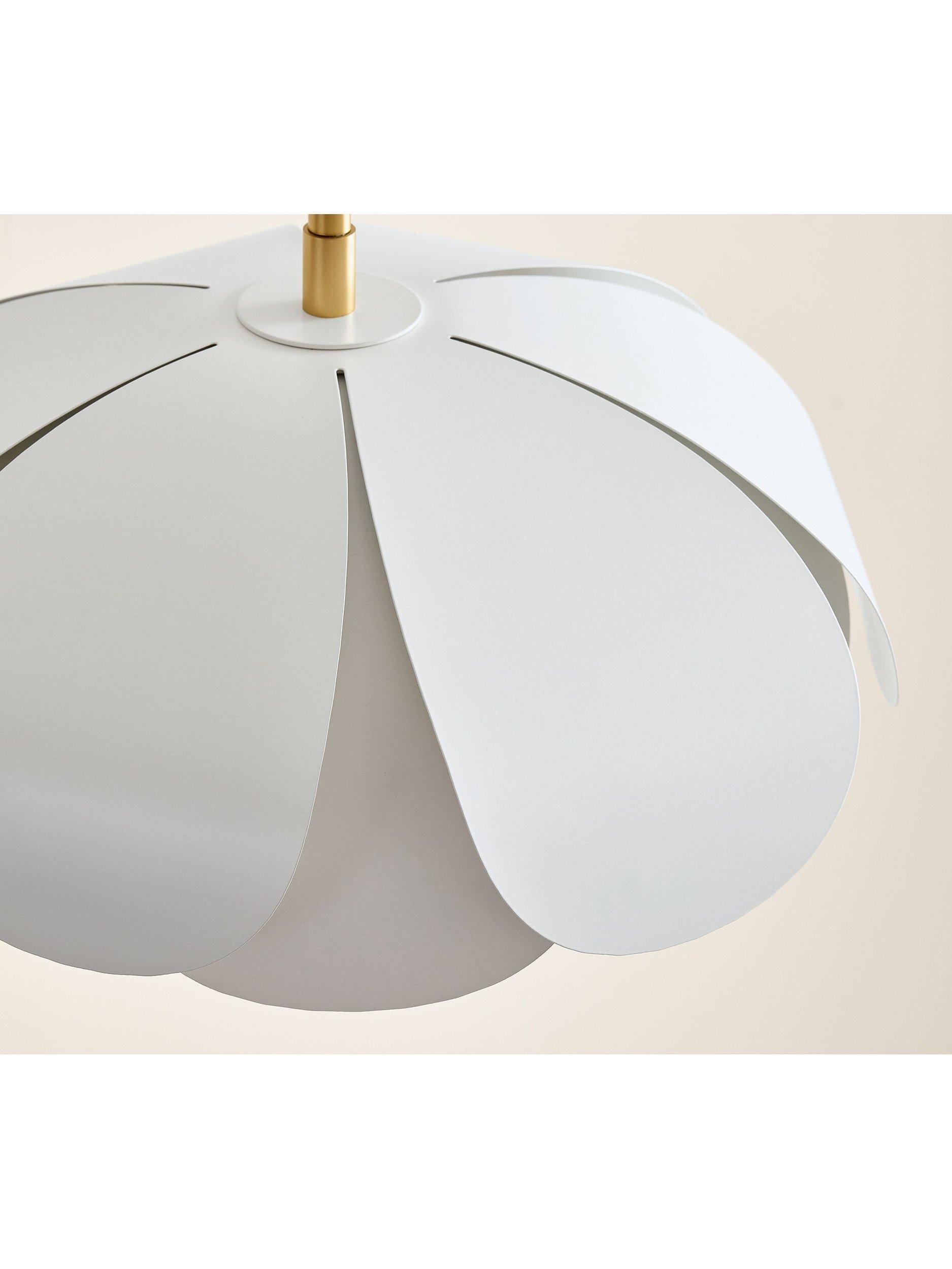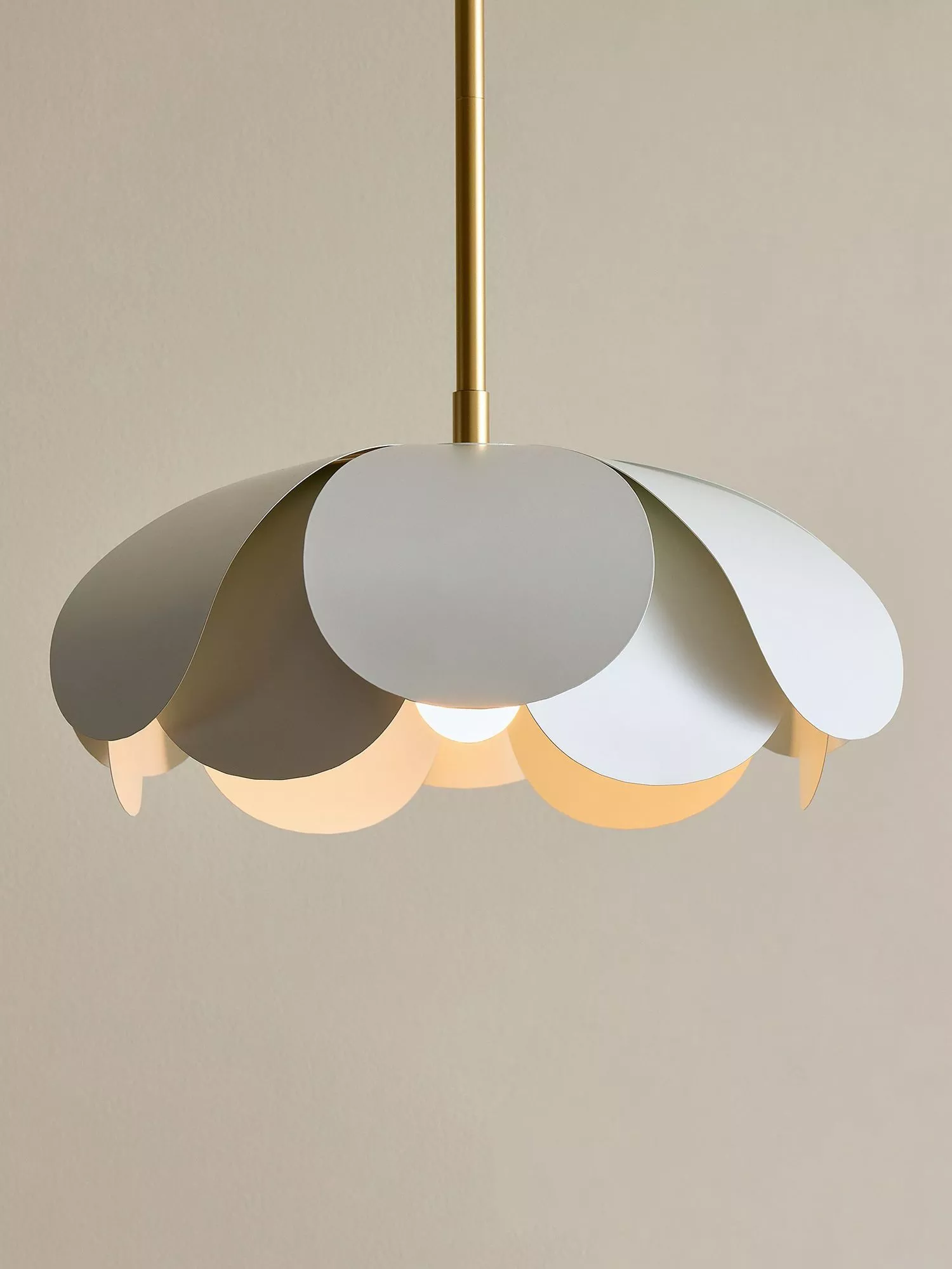 Suspended from a shimmering gold pole, the sculpted iron petals are crafted by hand and finished in warm white to enhance the glow. Features an oil-based, hand-painted finish. Black PVC cord.