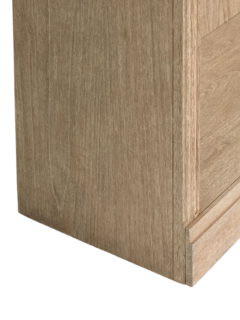 The bookcase is built using high-quality materials for enduring durability. The structure is crafted from kiln-dried solid Meranti wood, engineered hardwood, and Sungkai veneer. Meranti is a tropical hardwood known for its long, beautiful grain, and the kiln-drying process is prevents warping, splitting, and cracking. The use of veneers ensures a high-quality finished product with flawless surfaces and consistent colour tones that resist fading or cracking over time.