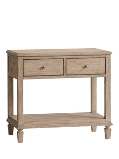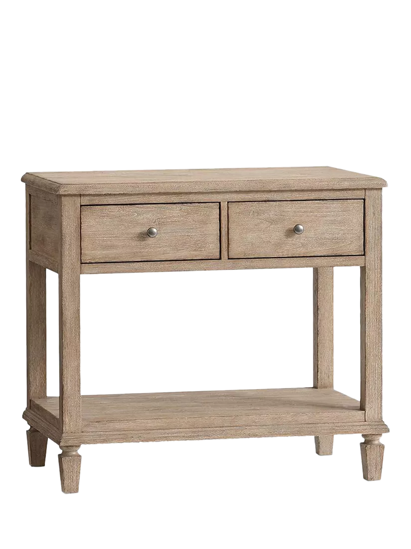 The sturdy construction is complemented by an impressive amount of storage: the piece features two spacious drawers designed for smooth, reliable performance. Each drawer features English-dovetail joinery for superior strength and durability, operating on metal glides that ensure smooth motion, while a sturdy half-moon safety stop keeps the drawer securely in place. The drawers are finished with elegant metal pulls in an antique nickel finish, adding a final touch of traditional detail to the design.