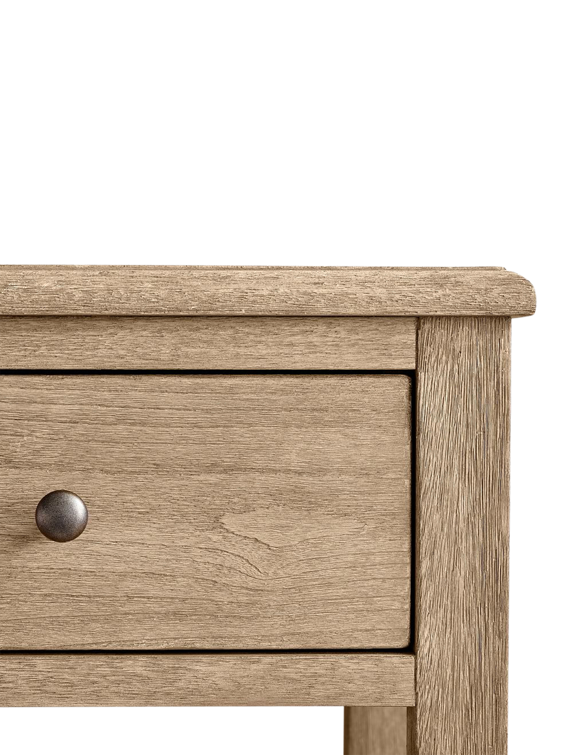 This piece is built to last, with the frame and legs crafted from solid, kiln-dried Meranti wood and a robust construction that uses a combination of materials to achieve both flawless surfaces and enduring strength. The top, sides, and drawer fronts are made of Sungkai veneer over Meranti, a technique that results in high-quality furniture with beautiful, consistent colour tones.