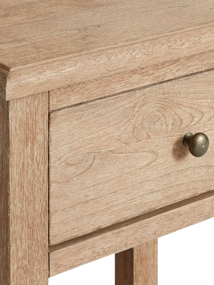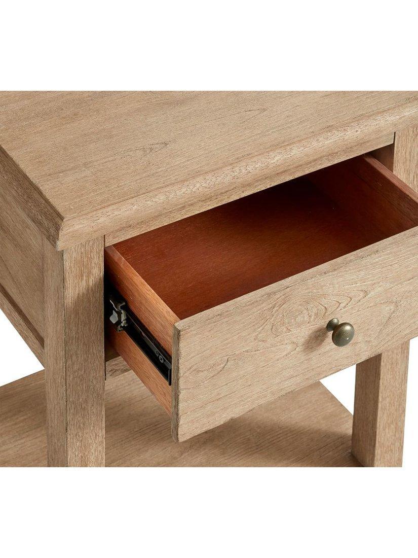 Convenient storage is provided by one spacious drawer and an open shelf. The drawer showcases quality craftsmanship with English-dovetail joinery and operates smoothly on metal glides. For safety, it's equipped with sturdy half-moon safety stops to keep it securely in place. The drawer is accented with a metal pull finished in an antique nickel tone and the entire unit includes adjustable levellers to provide stability on any uneven surface.