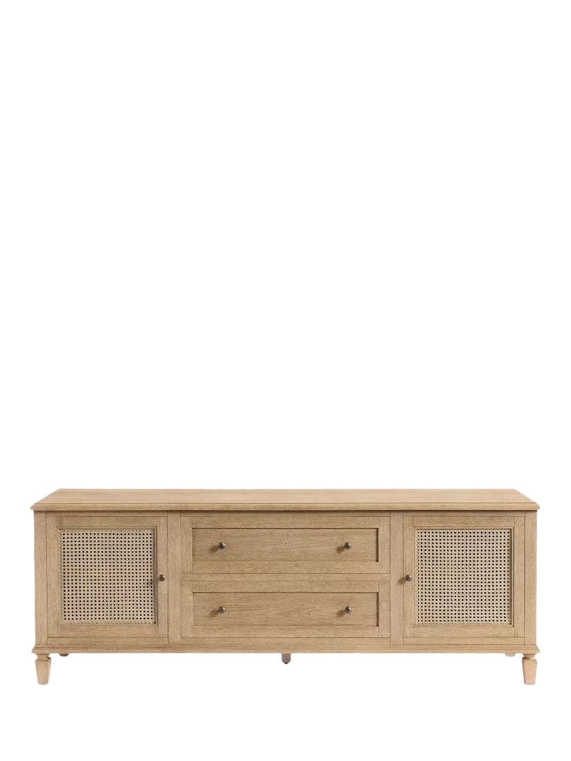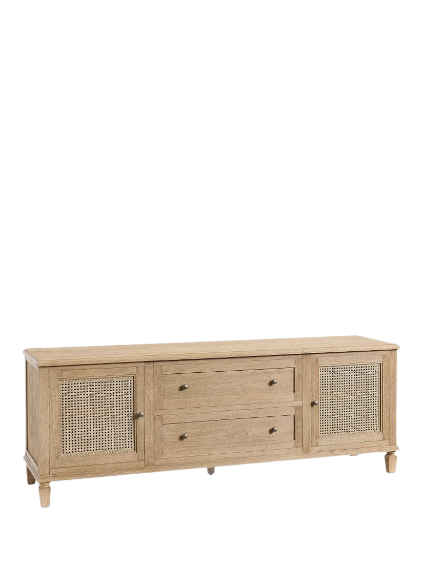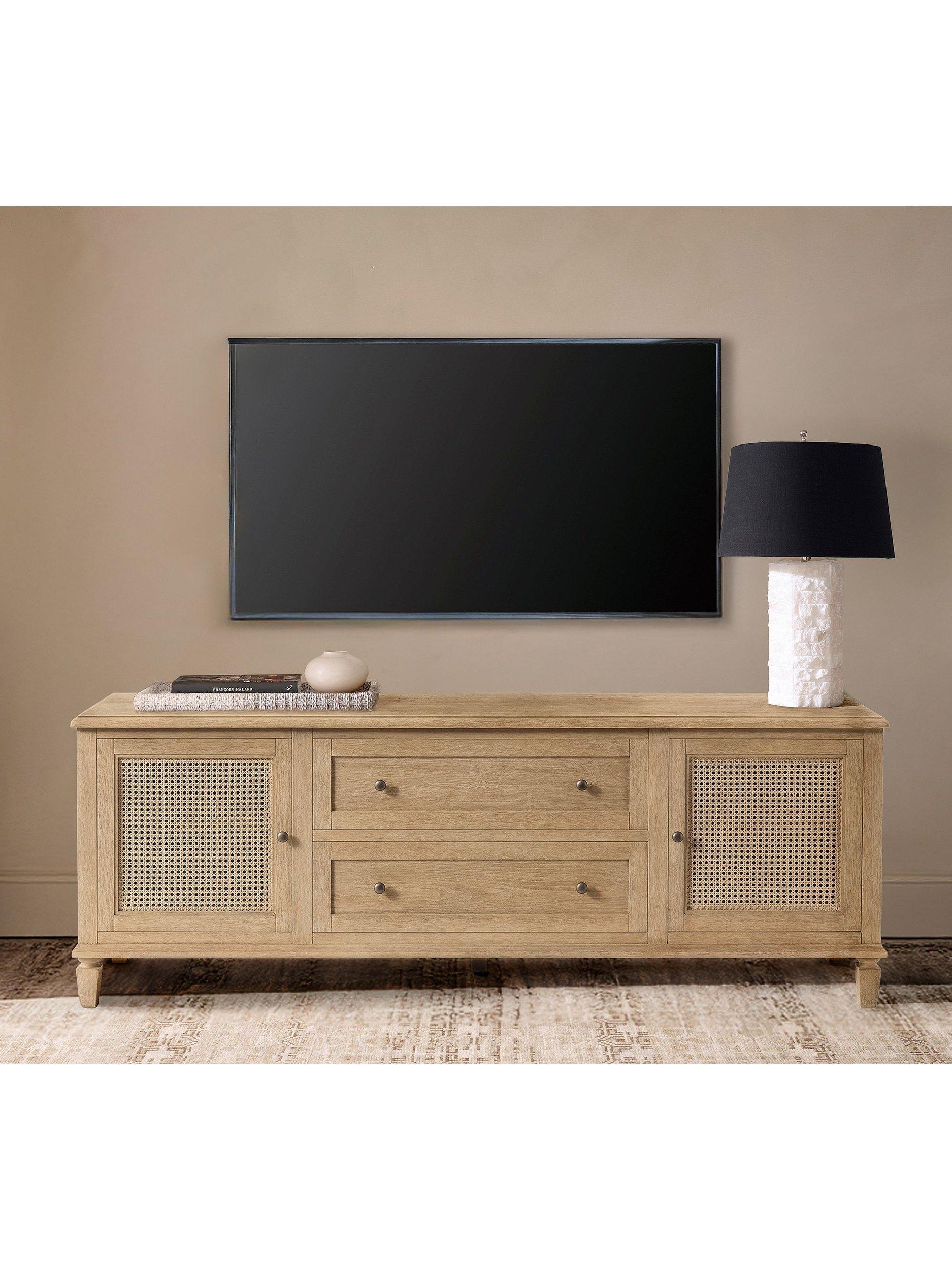 This media console features two adjustable shelves, six cut outs on the back panel and two spacious drawers for storage. It can accommodate a TV up to a 67" weighing up to 36.3 kg