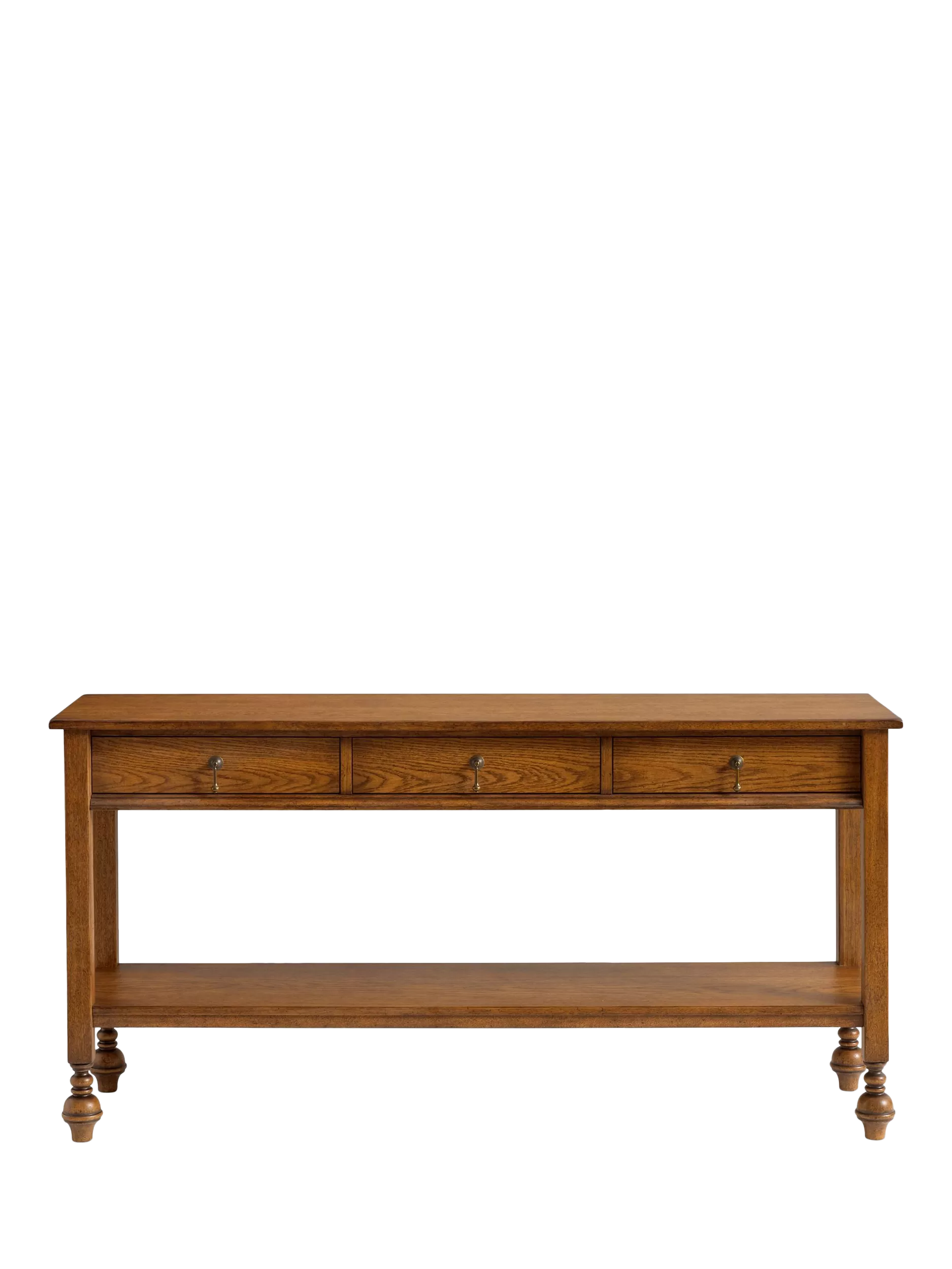- - Top: 2 cm th - Shelf: 147 cm w x 38 cm d x 4 cm th - Drawer Exterior (3): 46 cm w- x 10 cm h - Drawer Interior: 41 cm w x 25 cm d x 5 cm h - Legs: 8 cm sq - Distance between Legs: 135 cm at front/back; 25 cm at sides - Floor Clearance: 20 cm - Weight Capacity: 110 kg - Weight: 33 kg