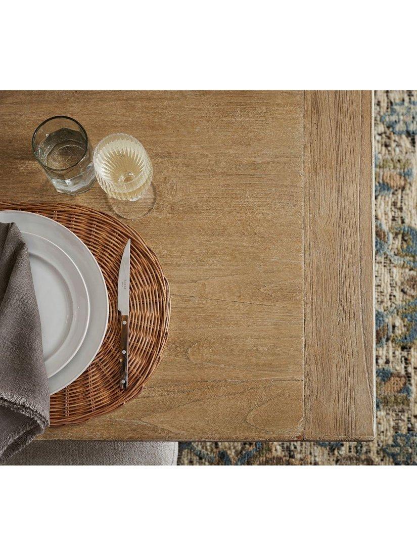 This dining table is treated with an exclusive Seadrift finish, achieved through a proprietary multi-step process that creates exceptional depth of colour. Adding to its distinct salvaged appearance, the surface is meticulously hand-planed, intentionally showcasing small visible dents and carvings. This careful process gives the furniture the genuine, rustic look of salvaged lumber, making each piece feel storied and unique.