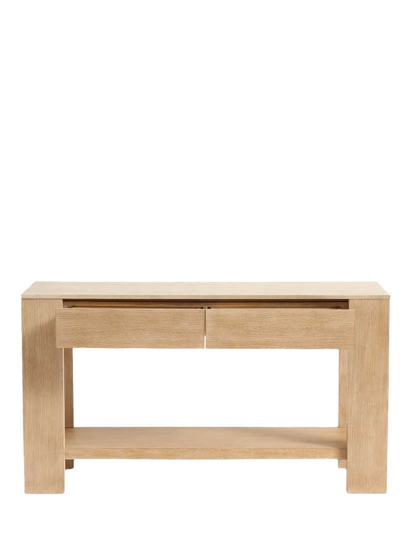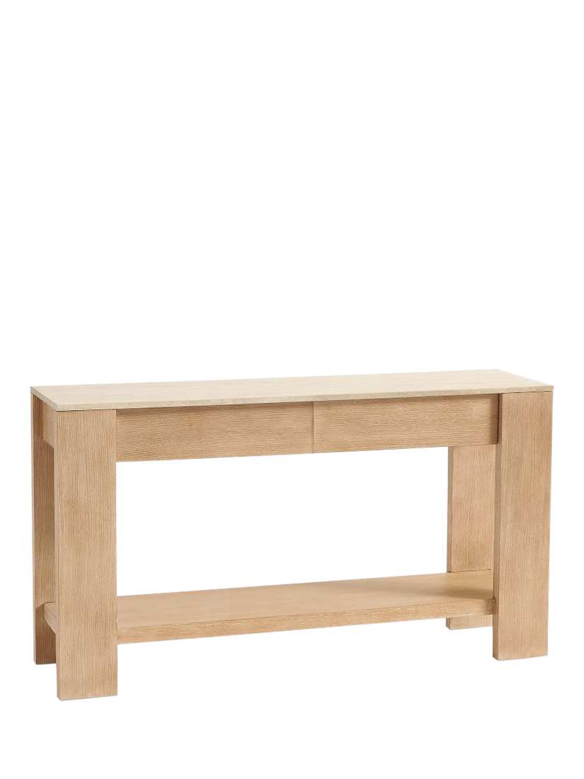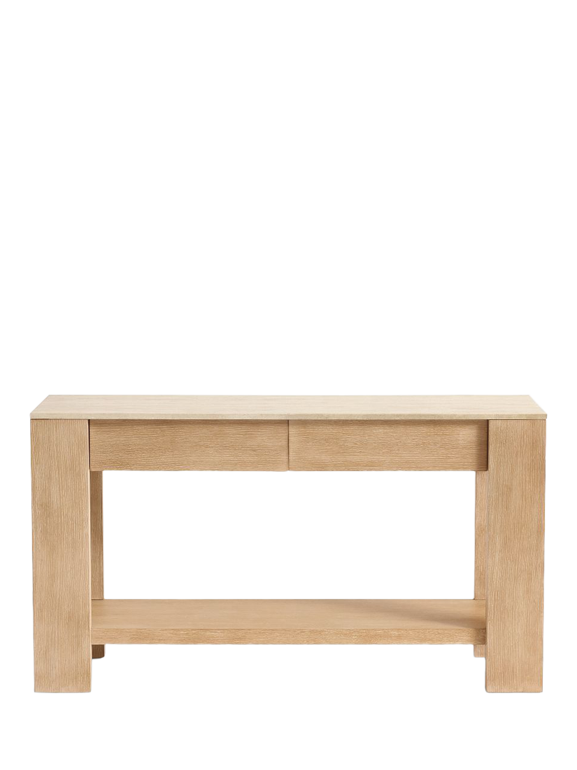 Expertly crafted from solid oak wood, mango wood, oak veneers, travertine stone and MDF it has one fixed shelf and two drawers for storage. Adjustable levellers provide stability on uneven surfaces.