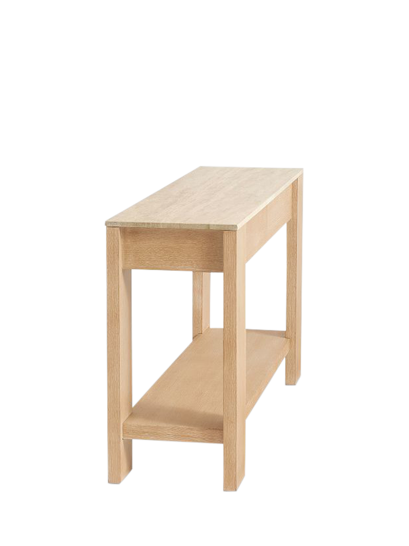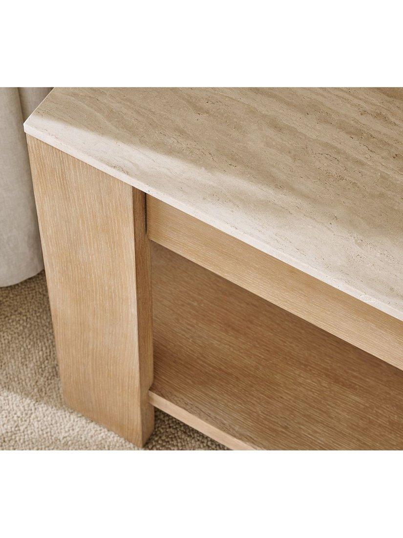 - Solid oak wood, mango wood, oak veneers. Top: Travertine stone.