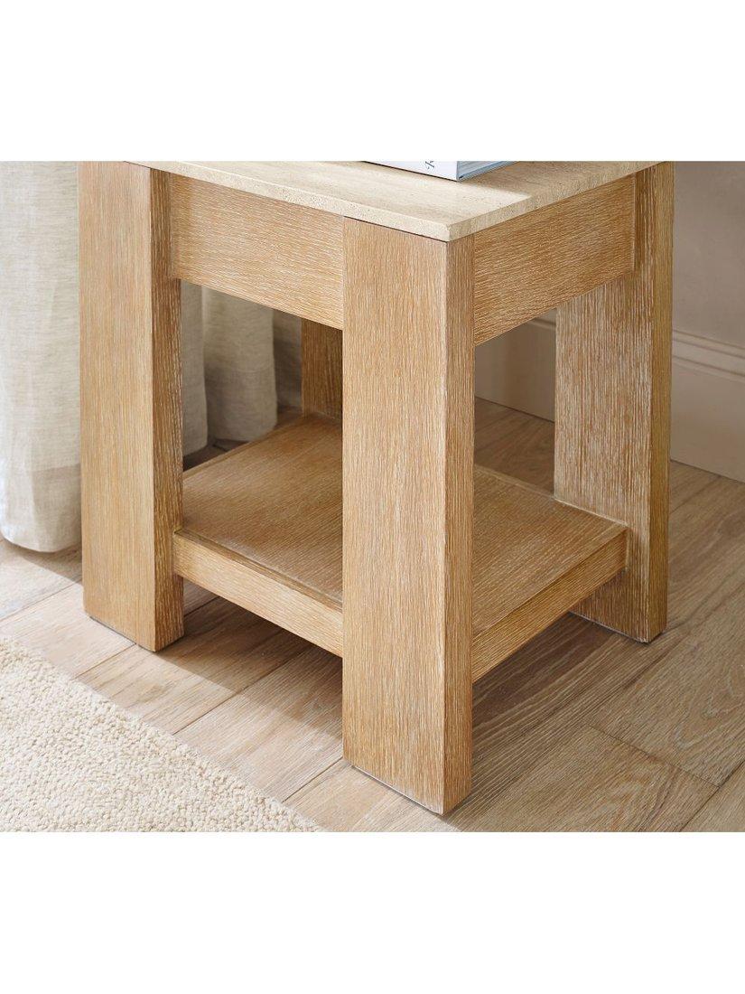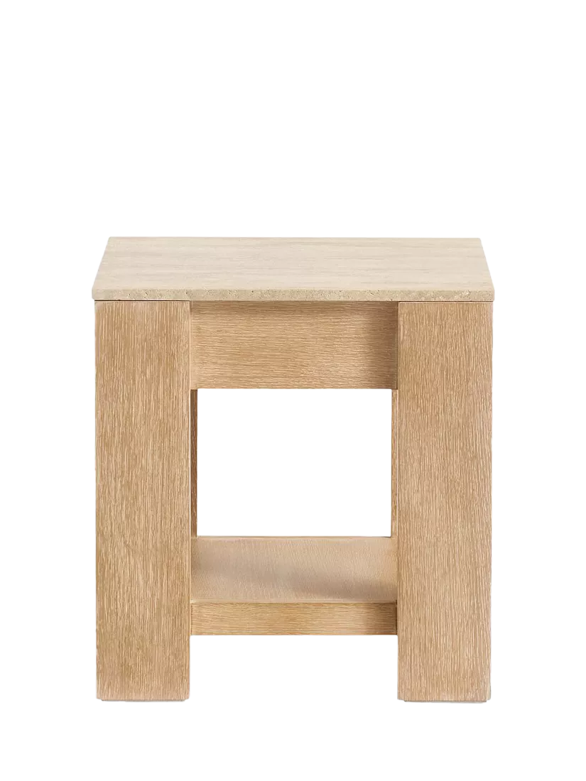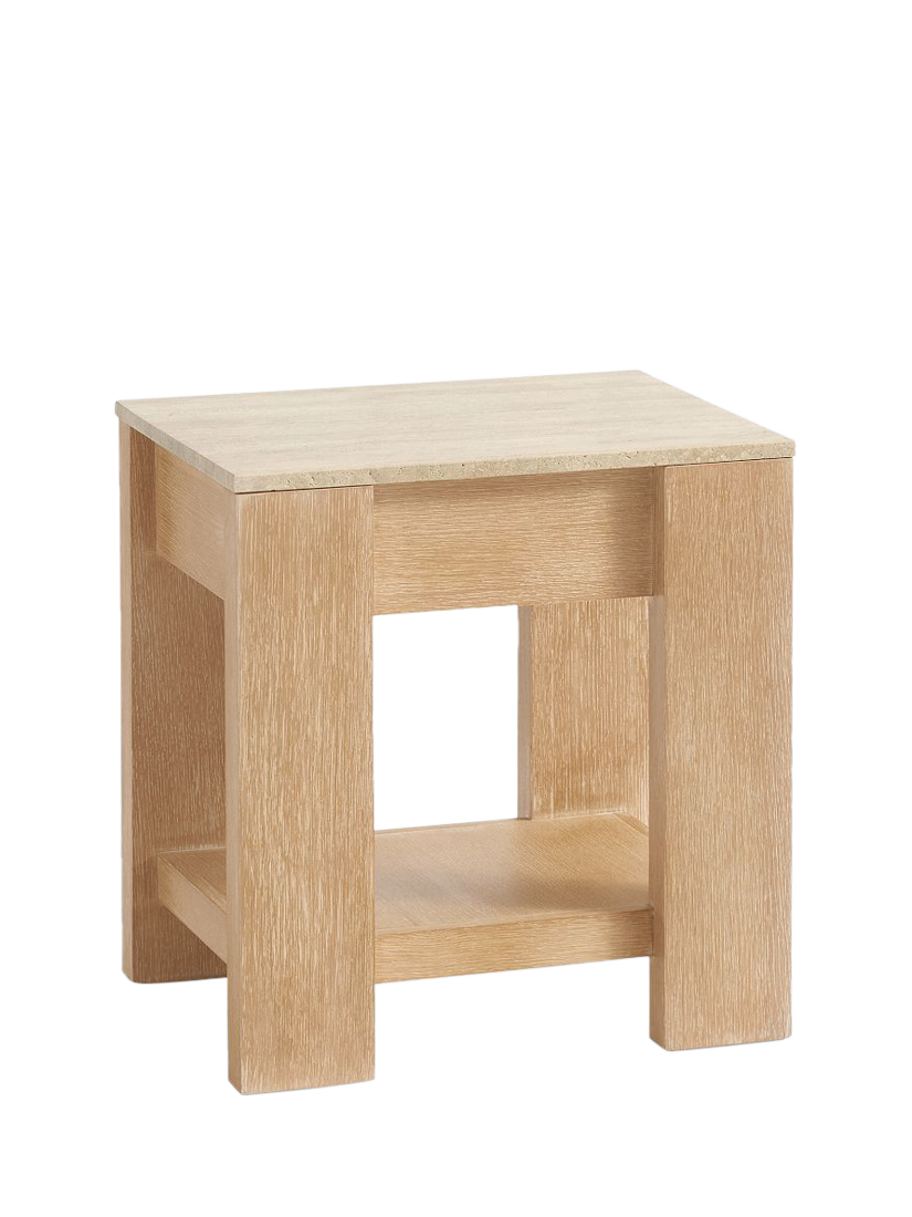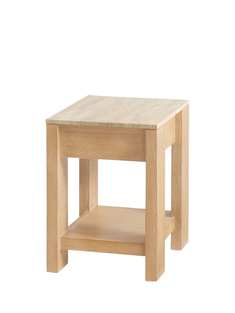 - Solid oak wood, mango wood, oak veneers, travertine stone and MDF