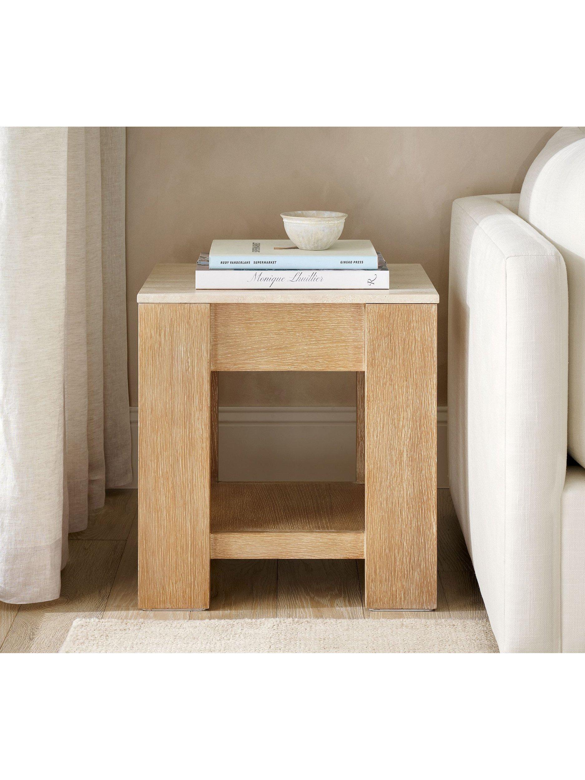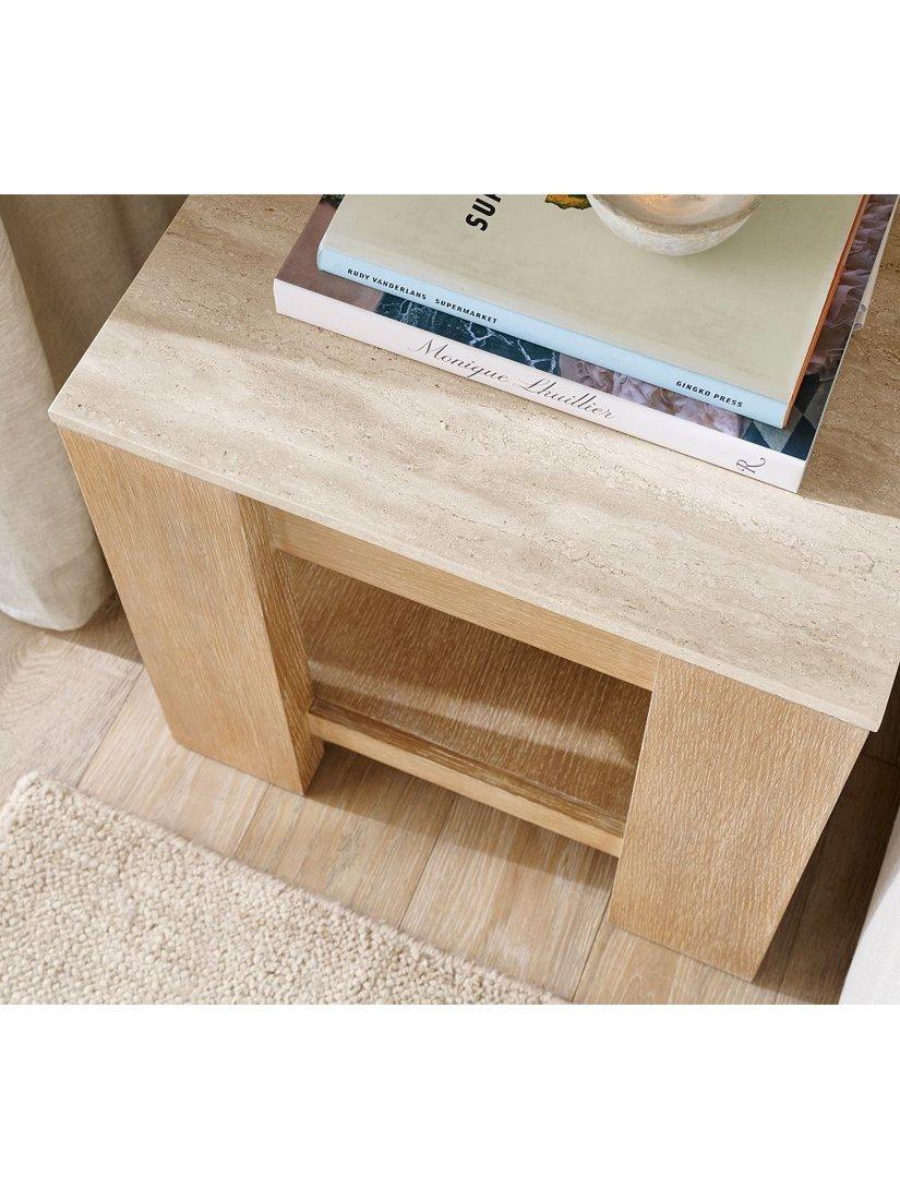 Equal parts rustic and modern, this table's mix of natural materials fits into a range of settings. Unique grain patterns in the wood and veining in the stone share affinities and give each piece one-of-a-kind quality, adding a rich, organic look to clean-lined silhouettes. It features one fixed shelf for storage.