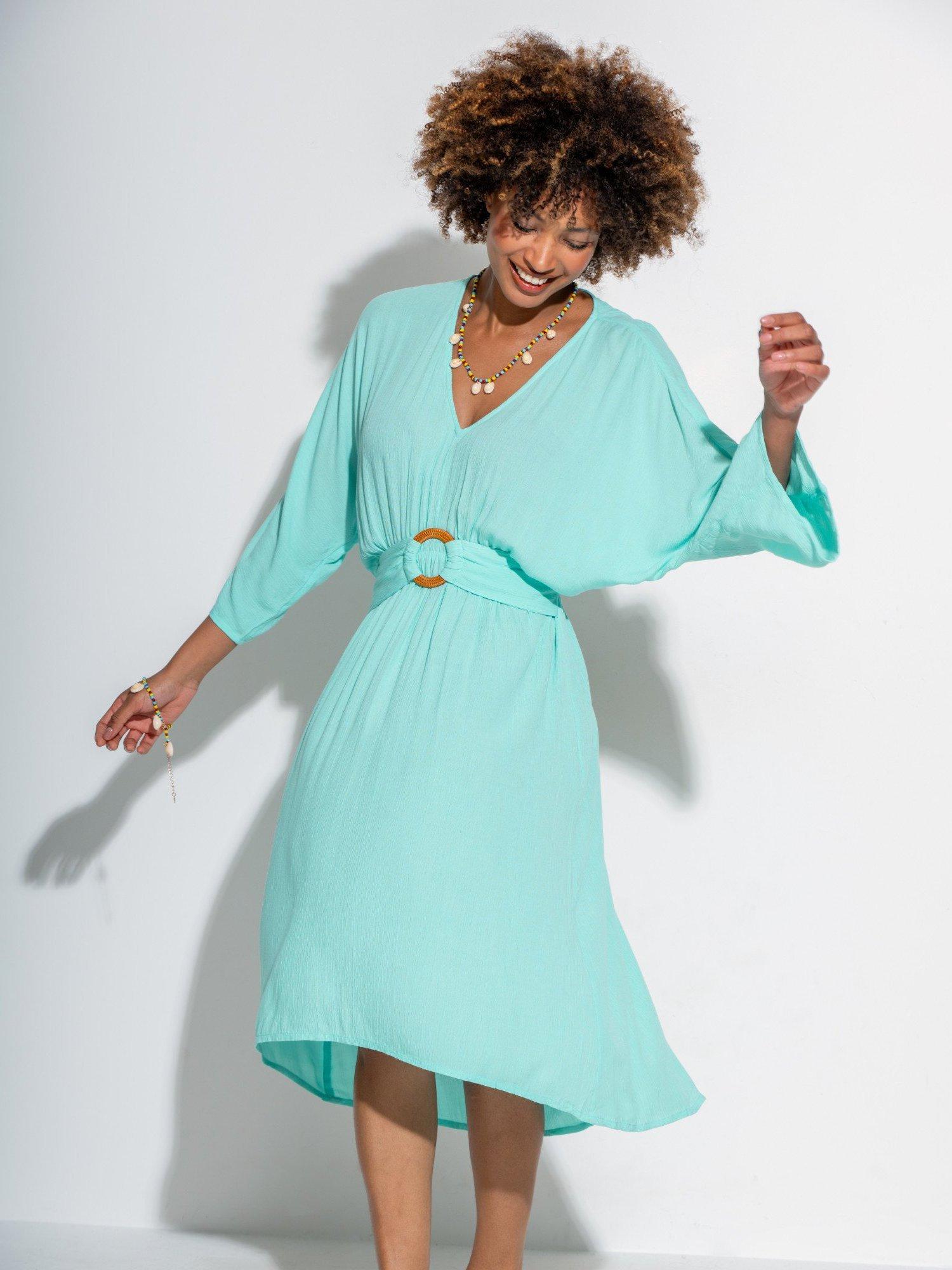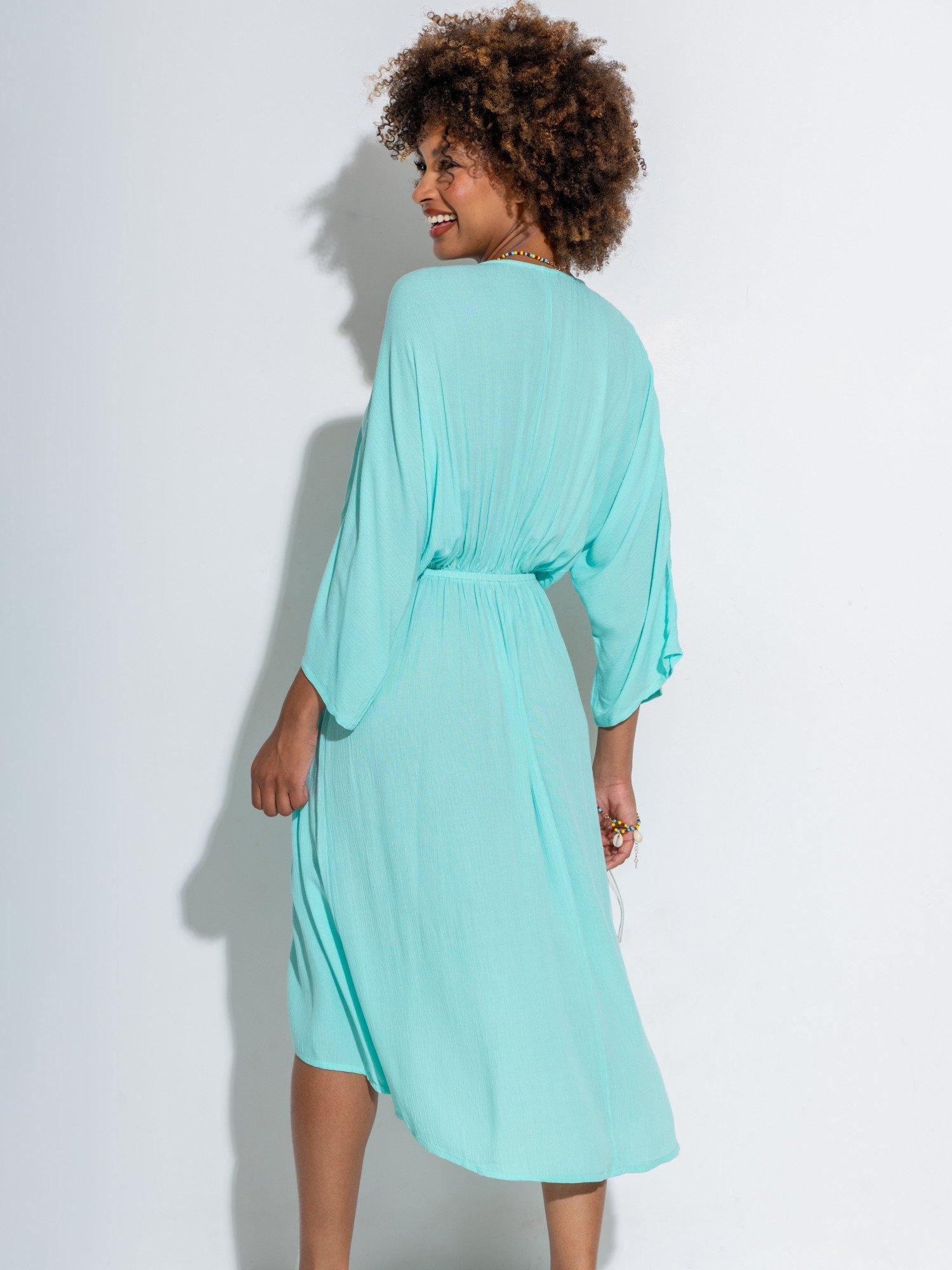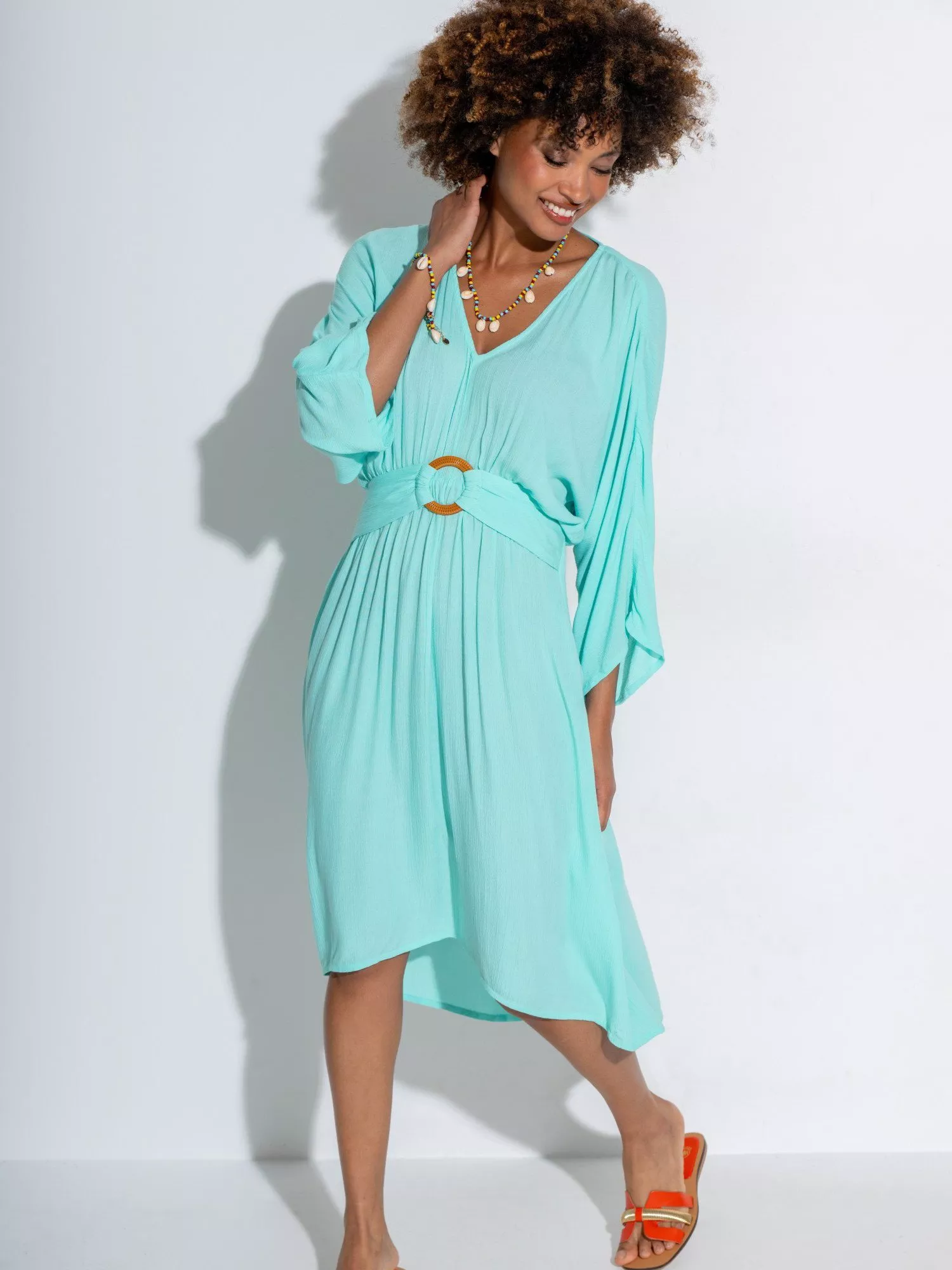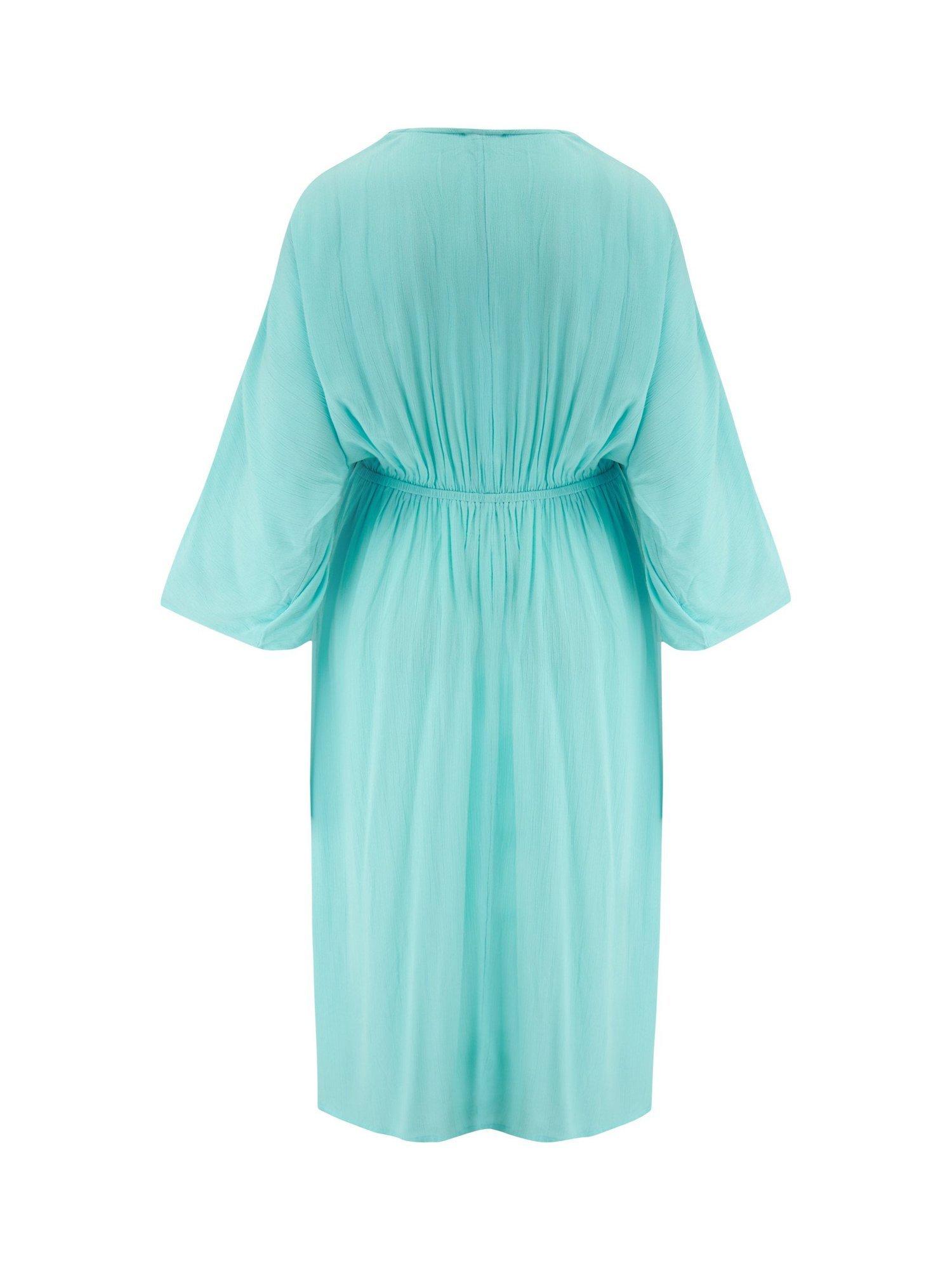 Featuring a V-neckline and floaty sleeves, this kaftan made from crinkle texture fabric drapes beautifully for a relaxed, yet stylish look. With an elasticated waistband for a comfortable and flattering fit, the standout feature of the Crinkle O-Ring Midi Beach Kaftan is textured wood effect O-ring detail that adds a touch of bohemian charm to this must-have beachwear style.