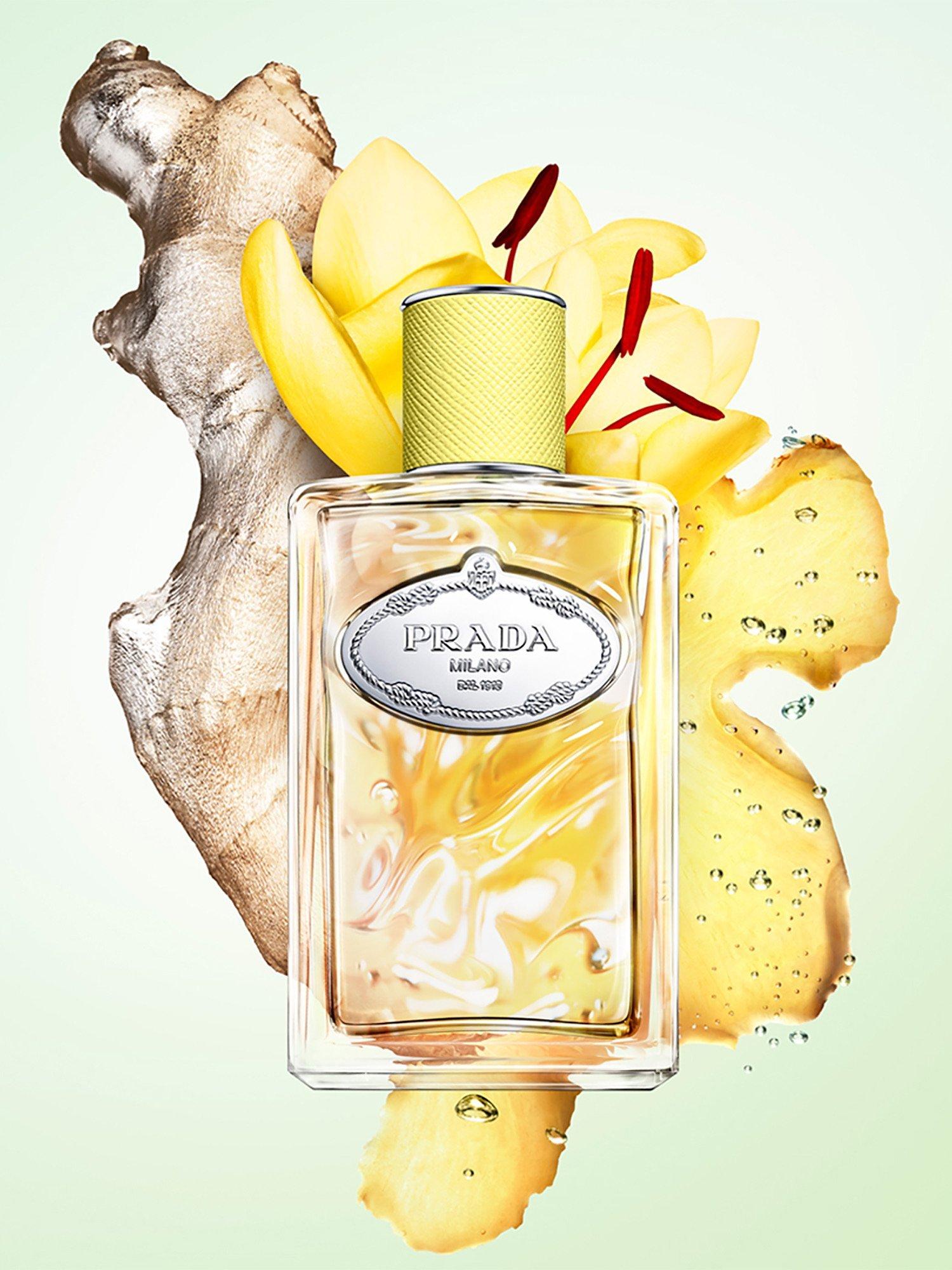 The luxurious bottle of Infusion de Gingembre is highlighted in a yellow-tinted hue, evoking the fusion of the signature ingredient in the fragrance. The light-yellow cap in iconic Saffiano symbolises the ginger and the liveliness of the fragrance.