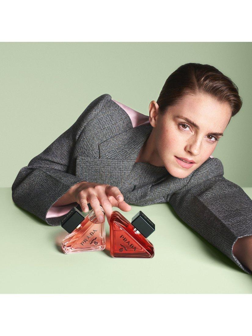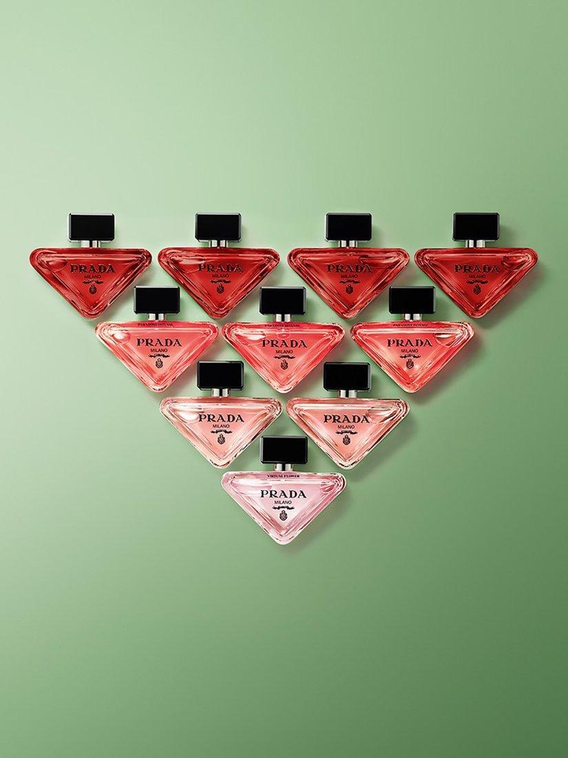 Like the original fragrance, its renewed bottle is an expression of the House’s essence of reinvention. In a shift from traditional perfume bottle architecture, the flacon is minimal and delicate at first glance, inspired by the original iconic Prada triangle logo, disruptively designed to rest on its side. The Prada coat of arms logo contrasts with the sophisticated deep pink lacquering of the bottle. Paradoxe Radical Essence outer box is etched to echo the brand’s signature Saffiano leather cross-hatching. An interplay of the fragrance’s pink signature and the black Prada logo, twisting the Paradoxe labels in black to reflect the maximal intensity of this Radical Essence.