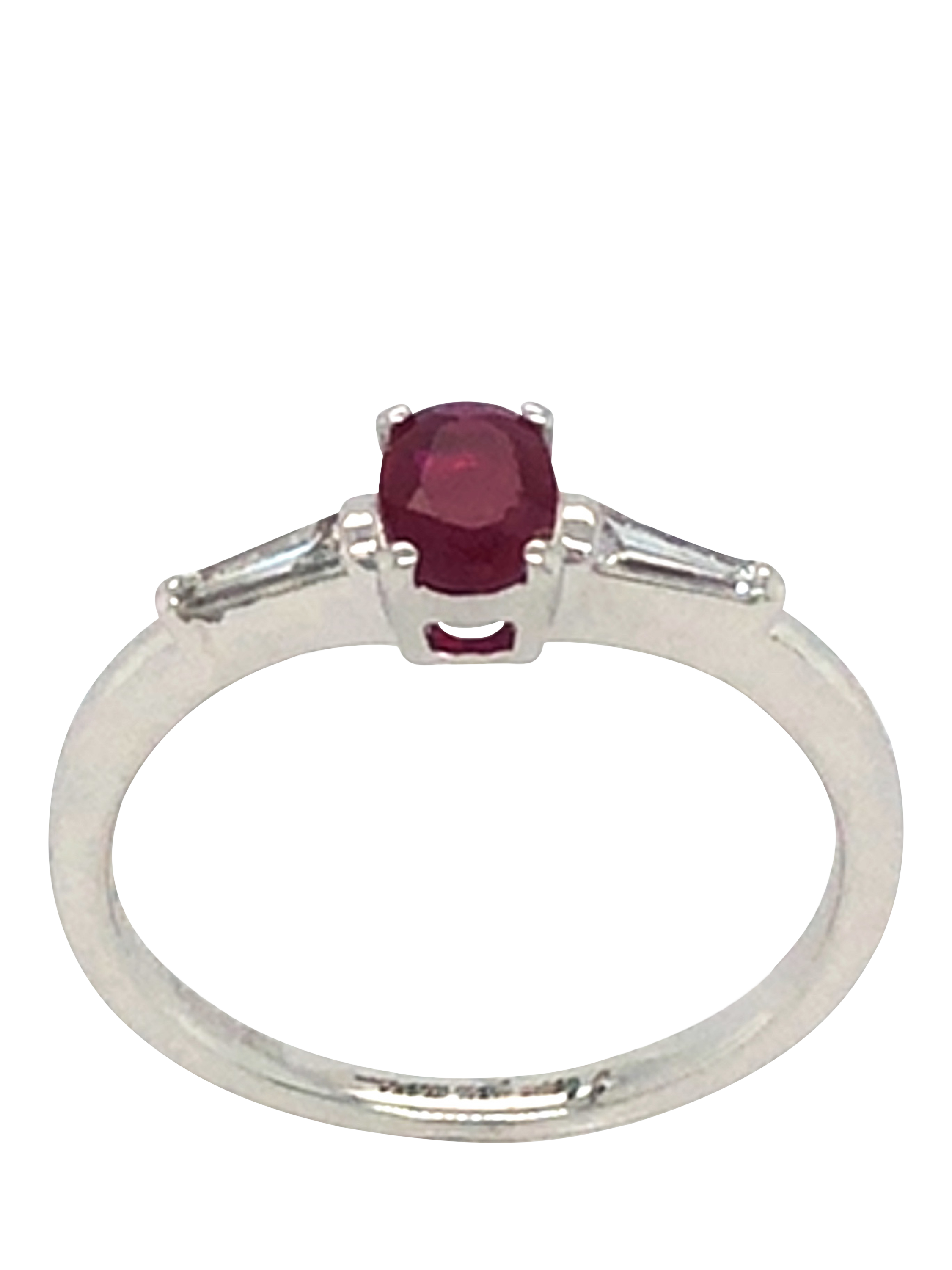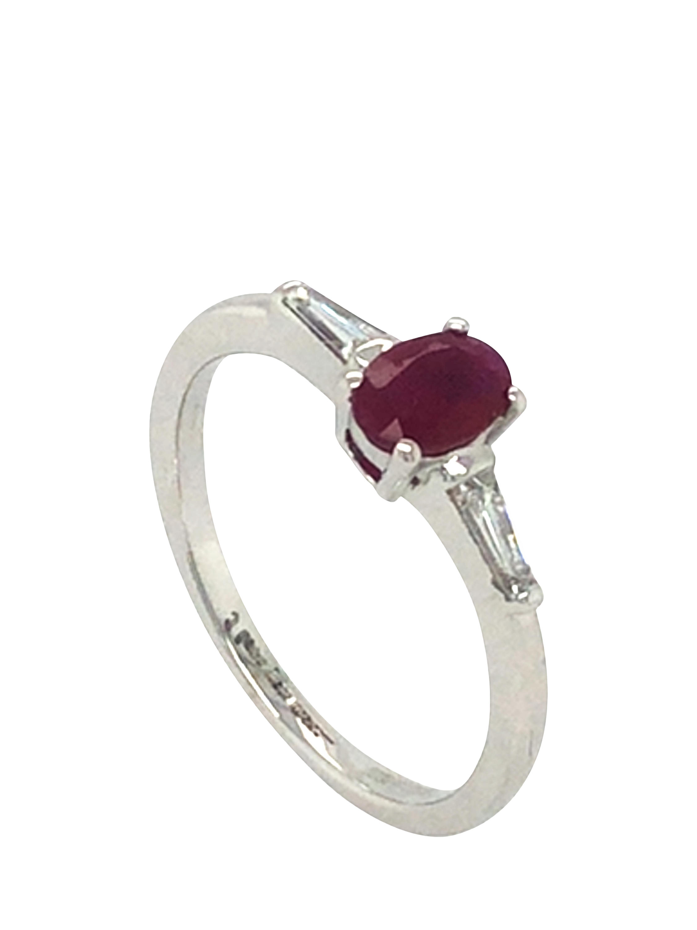 Pre-loved 18ct white gold single-stone oval ruby ring, set alongside tapered baguette-cut diamond shoulders. Total ruby weight is appx. 0.60cts, and total diamond weight is 0.20cts. Presented by Vintage Fine Jewellery. Total weight is 2.4gms. UK size L.