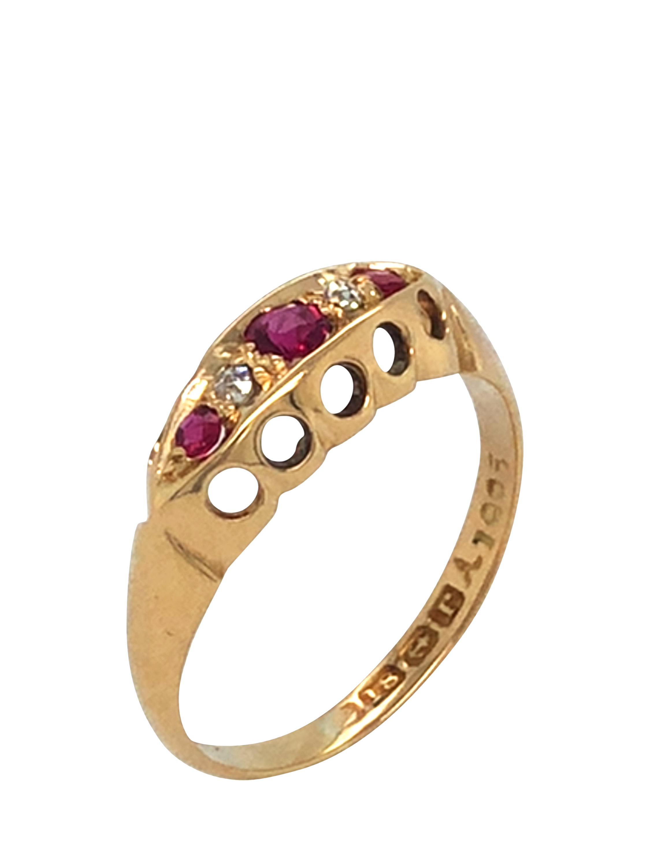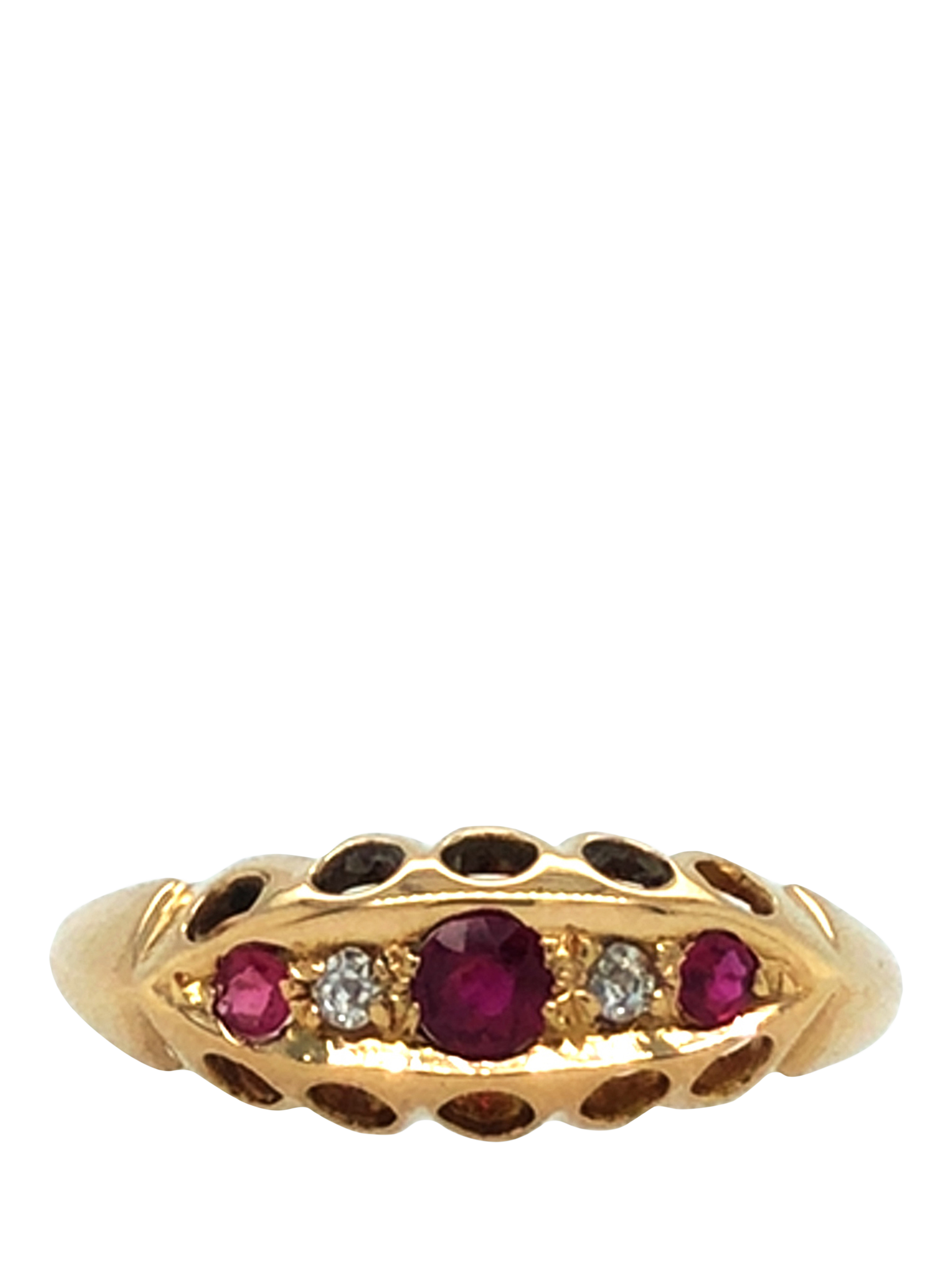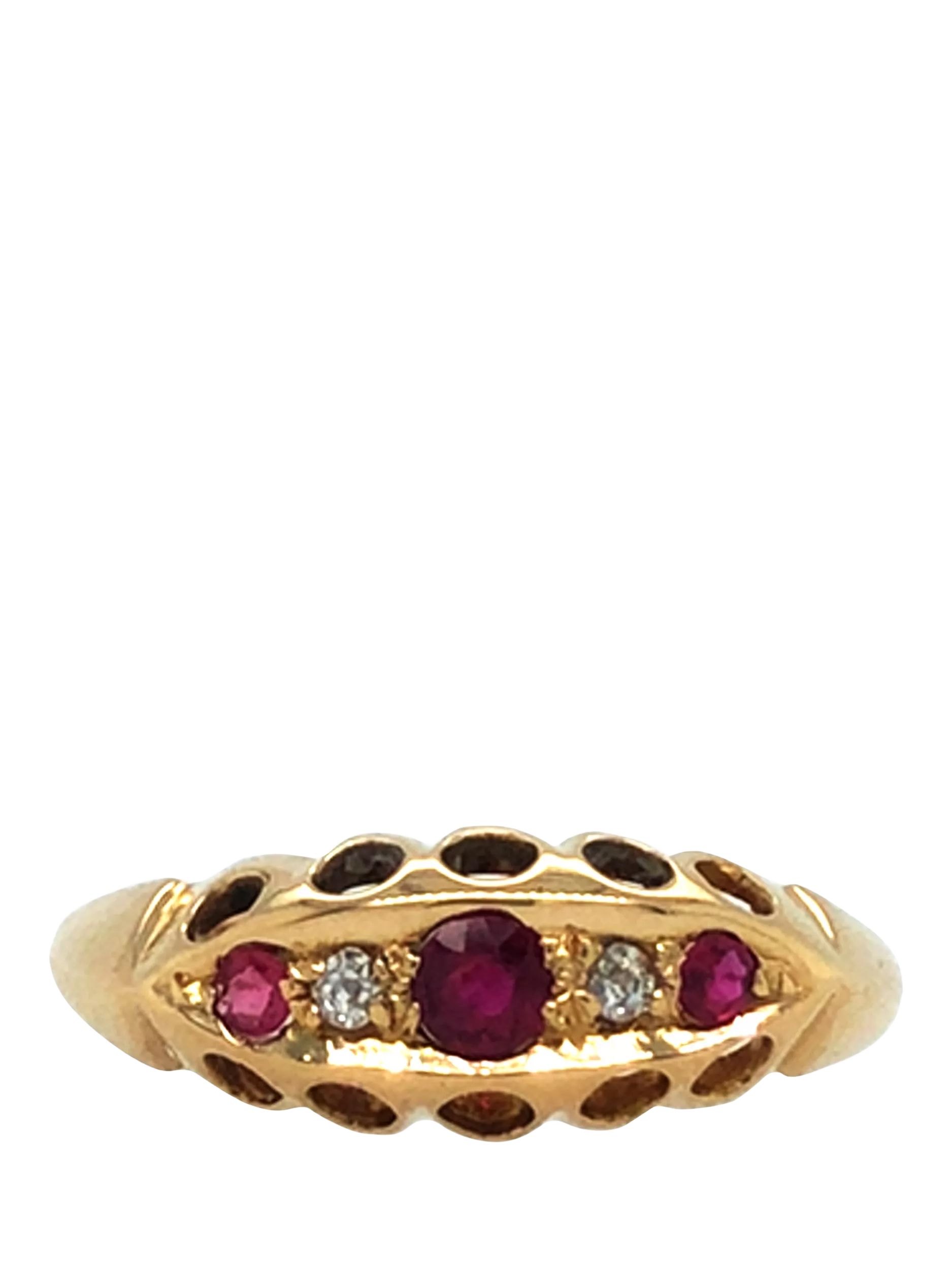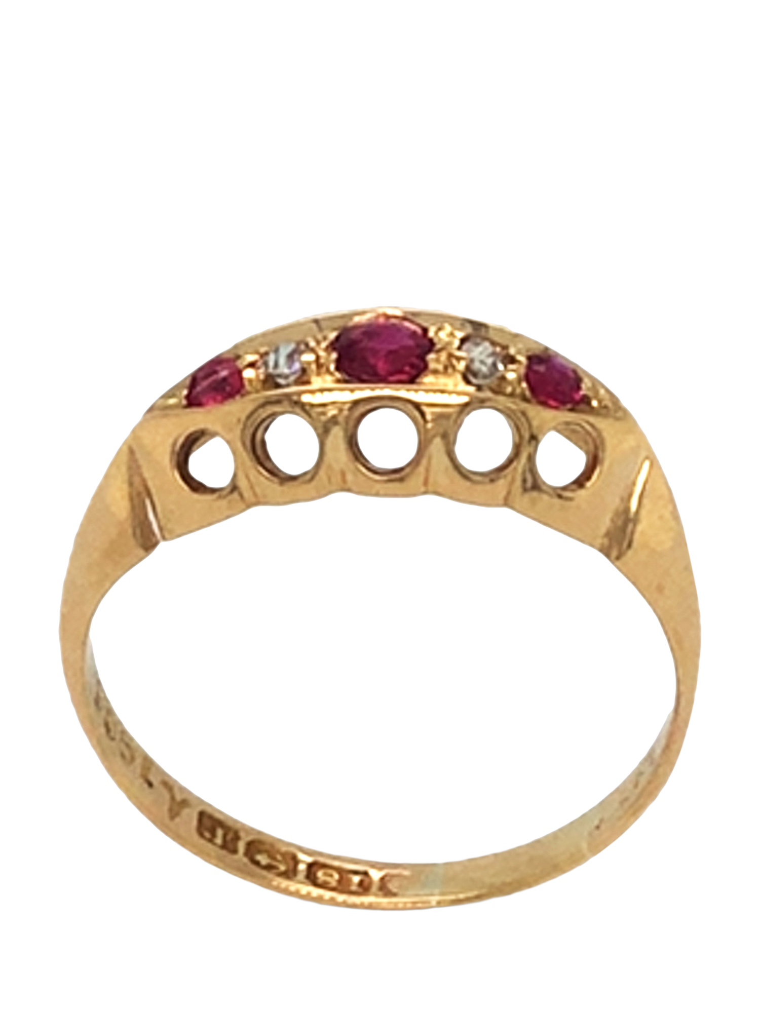Pre-loved 18ct yellow gold 5-stone diamond and ruby ring, dated Birmingham 1916. Presented by Vintage Fine Jewellery. Total diamond weight is appx. 0.03cts, total ruby weight is appx. 0.17cts. Total weight is 2.6gms. UK size O 1/2.