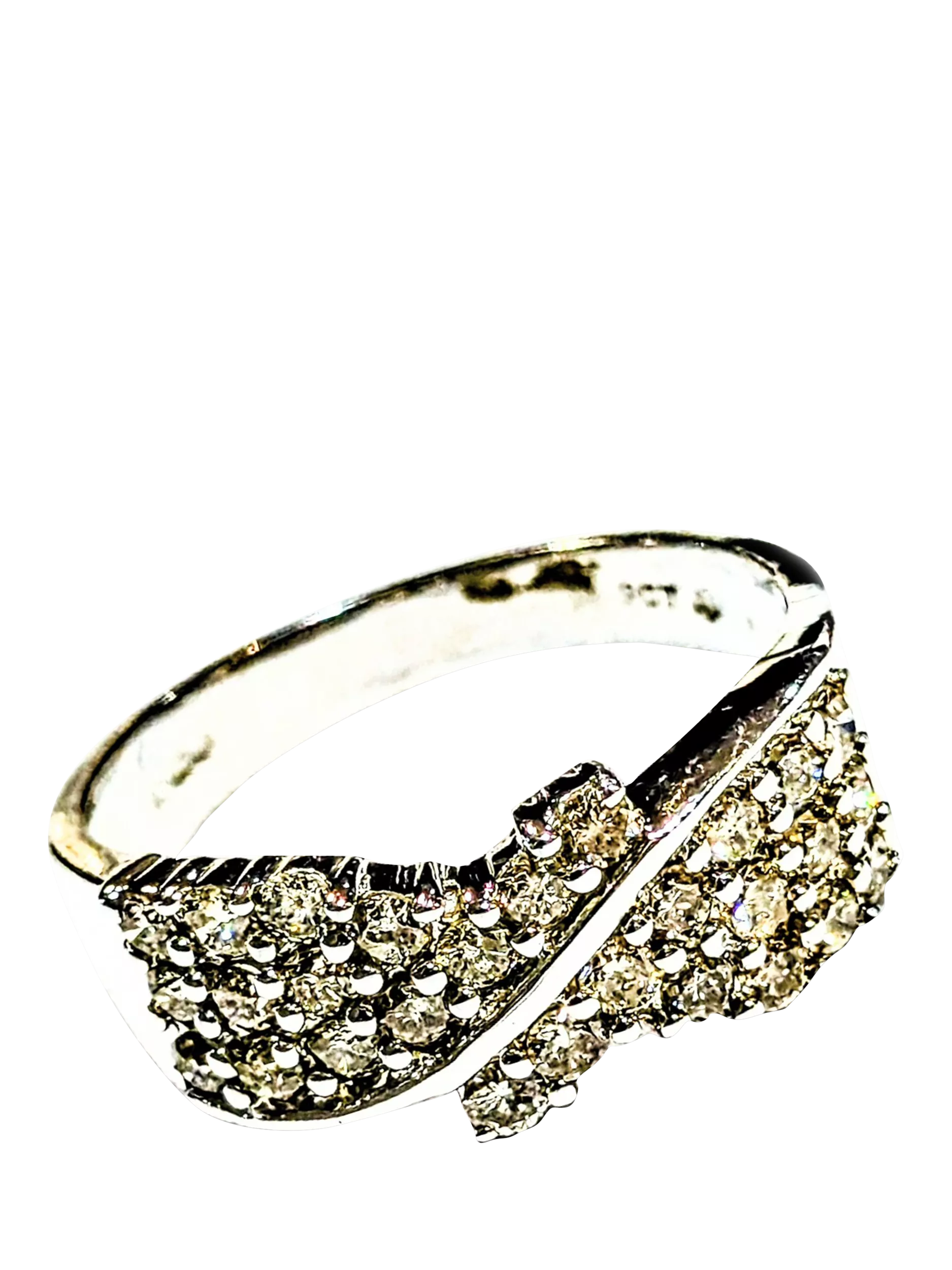 Pre-loved 9ct white gold crossover ring, set with approximately 0.75ct of diamonds. Gram weight is 3.53. UK size N. This piece is presented in a box, ready for gifting.