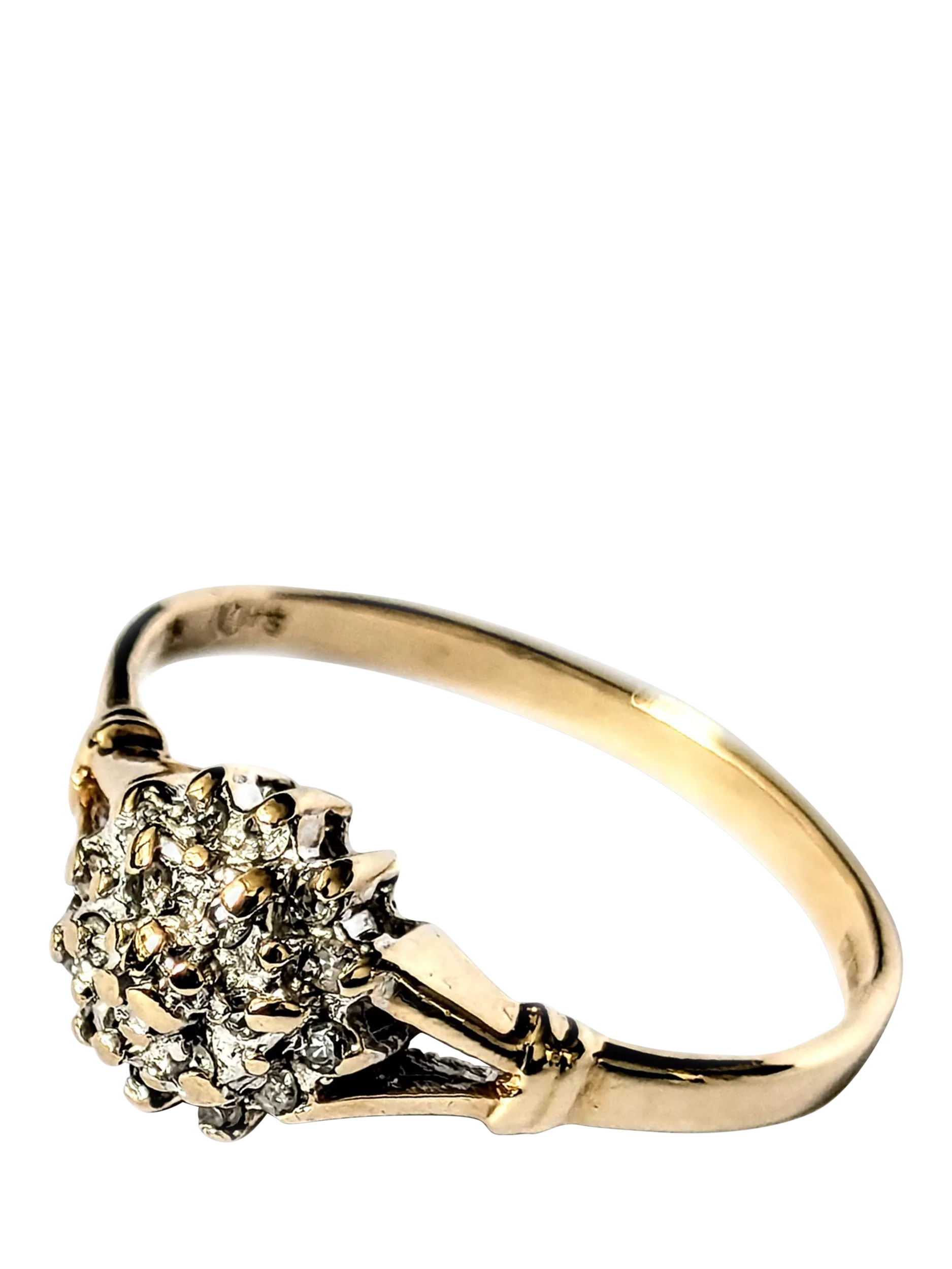 Pre-loved 9ct yellow gold diamond cluster ring. Approx Diamond is 0.10ct. From the Assay date stamp, we believe this item dates back to Circa 1998 making it 27 years old. Presented by L & T Heirlooms. Total weight is 1.59gms.