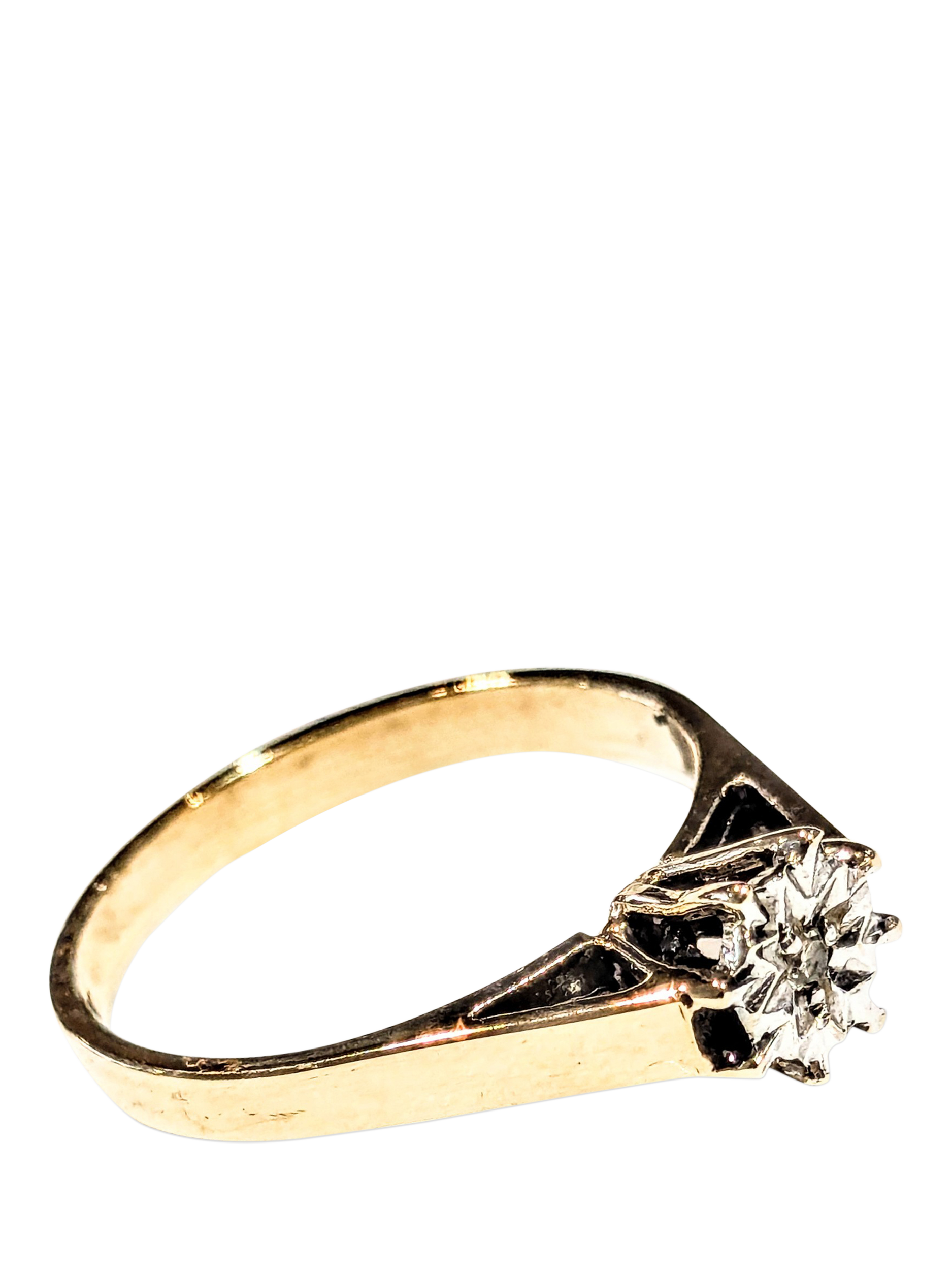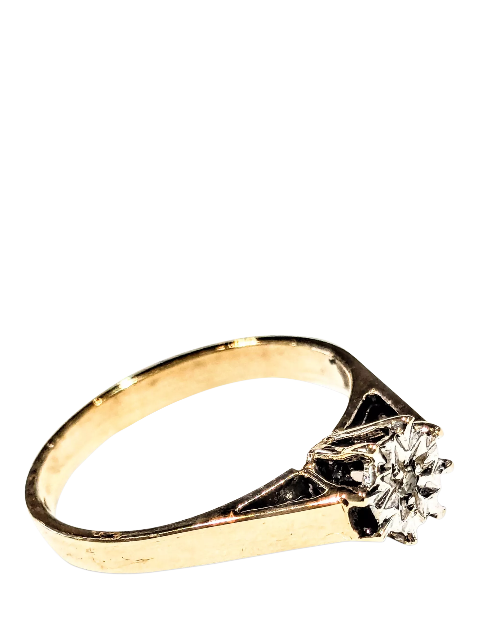 Pre-loved 9ct yellow gold diamond solitaire ring, presented by L&T Heirlooms. From the Assay date stamp, we believe this item dates back to Circa 1981, making it 44 years old. Diamond is approximately 0.015ct. Weight is 1.82gms. UK ring Size L. This piece is boxed, ready for gifting.