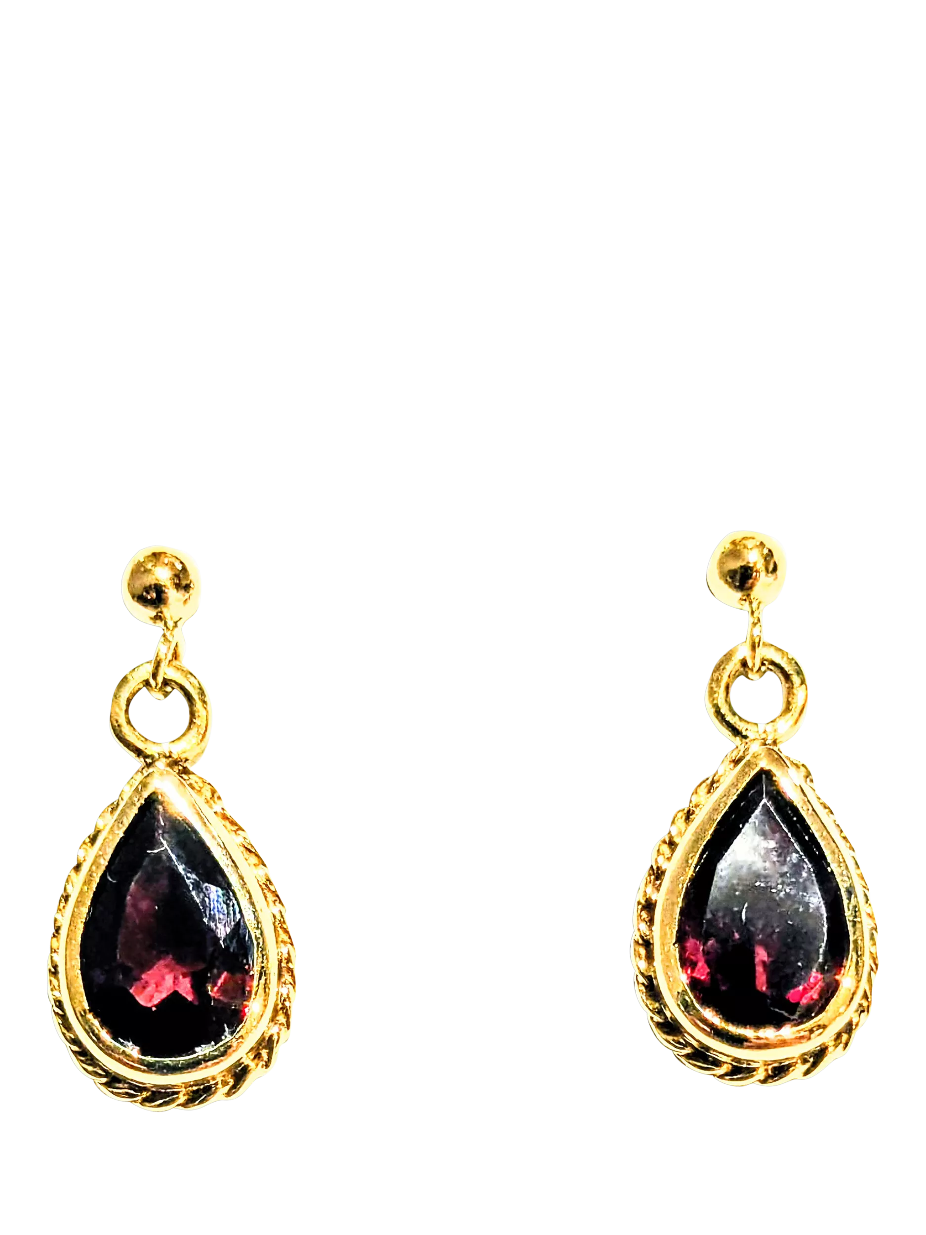 Pre-loved 9ct yellow gold Garnet dropper earrings, presented by L & T Heirlooms. Garnet is approx. 2.6cts. Suitable for pierced ears only. Gram weight is 2.55. This piece comes boxed, perfect for gifting.