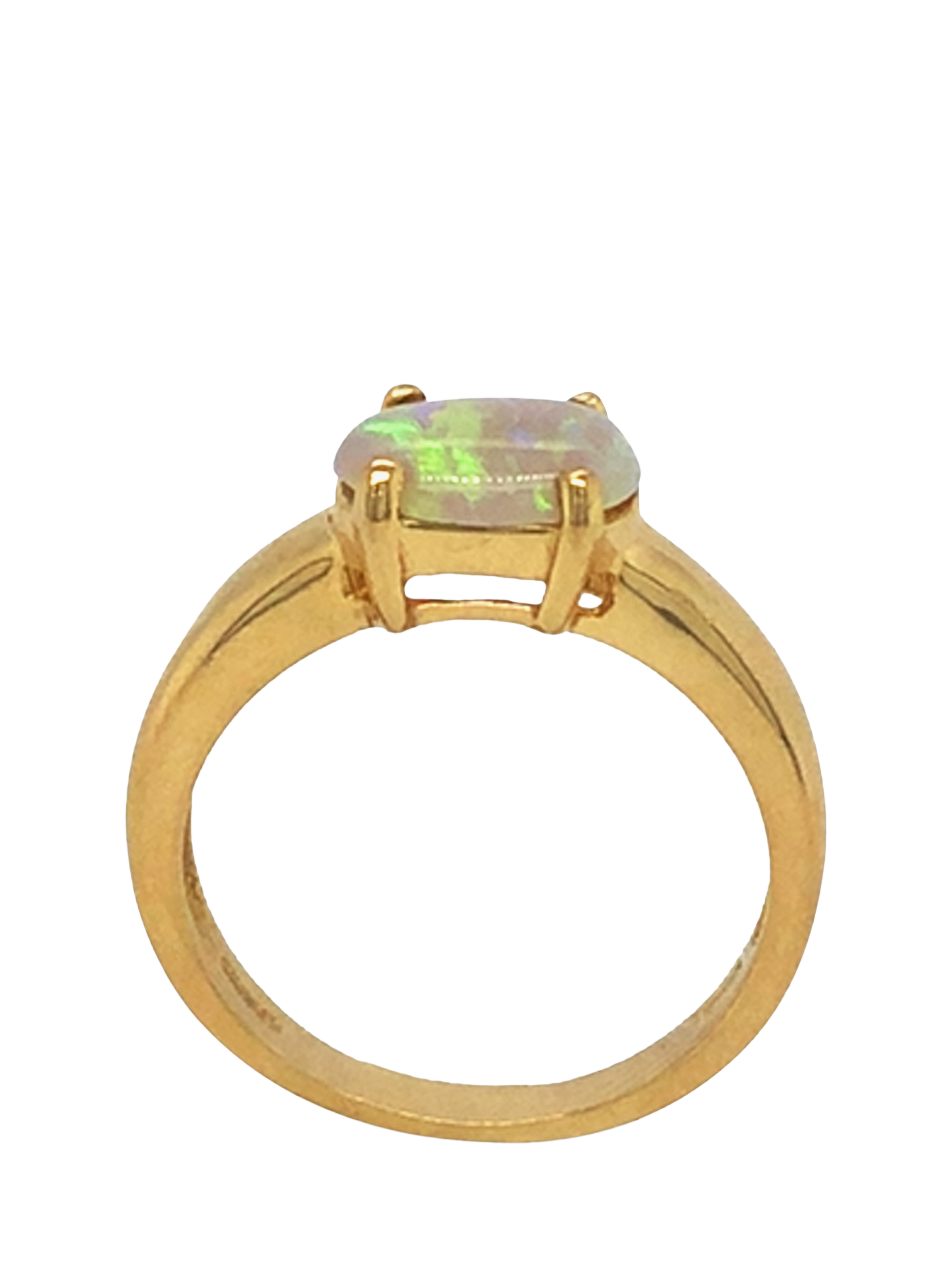 Pre-loved 9ct yellow gold single-stone oval opal claw-set ring, presented by Vintage Fine Jewellery. Total opal weight is appx. 0.83cts. Total weight is 3.5gms. UK size O.