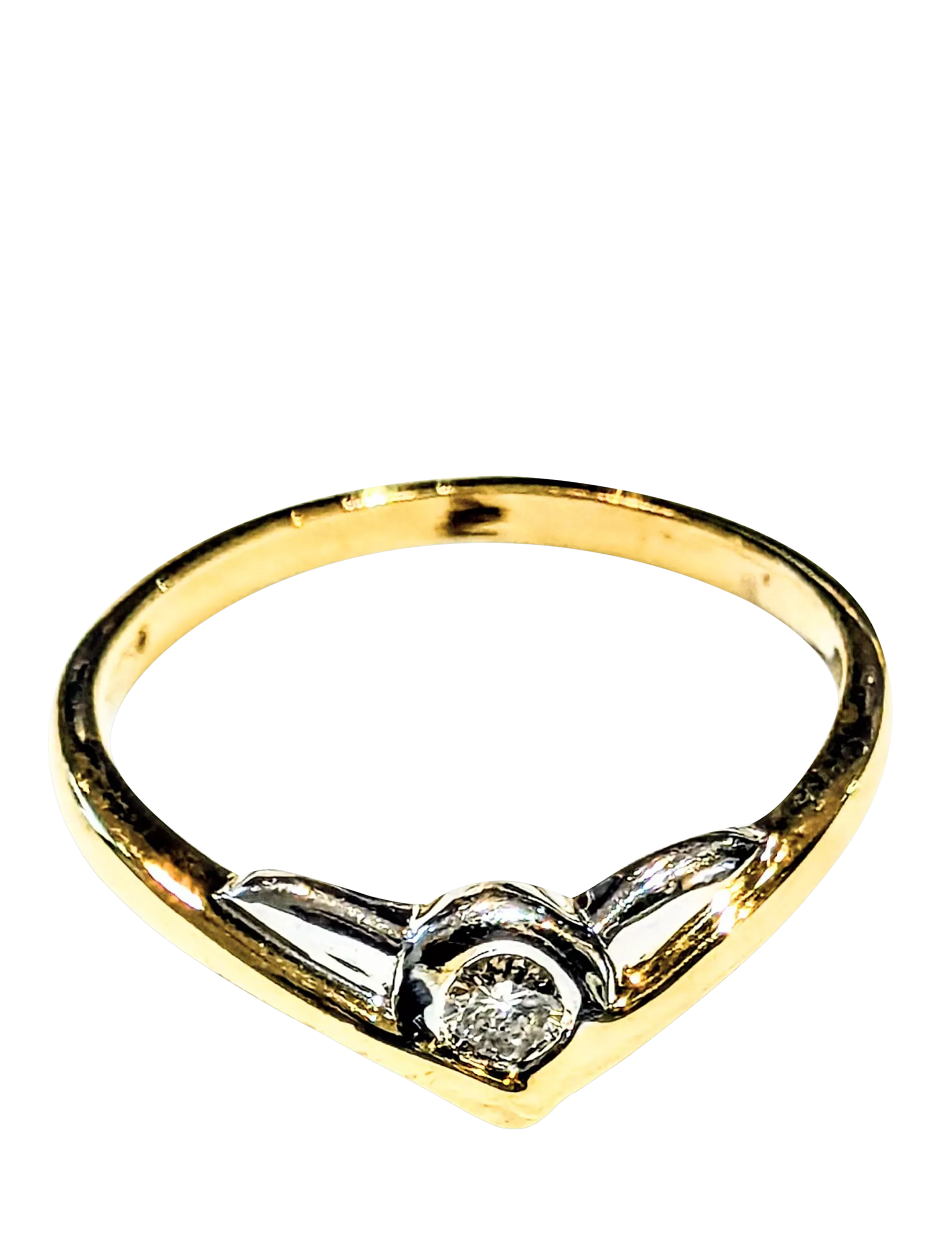 Pre-loved 9ct yellow gold Wishbone ring, set with an approx 0.10ct solitaire diamond. Presented by L&T Heirlooms. Weight is 1.48gms. UK size J. This piece comes boxed, perfect for gifting.