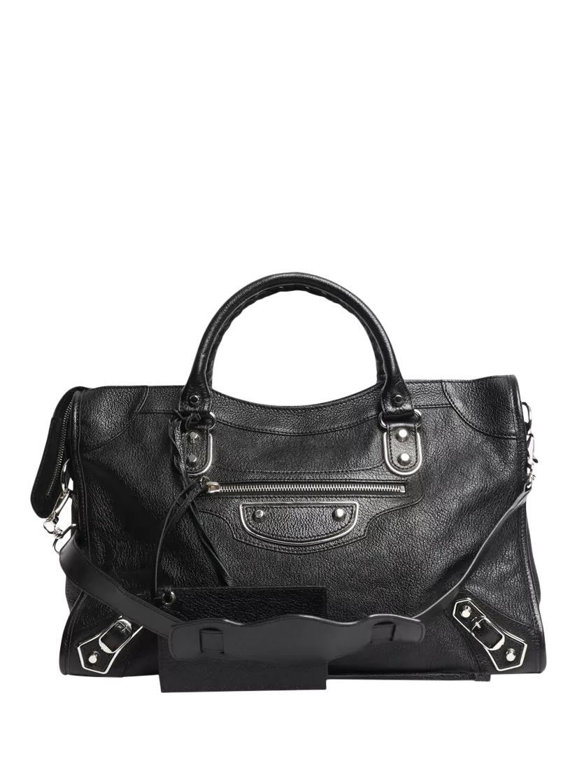 Pre-loved Balenciaga black medium Le City bag in leather with silver hardware. This bag has two braided handles and comes with a removable strap. This bag has a main zipped compartment with interior zipped and patch pockets. Outer zipped pocket at the front. Comes with mirror.|