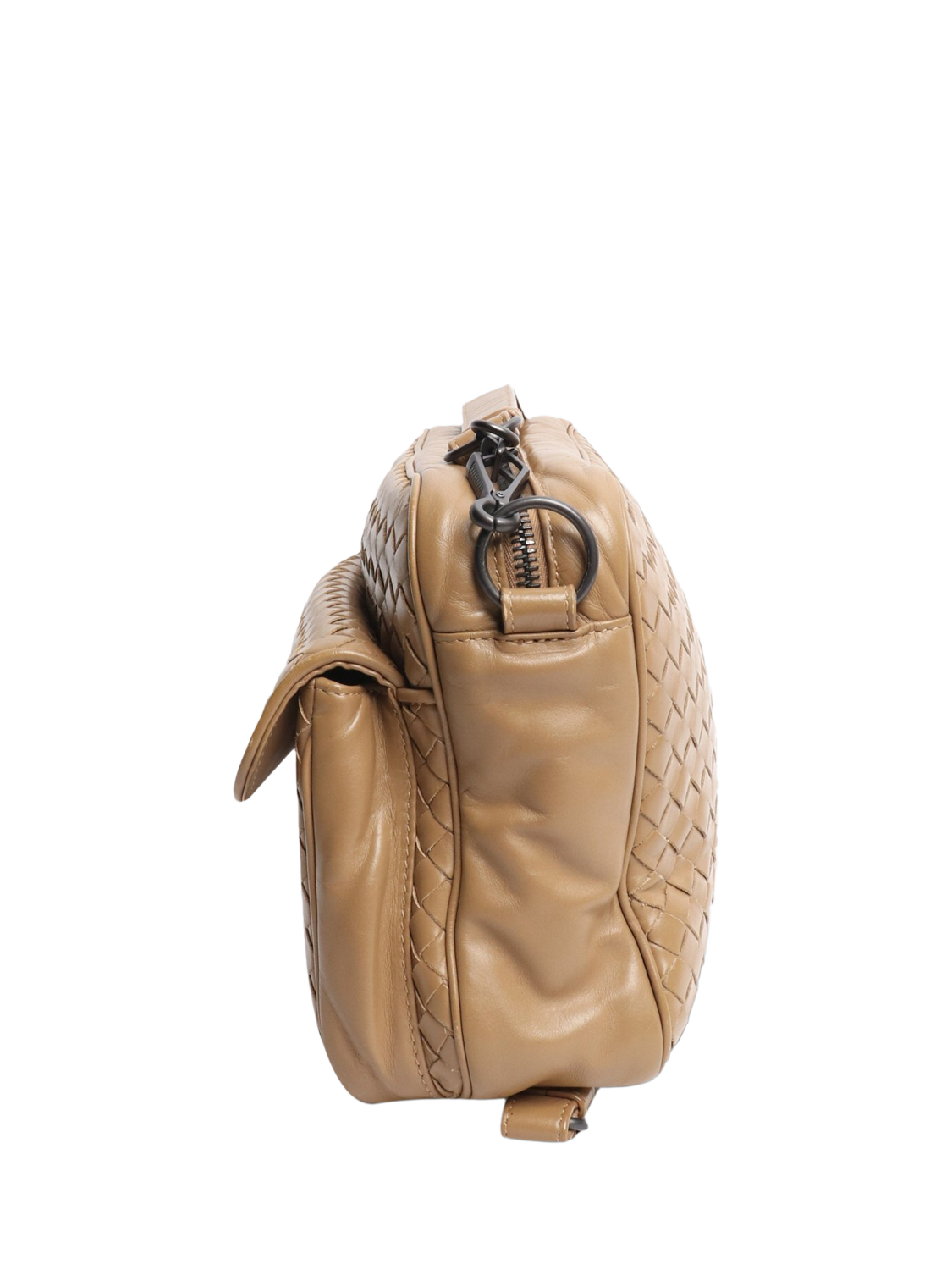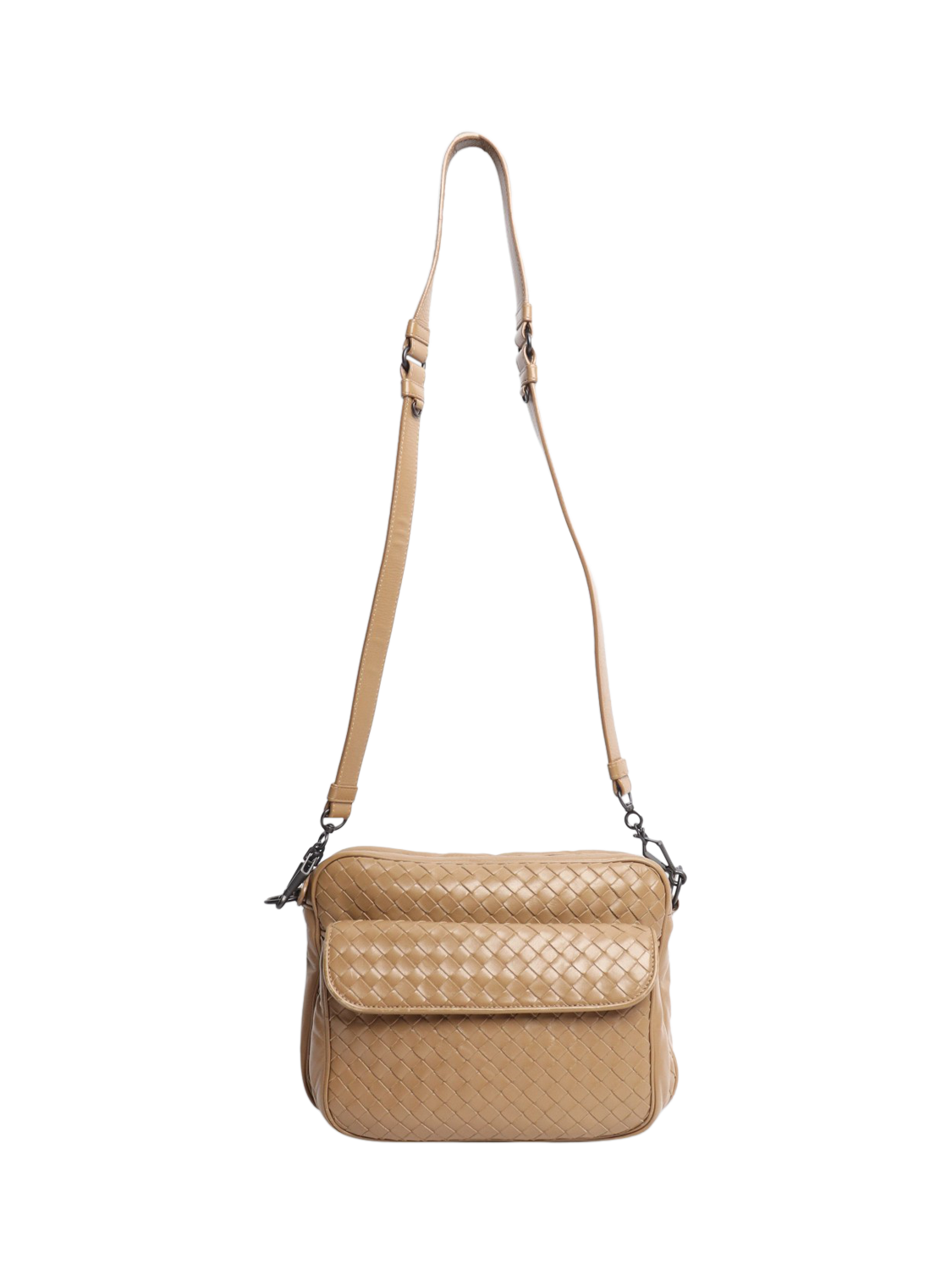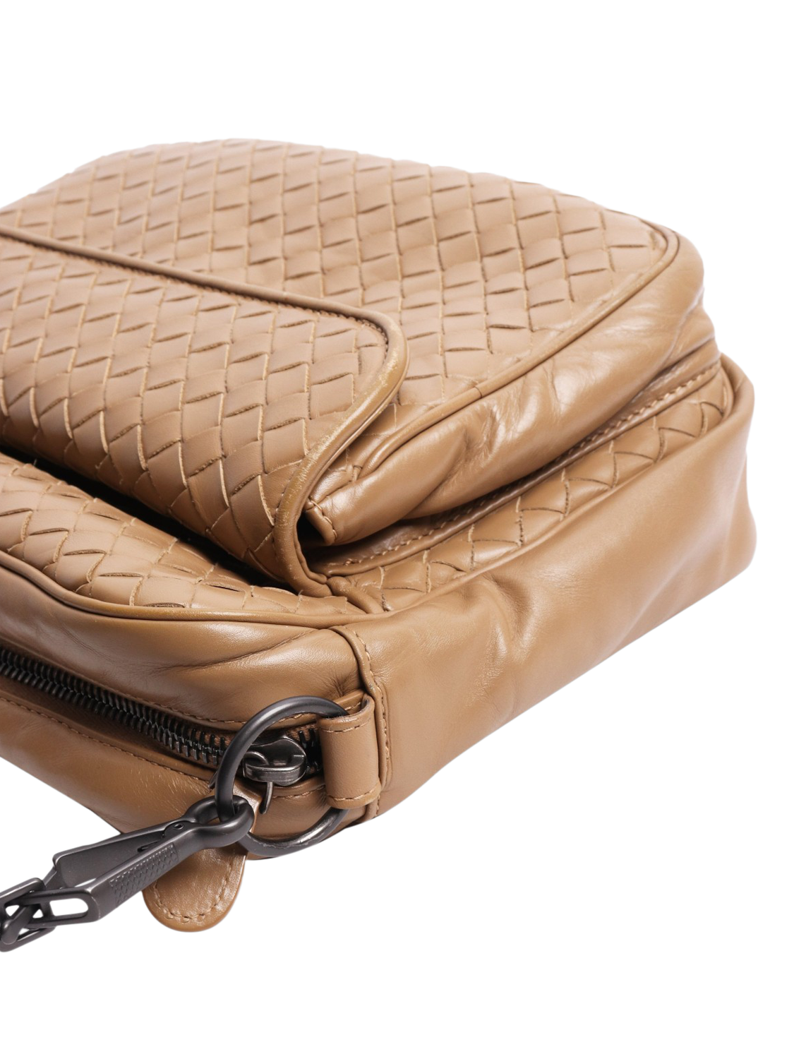 Pre-loved Bottega Veneta light brown interwoven camera bag with gunmetal hardware. This bag has a main compartment, a zippped pocket and a phone pocket. A magnetic closure pocket at the front.